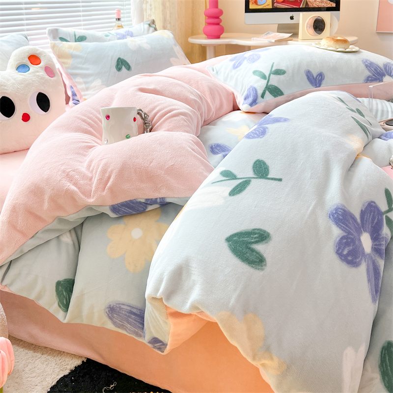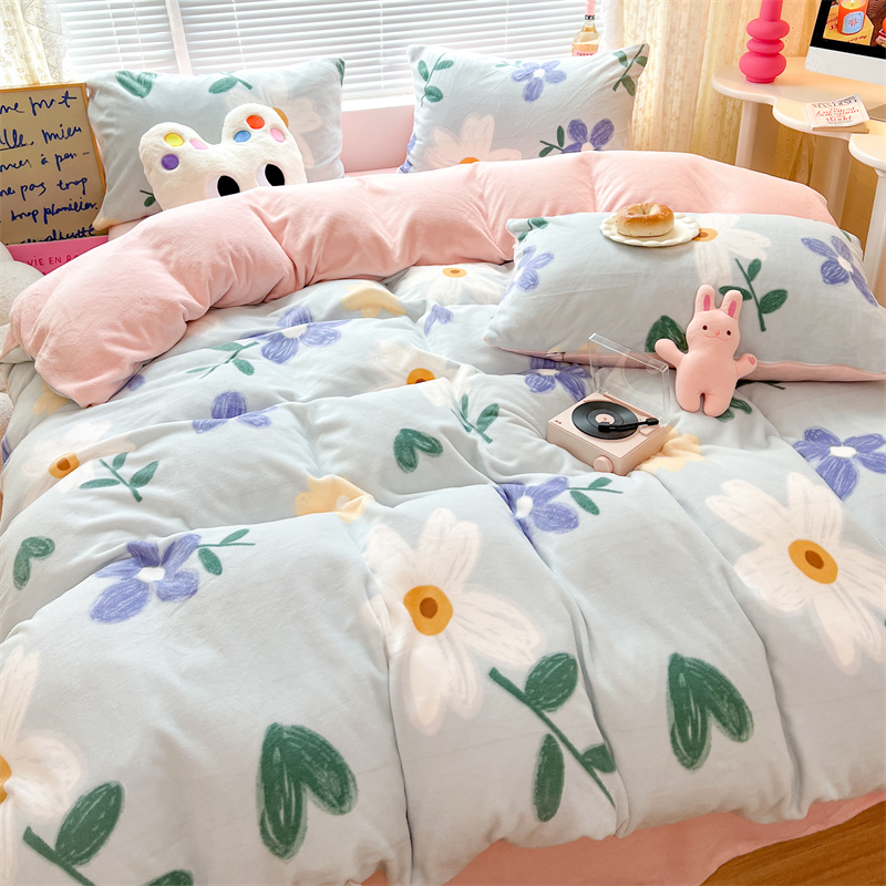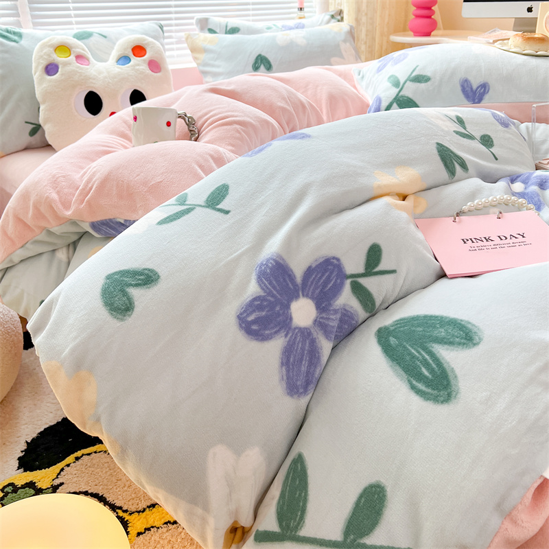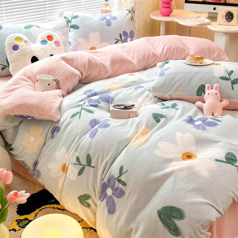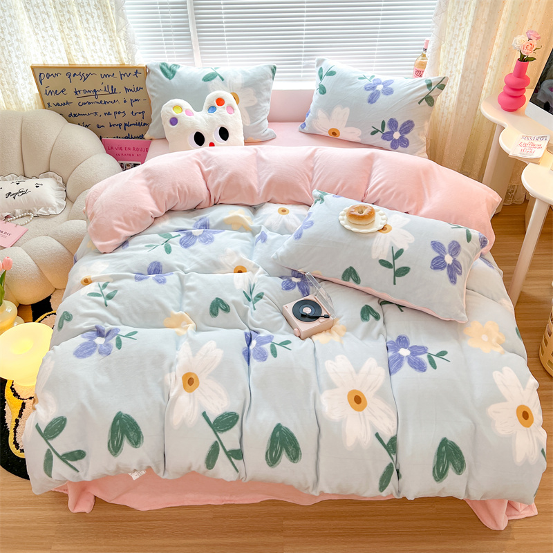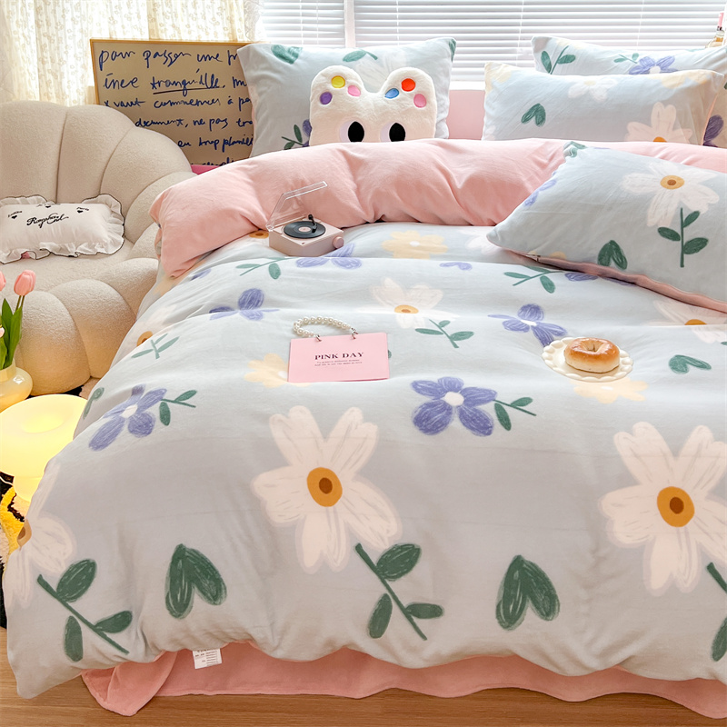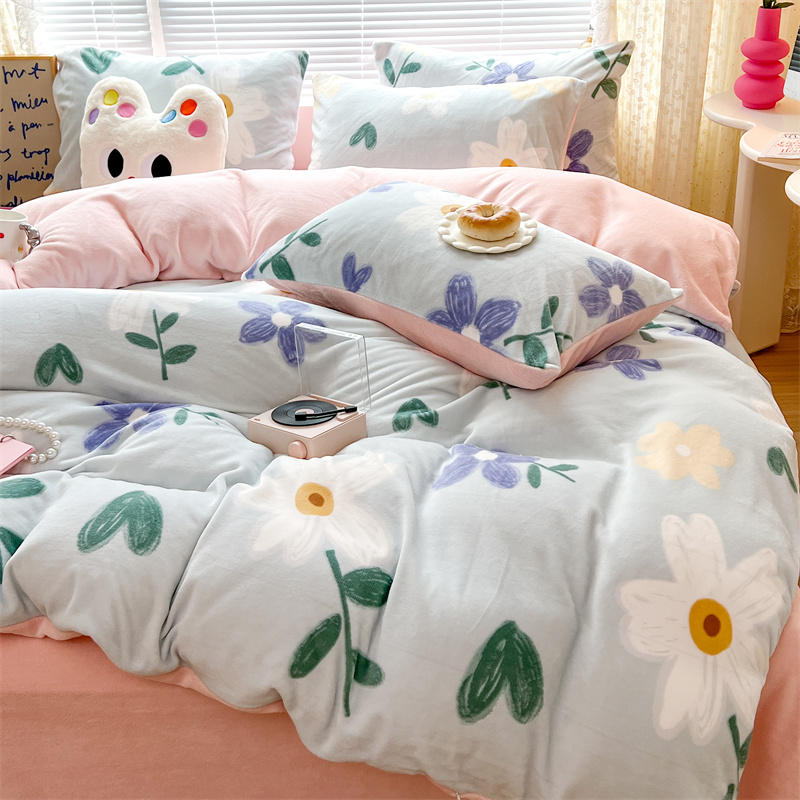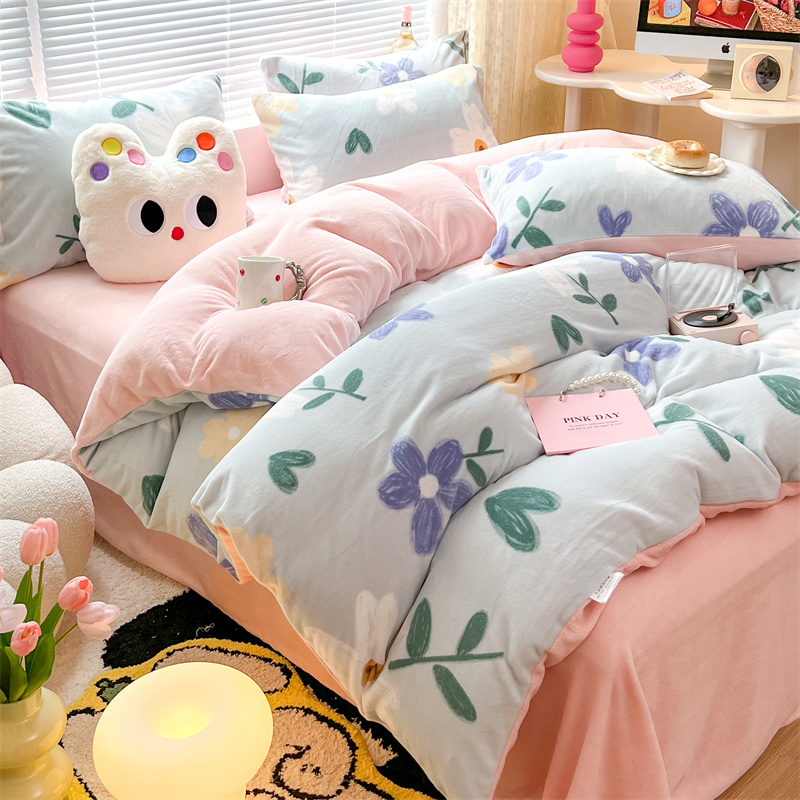 顾里家纺 新款ins少女保暖牛奶绒四件套第二批 蓝底花朵
