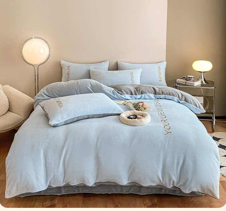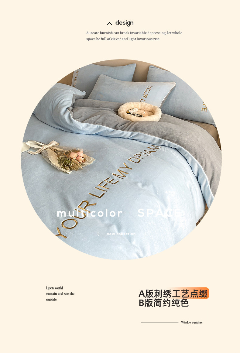 义博 2025新款牛奶绒刺绣四件套-浪漫系列 浪漫-天蓝云灰