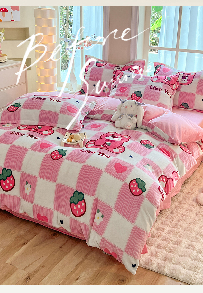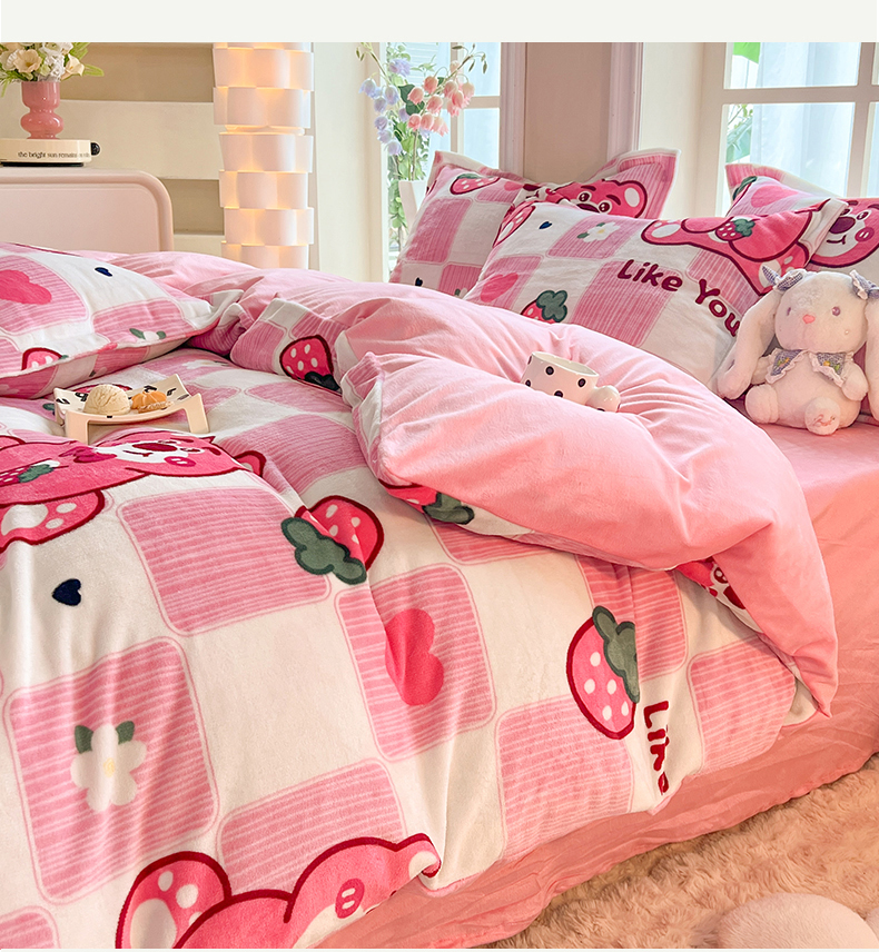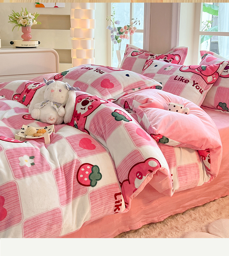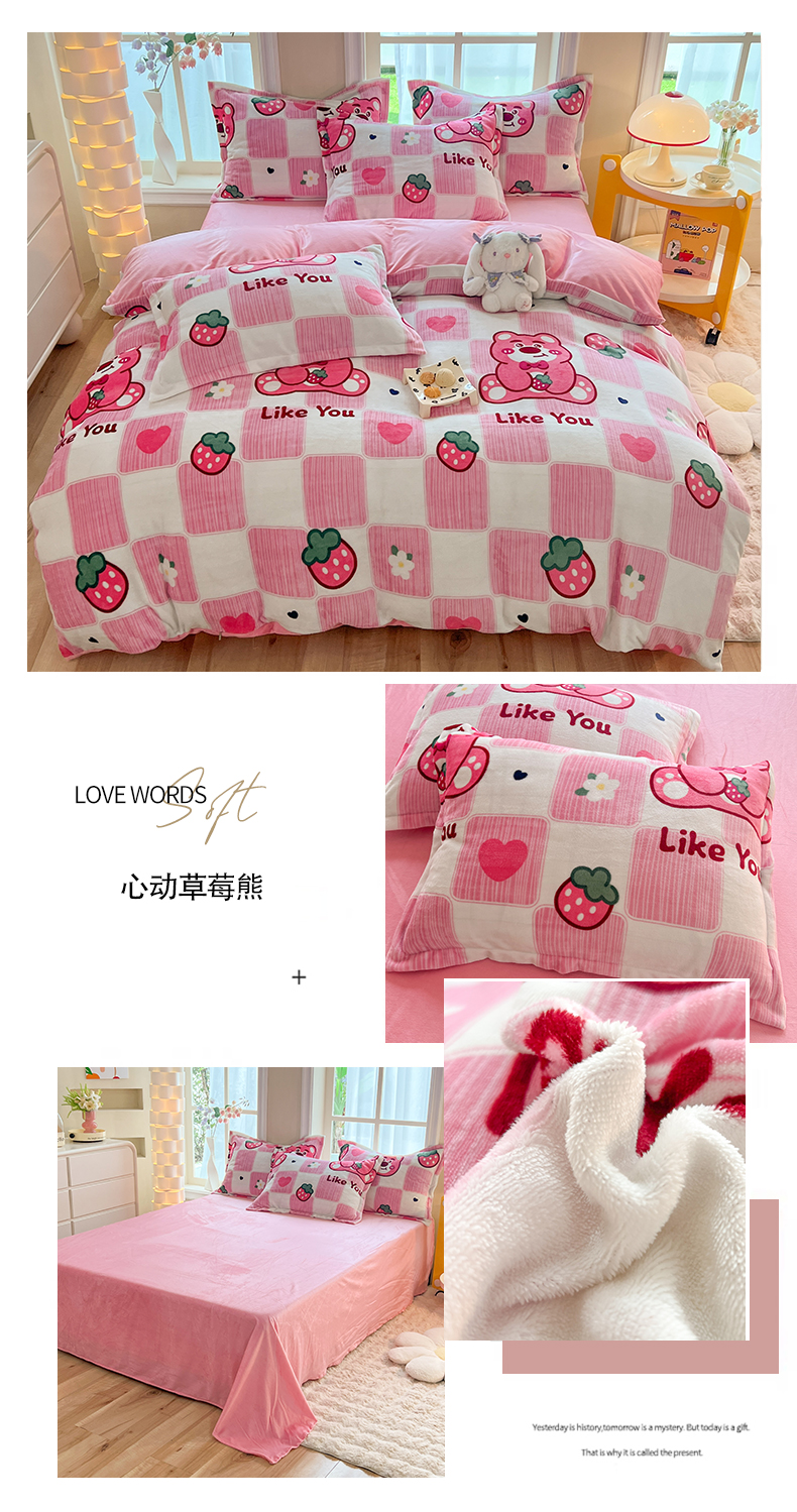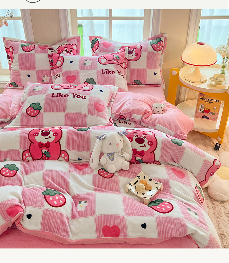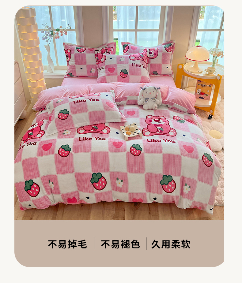 当前位置: 91家纺网 > 商品网购 > 床品套件 > 四件套 > 牛奶绒四件套 > 妖妖家纺 2023新款牛奶绒四件套 心动草莓熊
