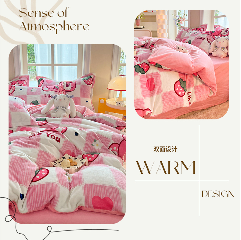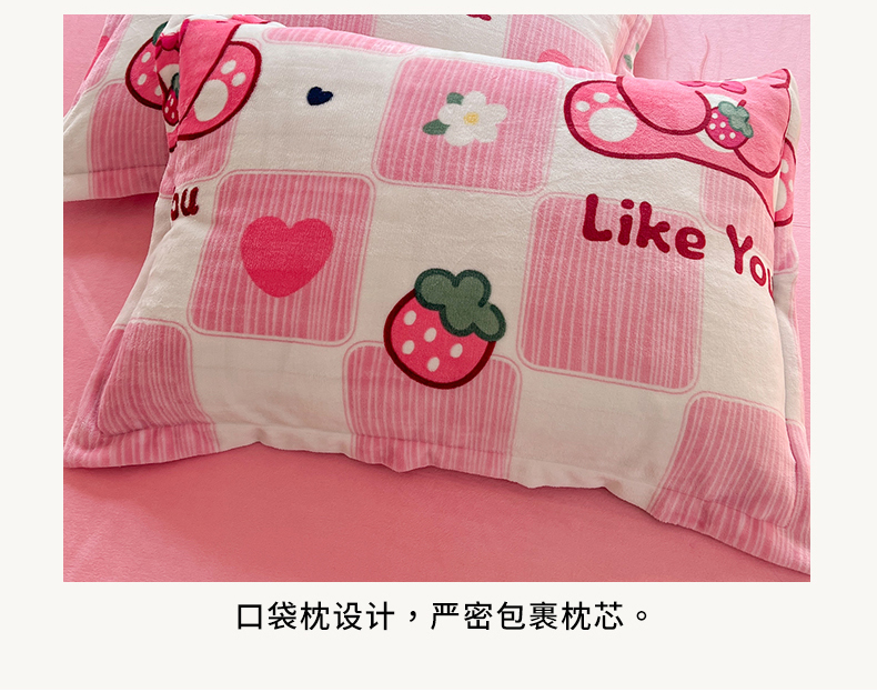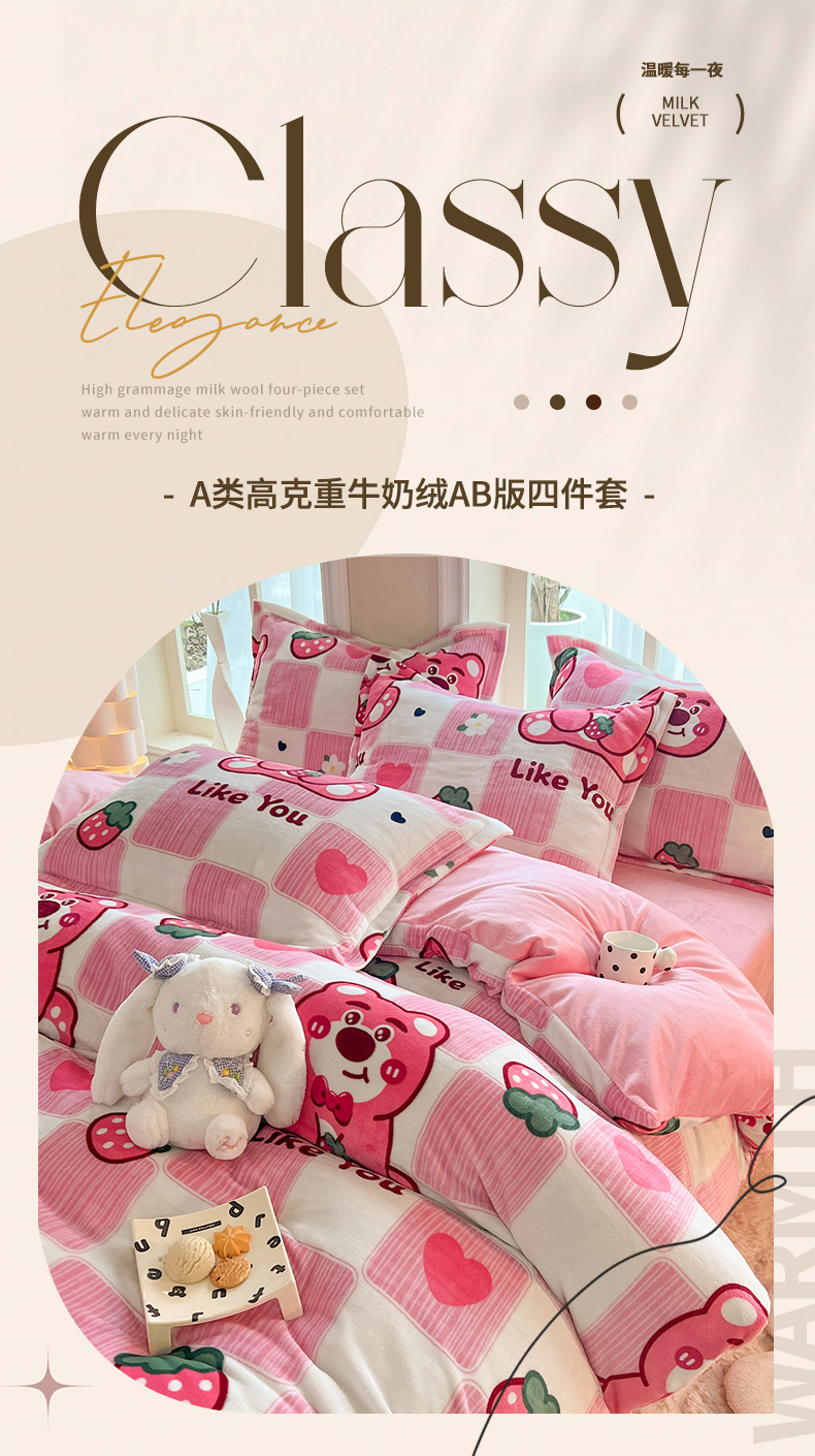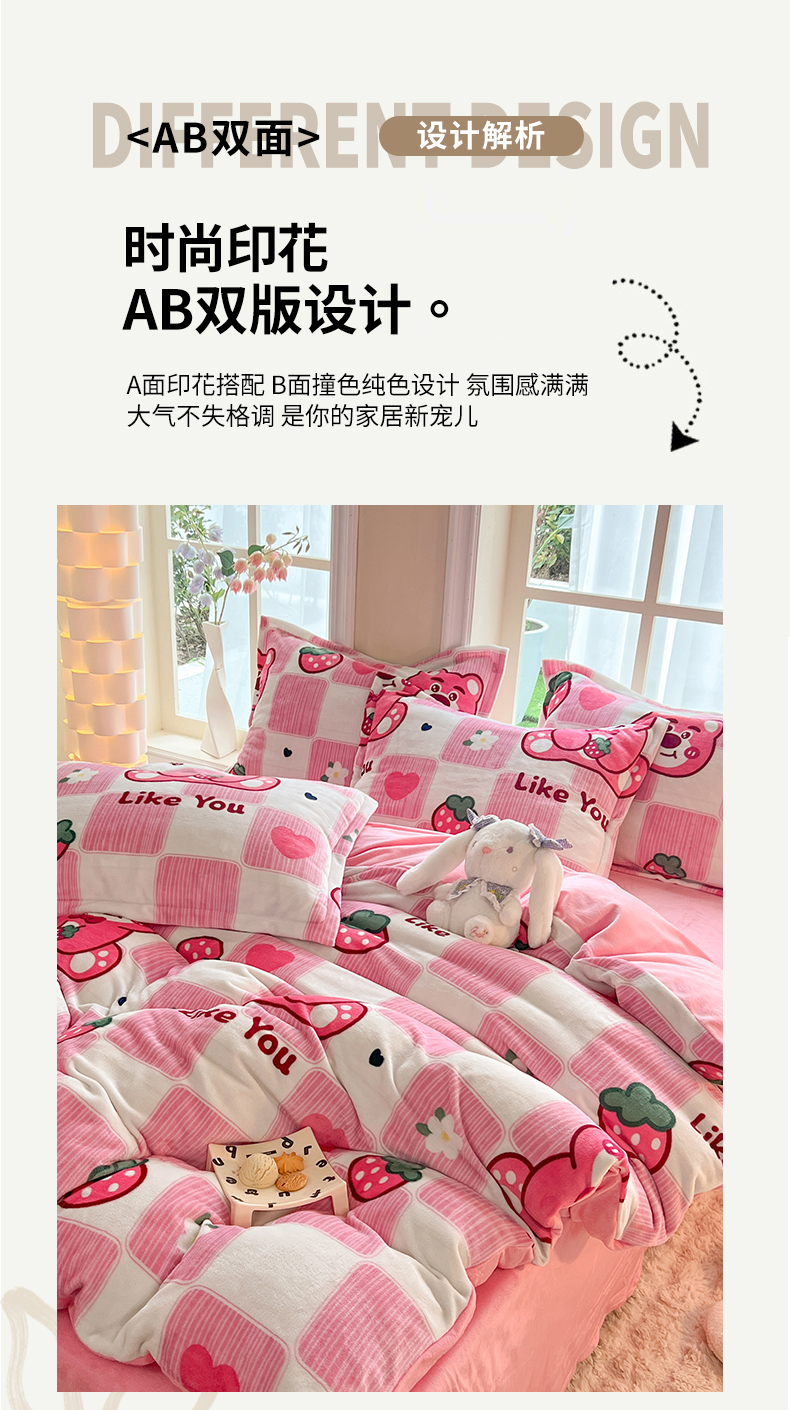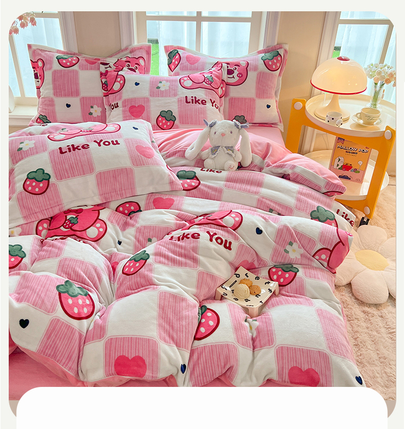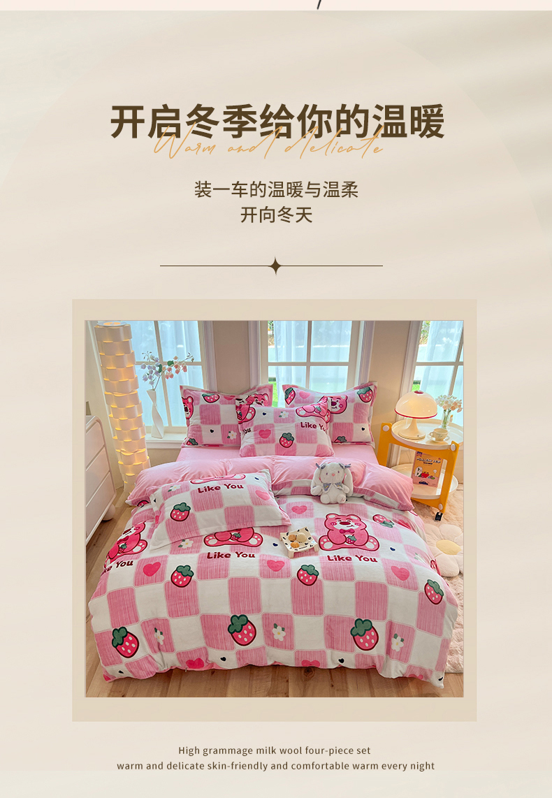 当前位置: 91家纺网 > 商品网购 > 床品套件 > 四件套 > 牛奶绒四件套 > 妖妖家纺 2023新款牛奶绒四件套 心动草莓熊