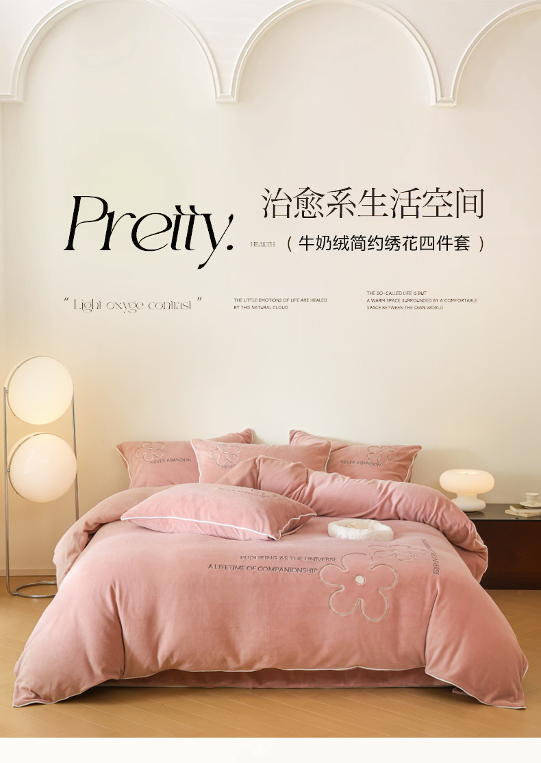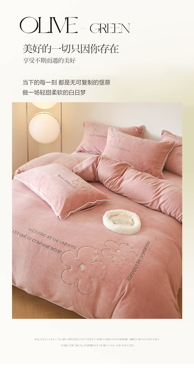 (总)万盛家纺 2025新款牛奶绒简约绣花四件套,艾草绿,豆沙色,高级灰,奶油黄,香草白,杏仁色,悠悠粉