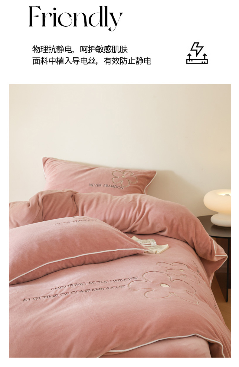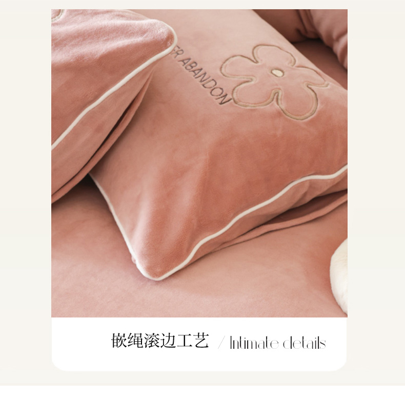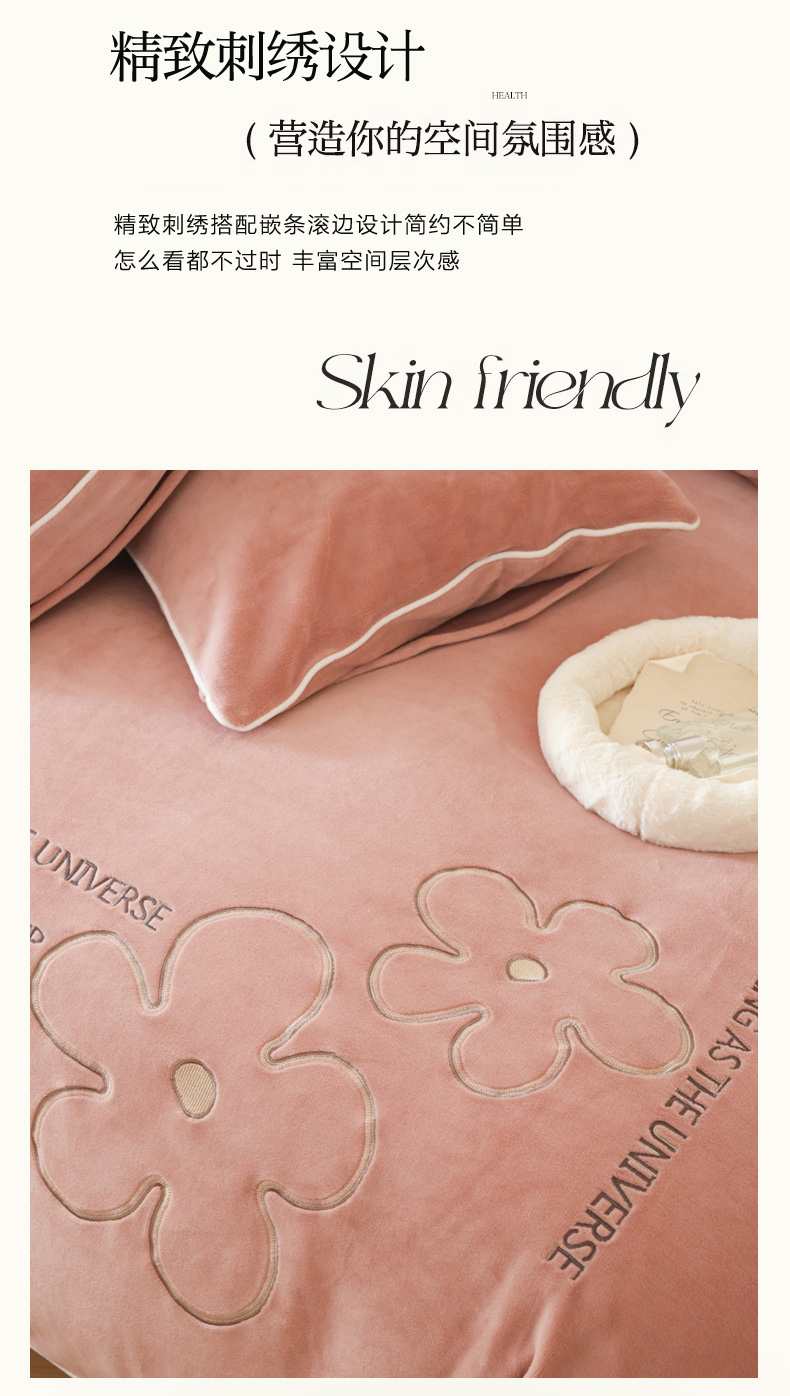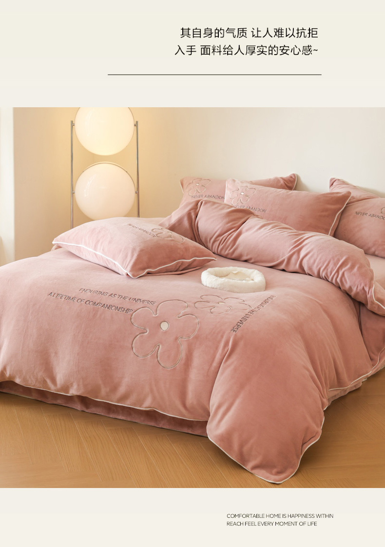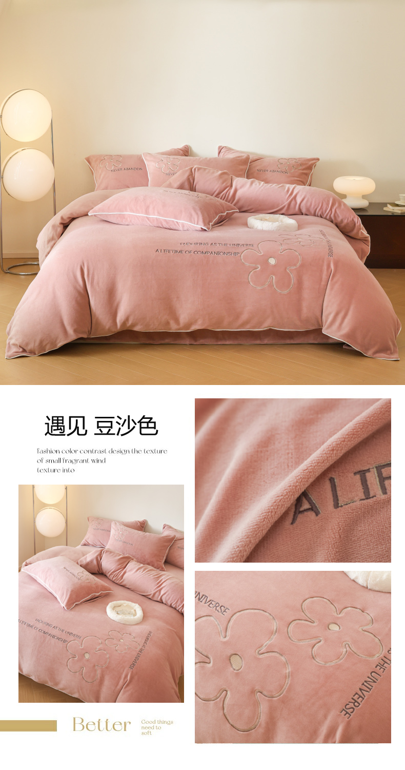 万盛家纺 2025新款牛奶绒简约绣花四件套 豆沙色