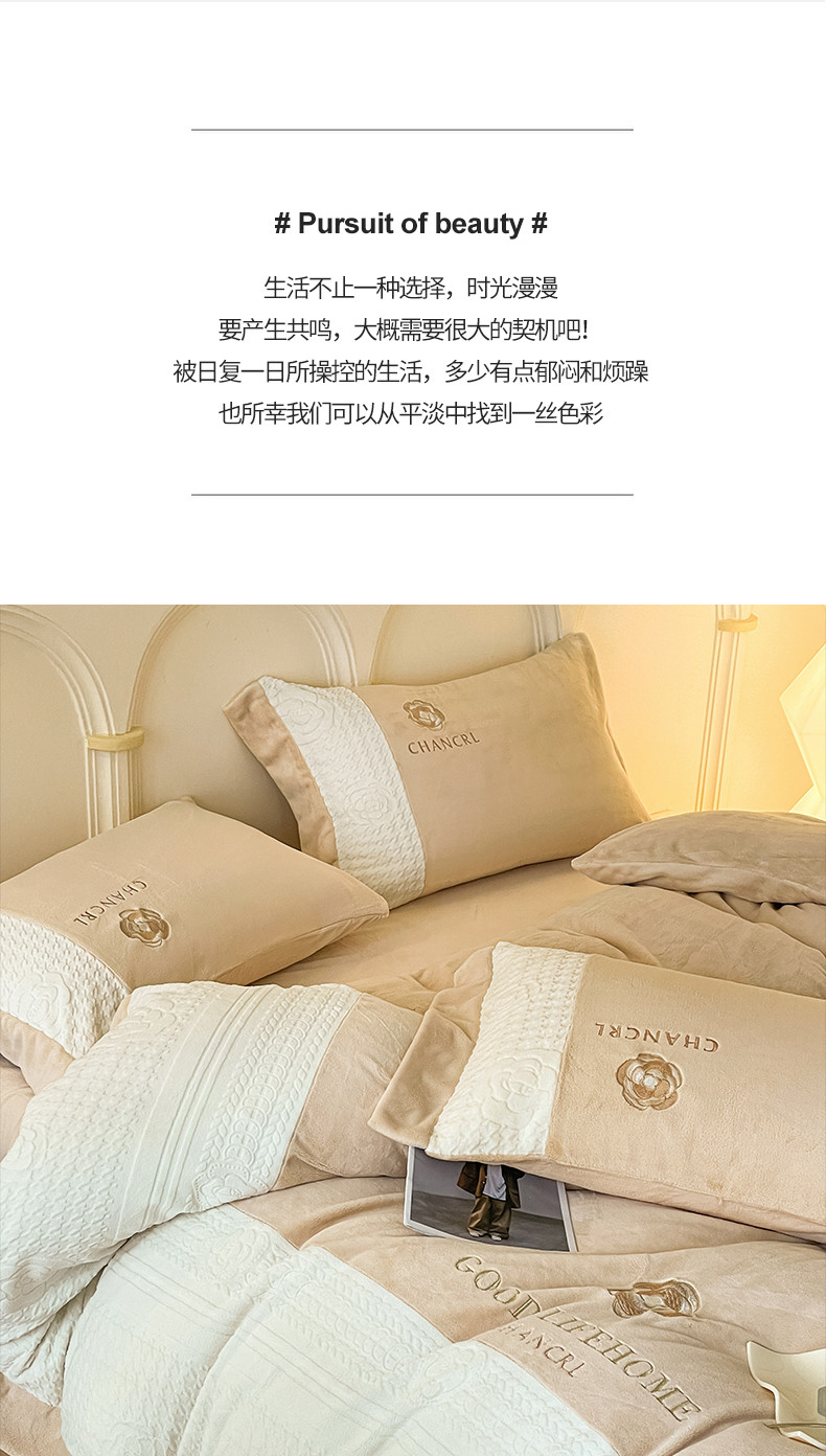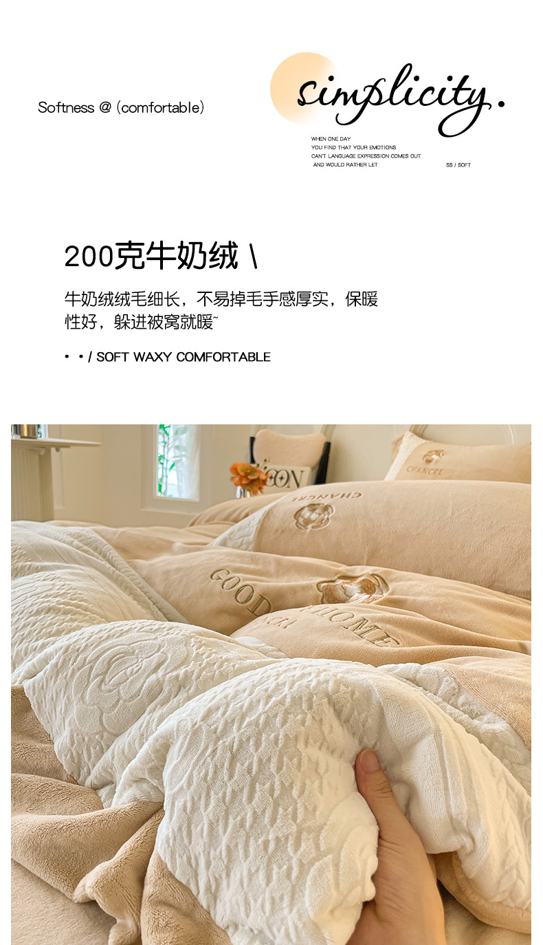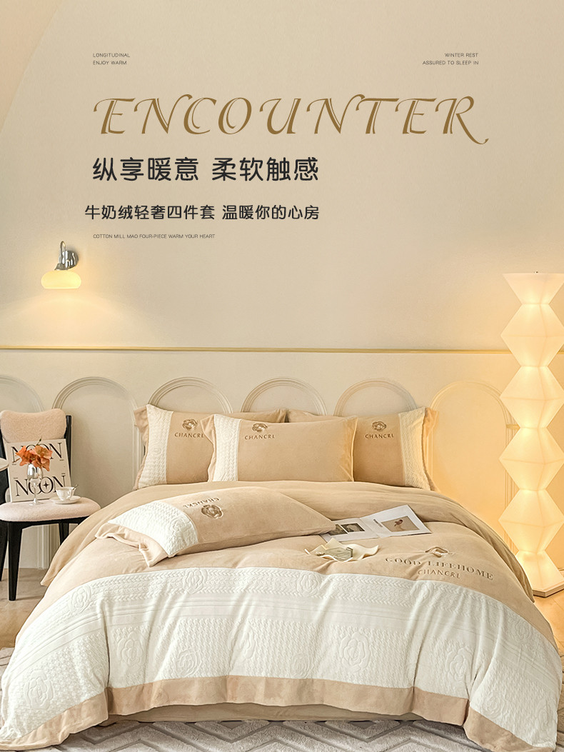 当前位置: 91家纺网 > 商品网购 > 床品套件 > 四件套 > 牛奶绒四件套 > 娜娜 2023新款牛奶绒三拼轻奢风四件套 奶咖