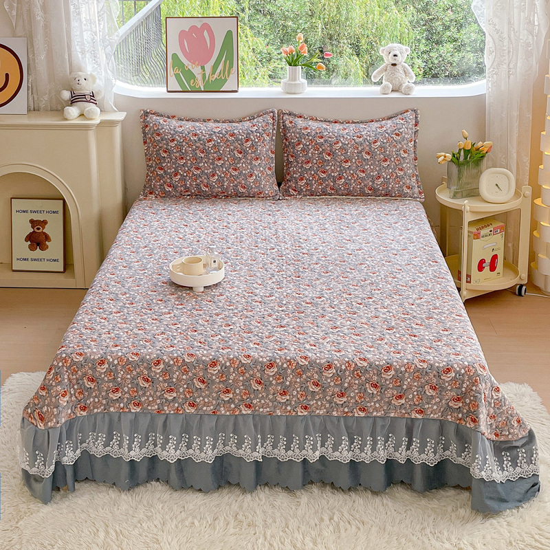 雅眠居 2023新款直播爆款牛奶绒双层蕾丝床盖夹棉床裙款 复古玫瑰