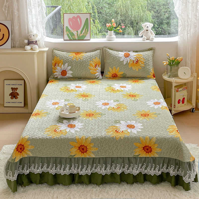 雅眠居 2023新款直播爆款牛奶绒双层蕾丝床盖夹棉床裙款 向日葵