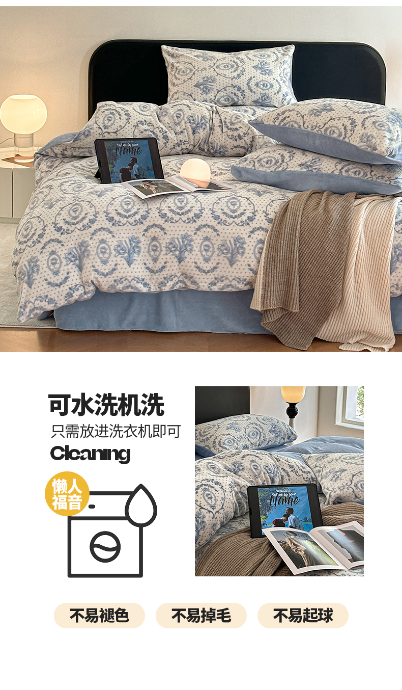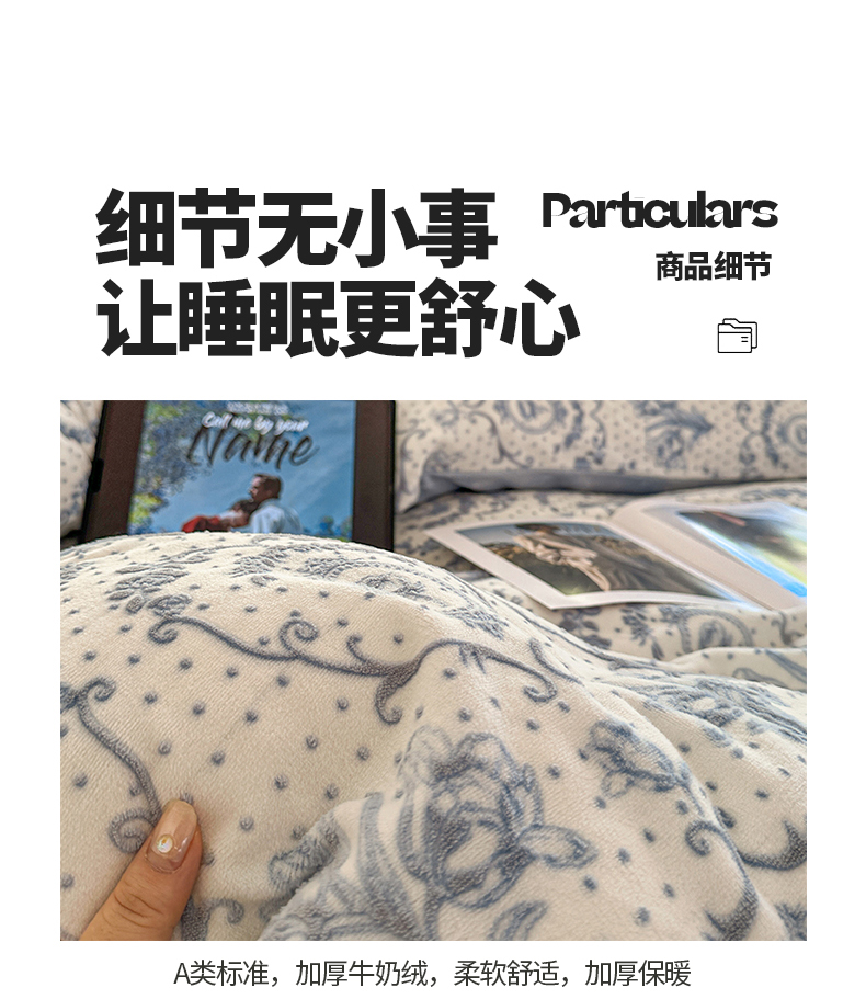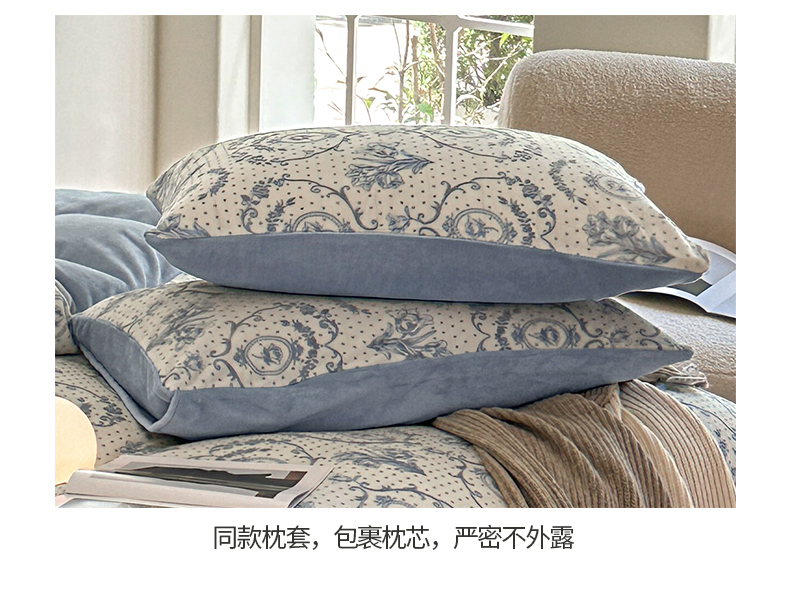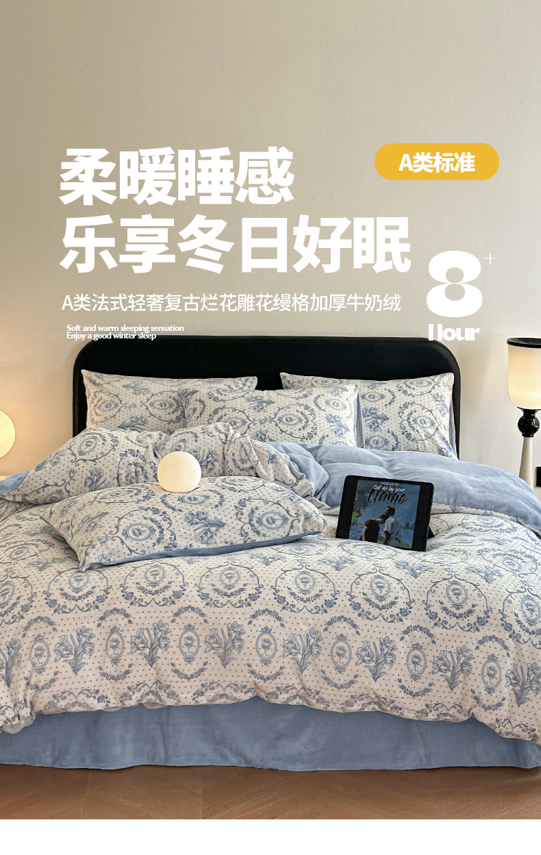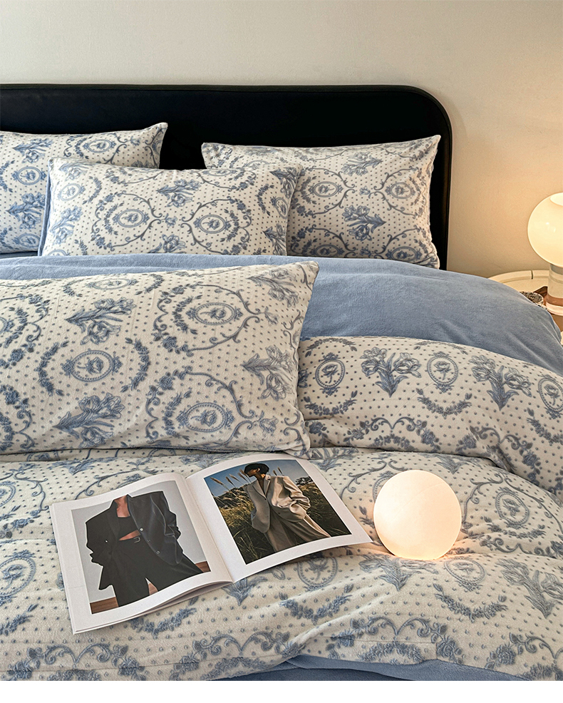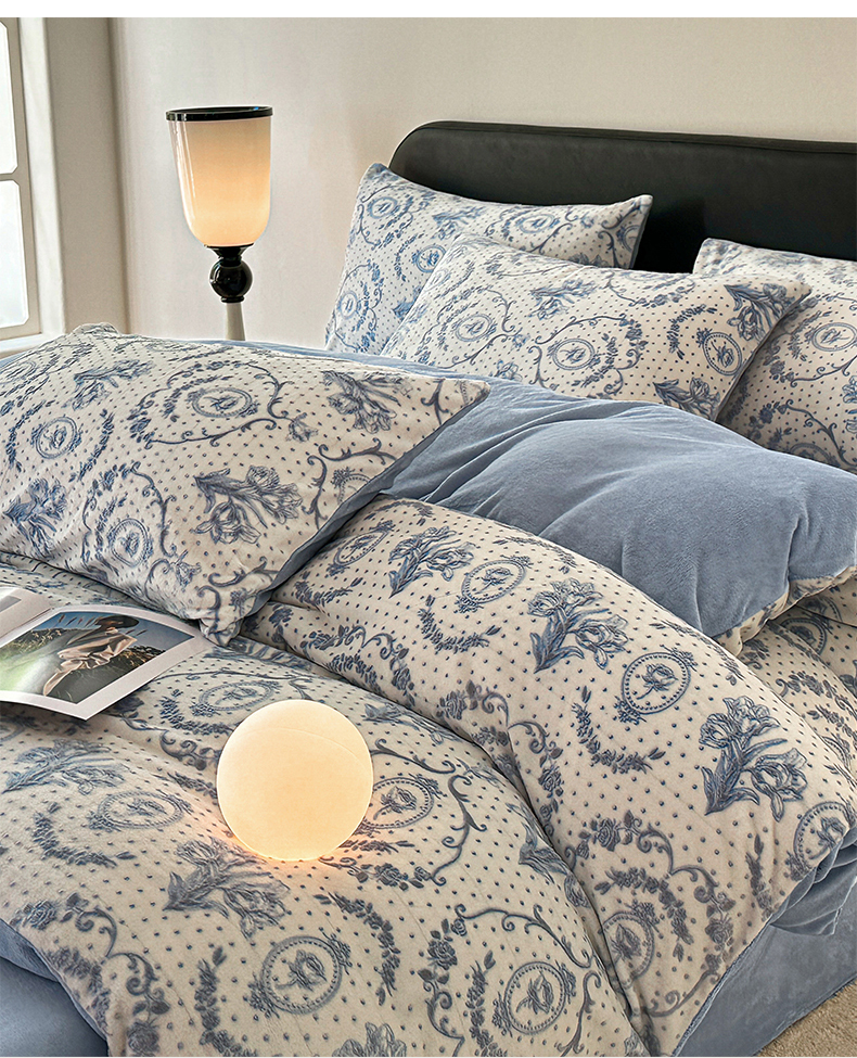商品名称:桃子家居 2023新款A类高克重230克法式轻奢复古着色烂花雕花缦格加厚牛奶绒四件套 缦格复古蓝