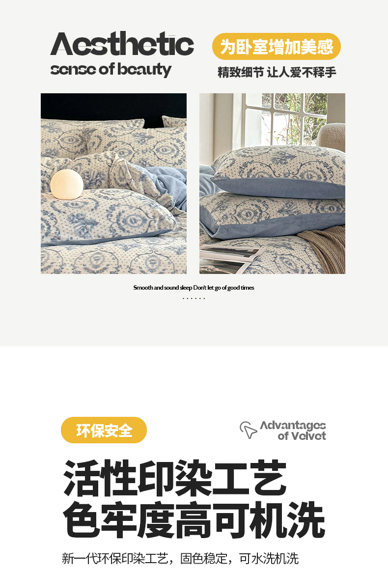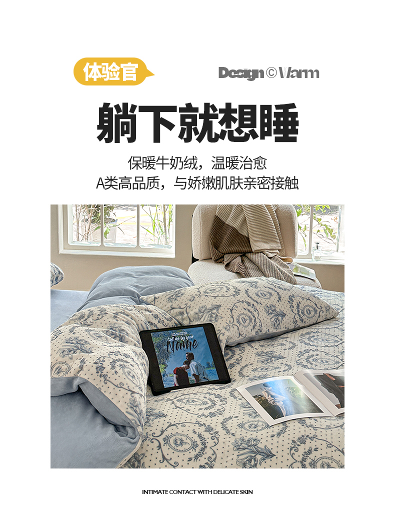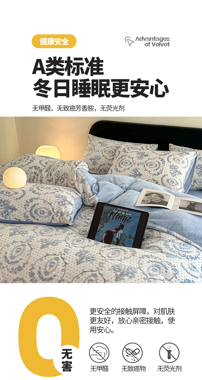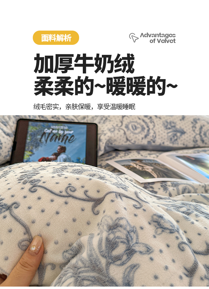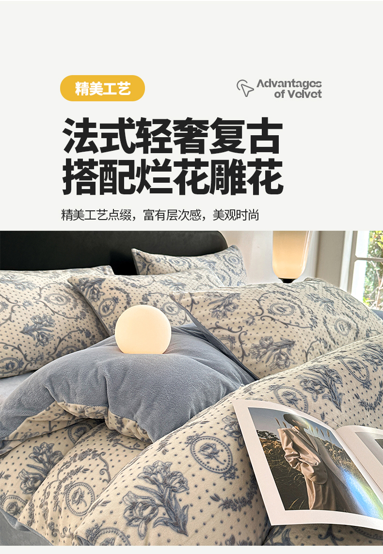 商品名称:桃子家居 2023新款A类高克重230克法式轻奢复古着色烂花雕花缦格加厚牛奶绒四件套 缦格复古蓝