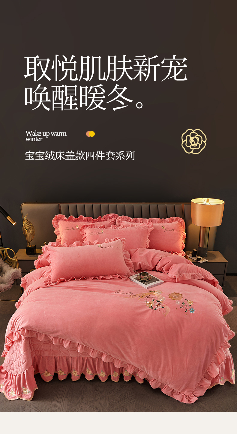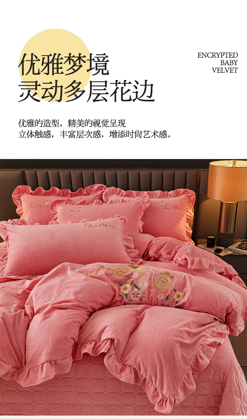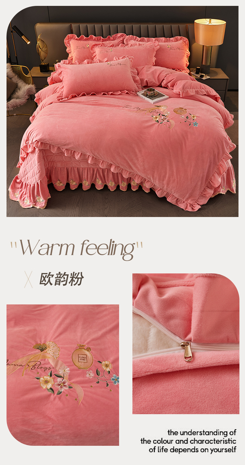 当前位置: 91家纺网 > 商品网购 > 床品套件 > 四件套 > 宝宝绒四件套 > 恒爱家纺 2023新款温暖舒适加密宝宝绒床盖四件套-邂逅系列 欧韵粉
