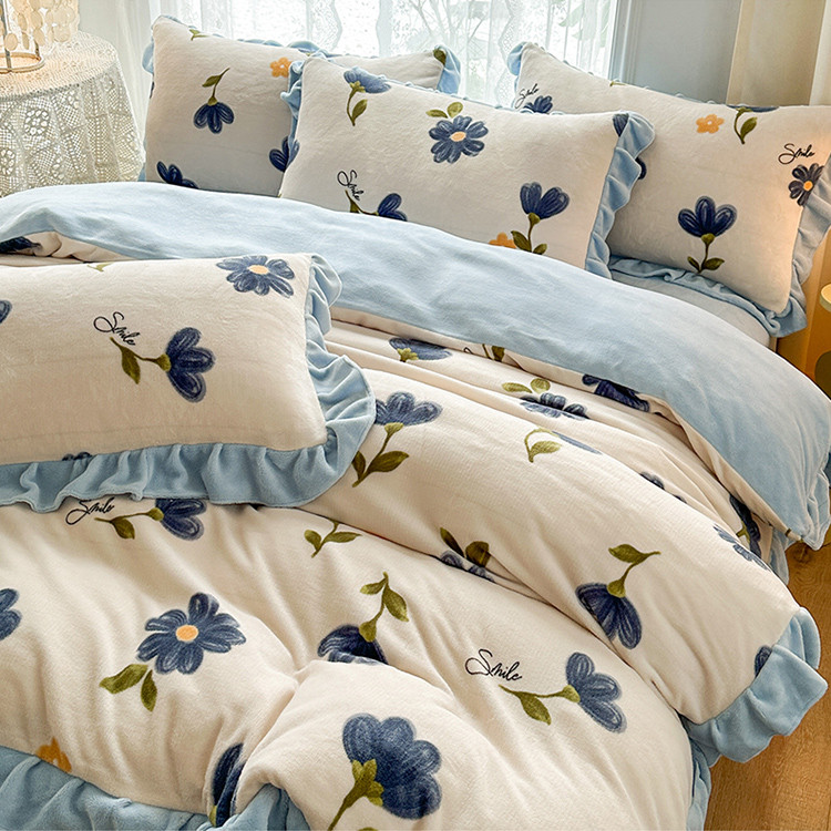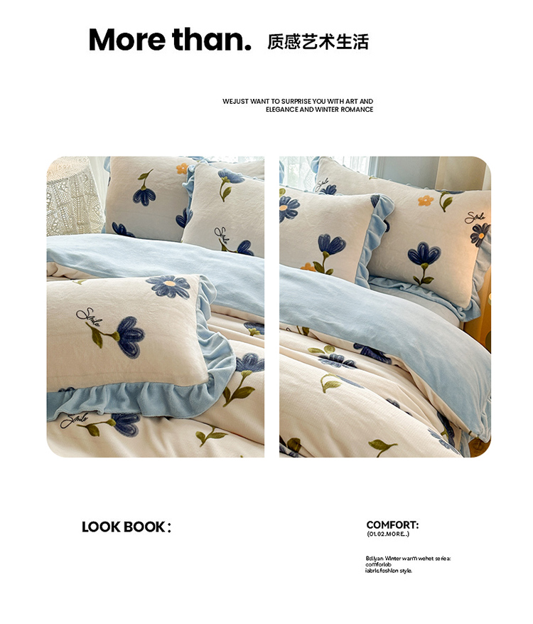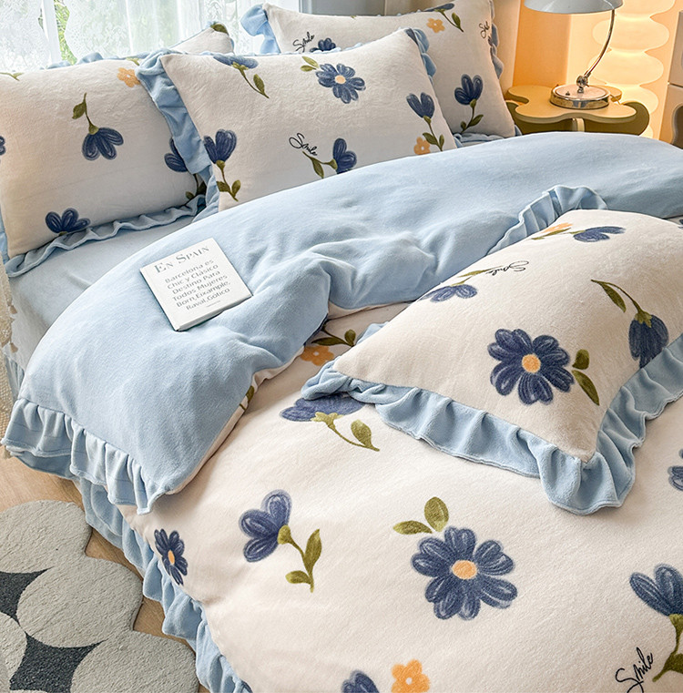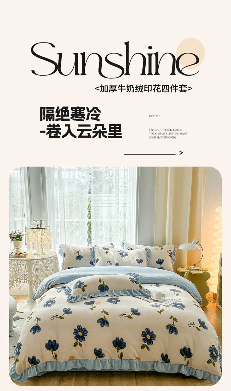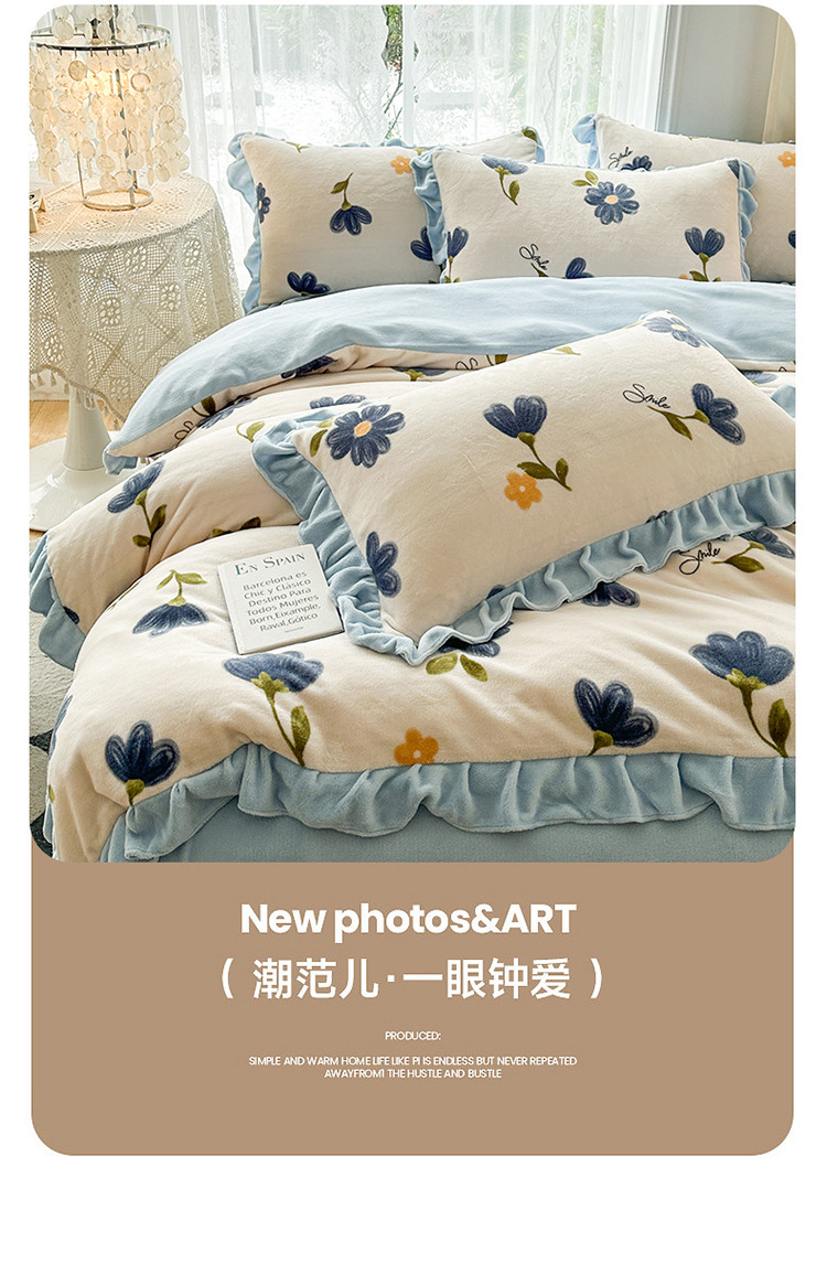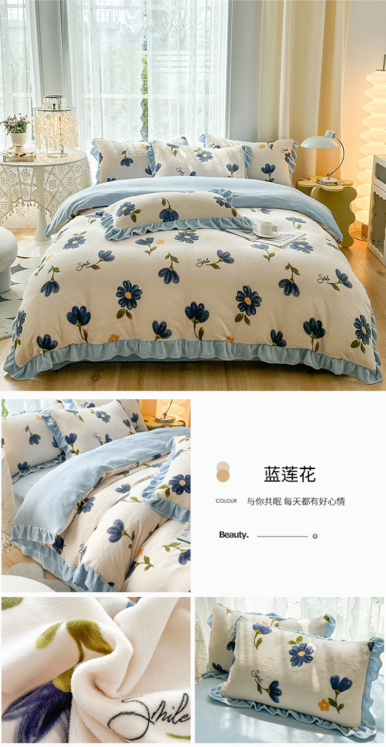 当前位置: 91家纺网 > 商品网购 > 床品套件 > 四件套 > 牛奶绒四件套 > 小主驾到 2023新款高克重韩版牛奶绒花边四件套蓝莲花