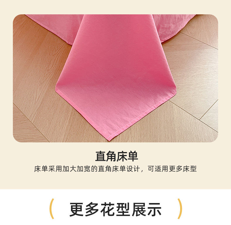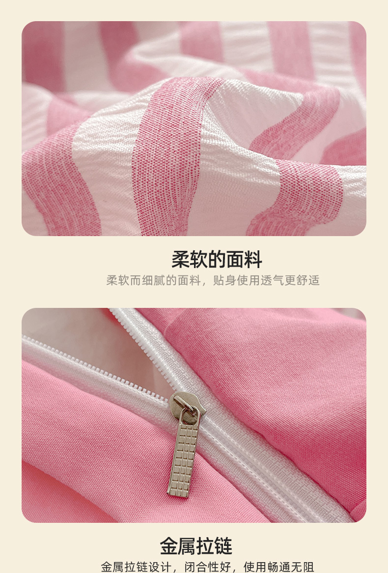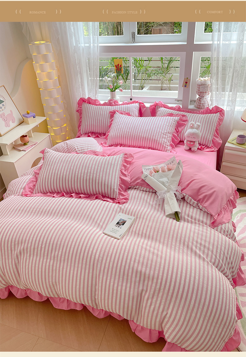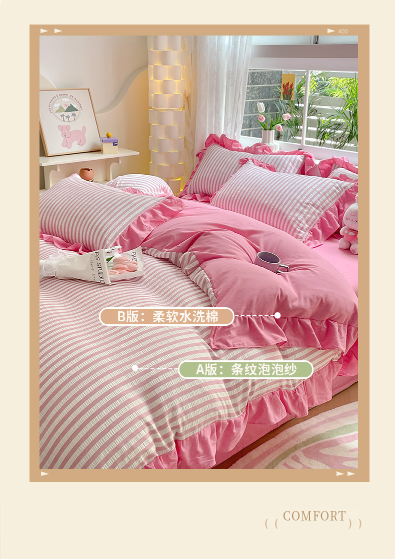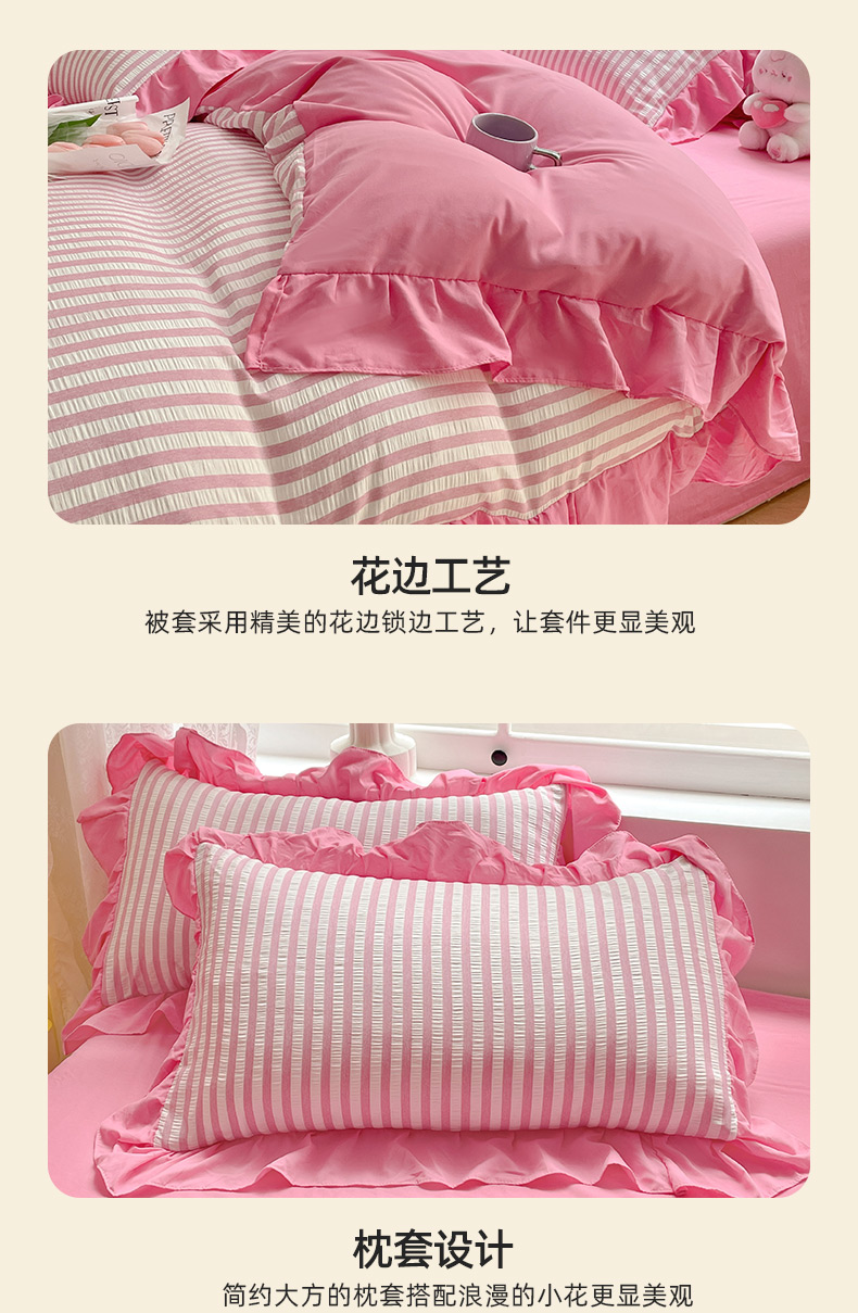 商品名称:苏木年华 2024新款水洗棉竖条纹泡泡纱小清新花边四件套 泡泡纱- 蜜桃粉