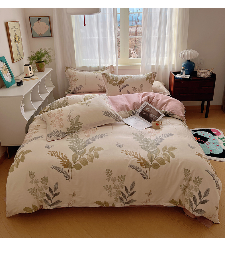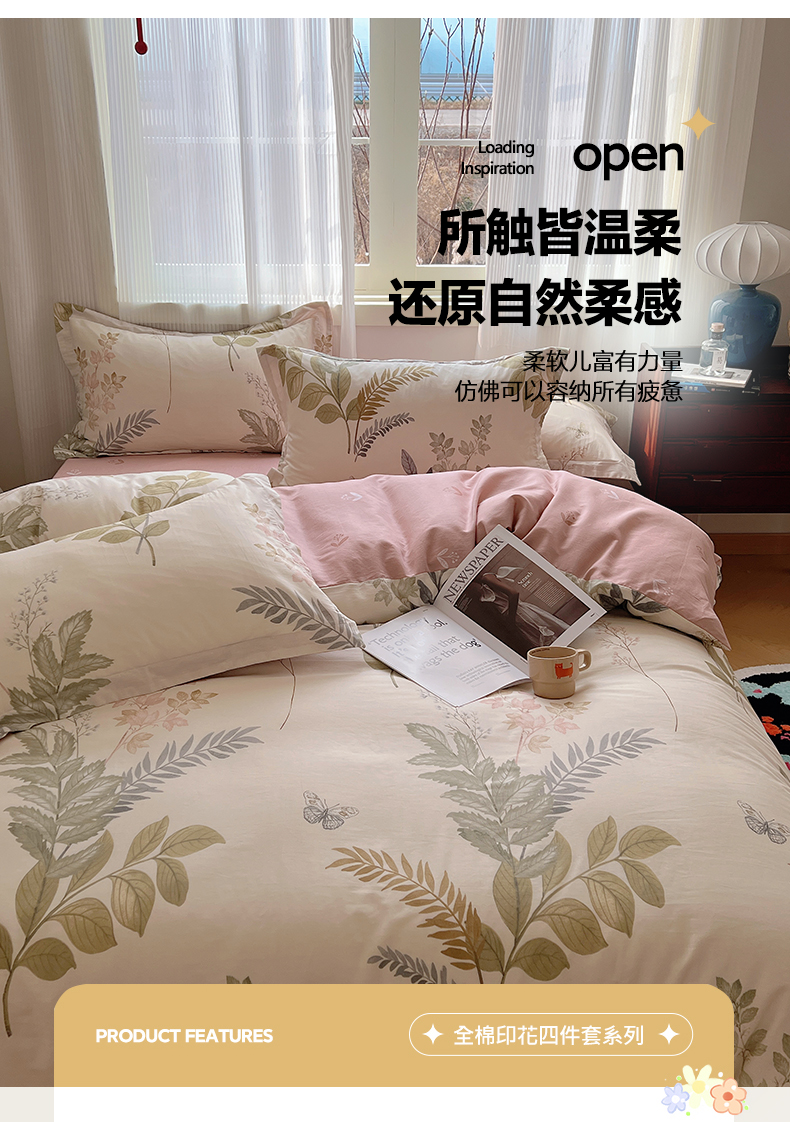 (总)盛馨2023新款全棉印花13372系列四件套,粉红浪漫粉,蜜语花香黄,慕斯言,四叶草,甜橘,幸福花语绿