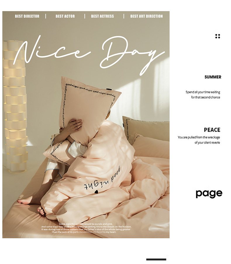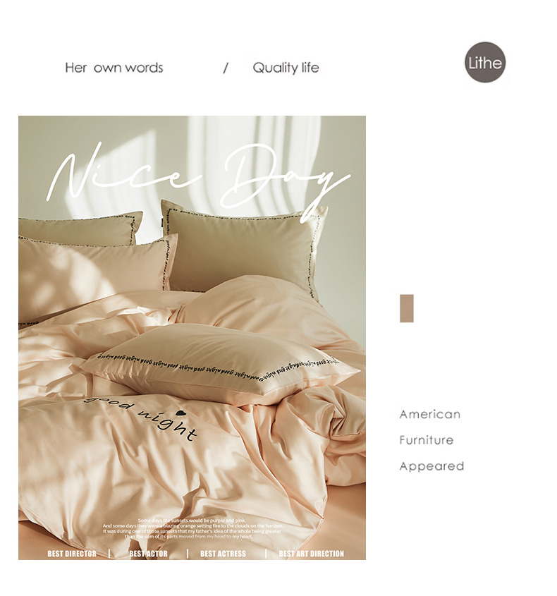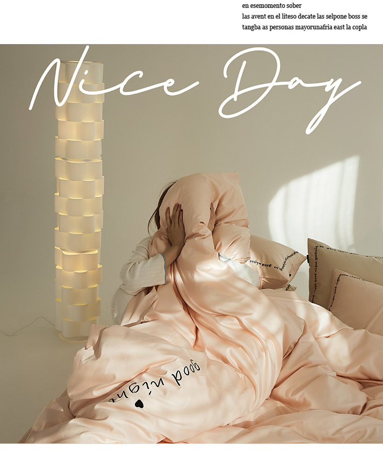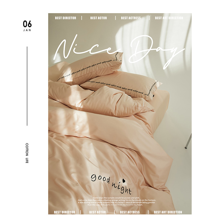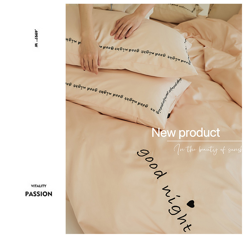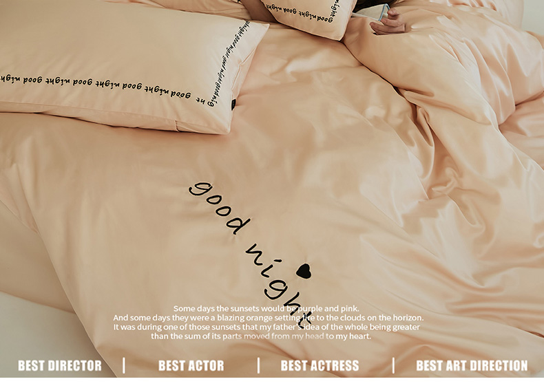 当前位置: 91家纺网 > 商品网购 > 床品套件 > 四件套 > 全棉普通四件套 > 新款高密全棉绣花四件套--晚安系列 英文版 晚安-芙蓉粉