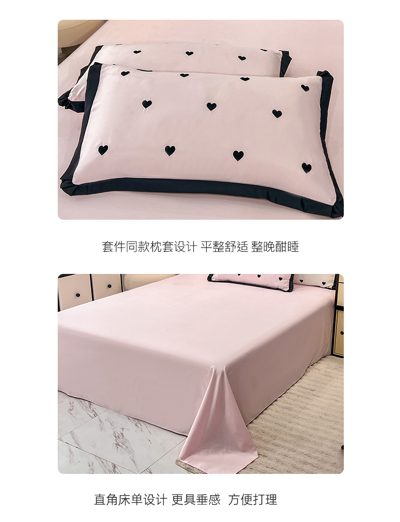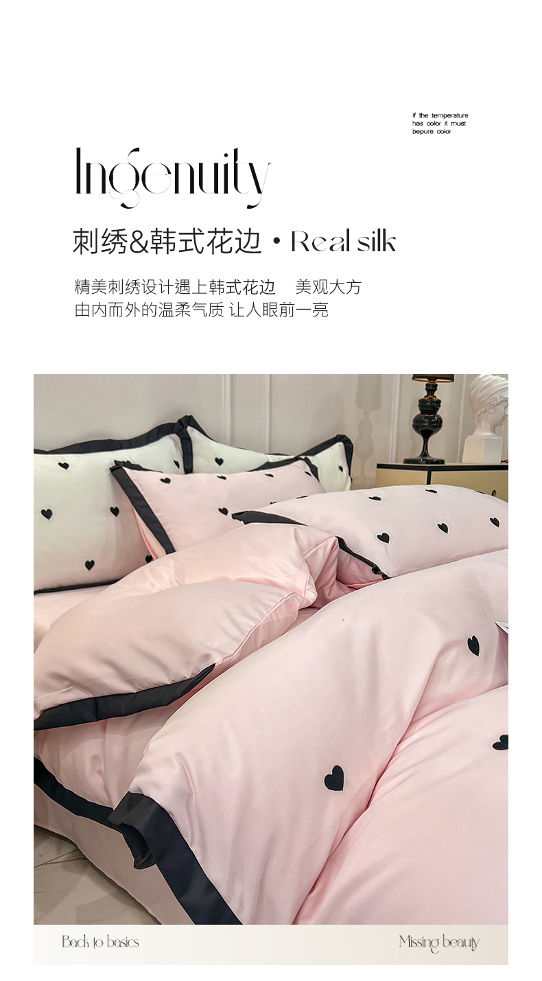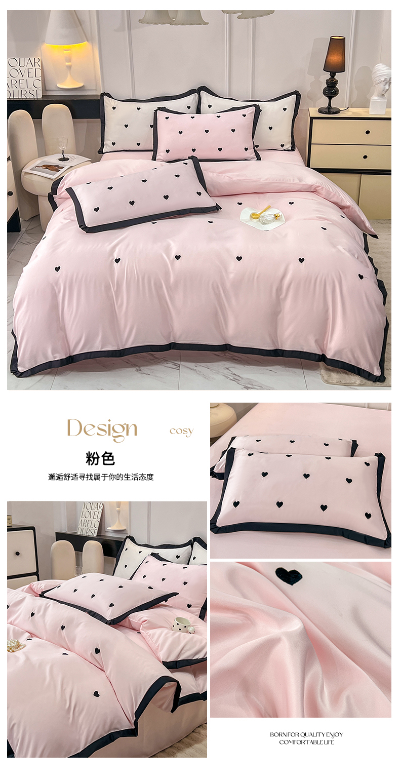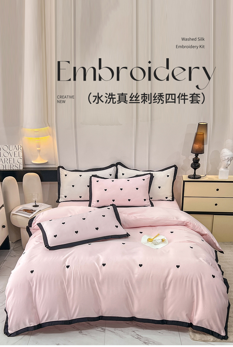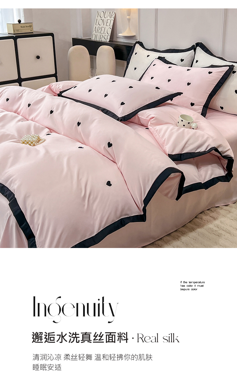 商品名称:艾米家居 2025新款水洗真丝四件套爱心款 黑色爱心款-粉色