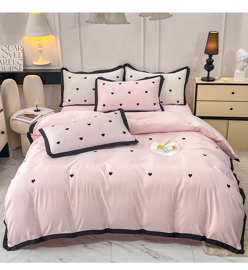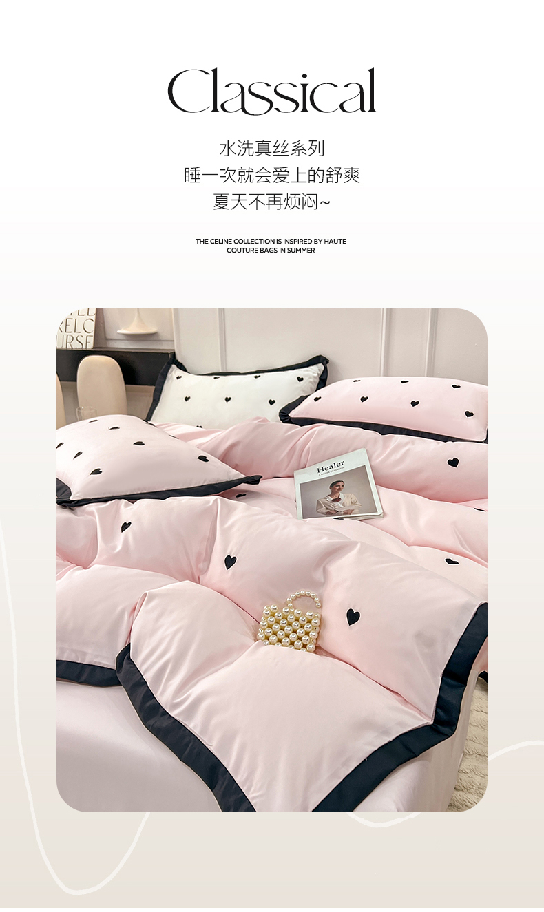 艾米家居 2025新款水洗真丝四件套爱心款 黑色爱心款-粉色