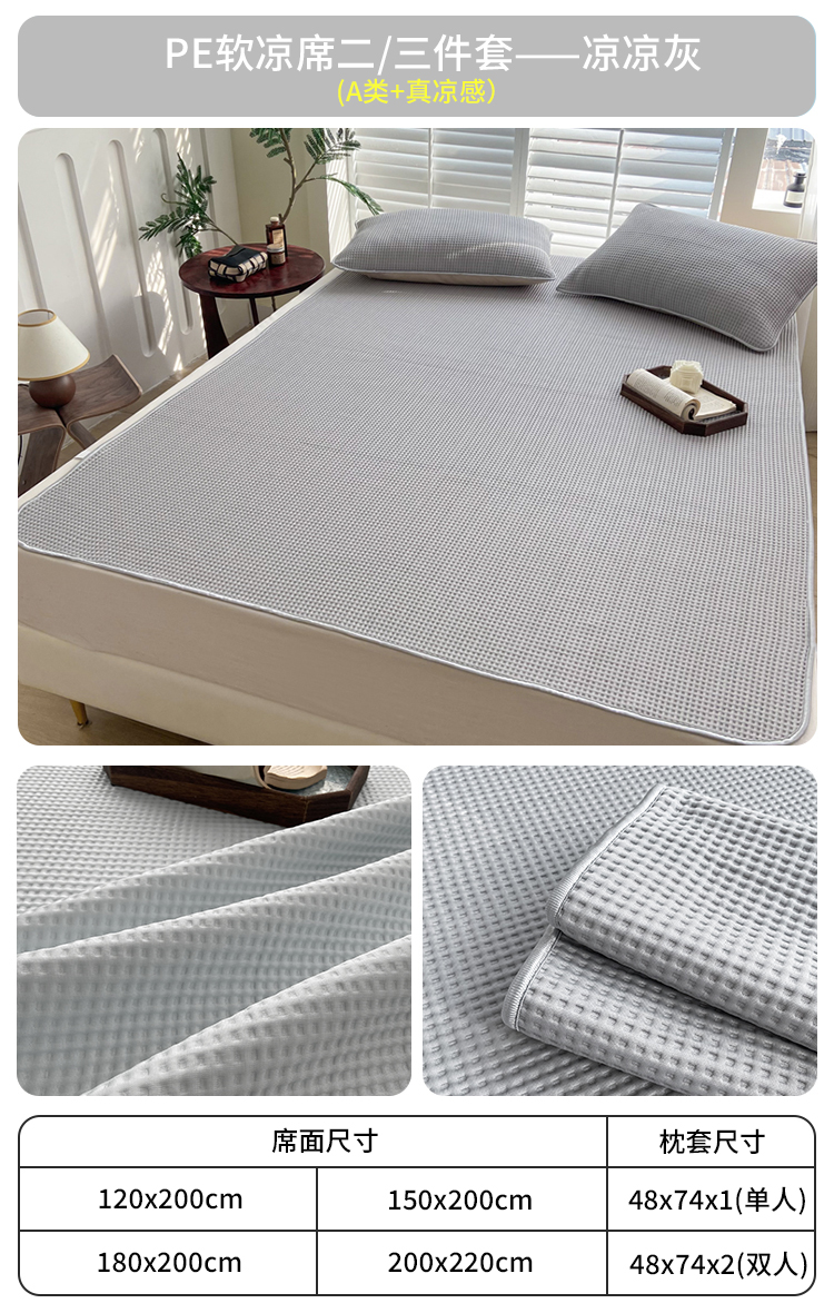 触手即凉!A类创新科技新款2025双面PE夏凉席三件套 灰