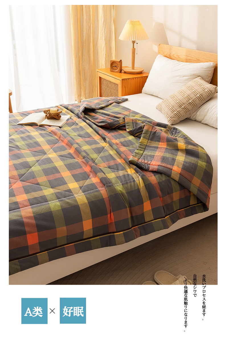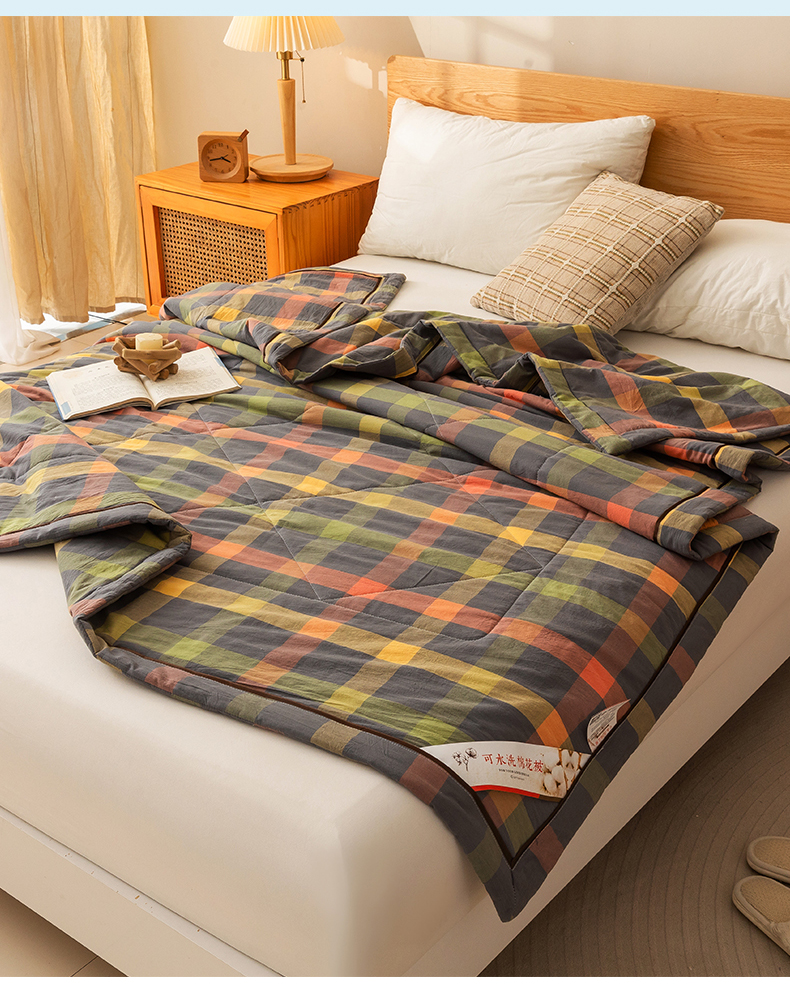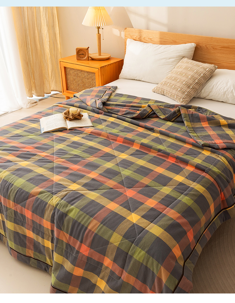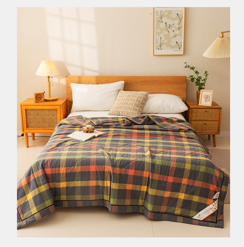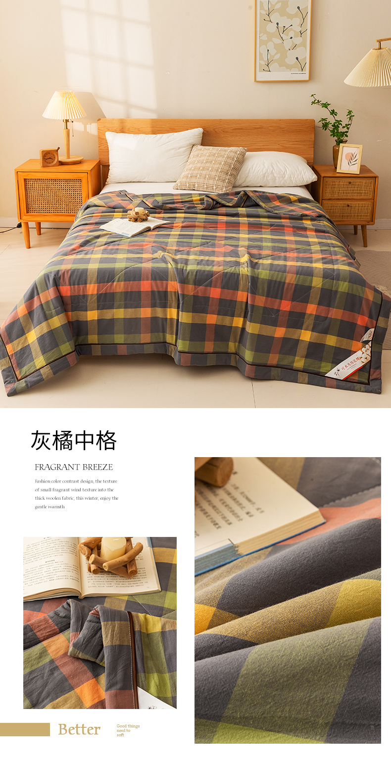 21度C 2024新款A类全棉色织水洗棉棉花夏被 灰橘中格
