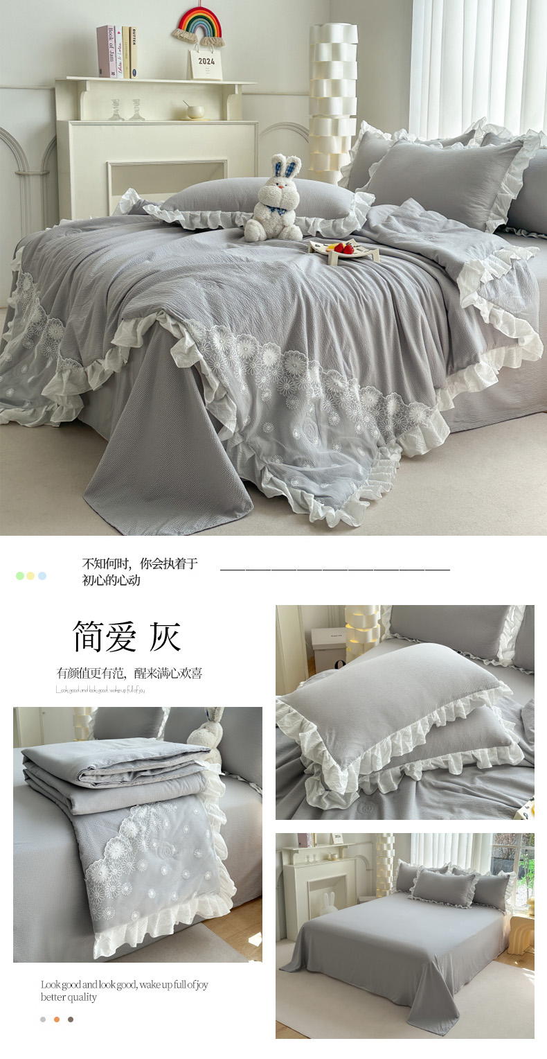 商品名称:唐人居 2025新款韩版花边泡泡纱夏被四件套--简爱 简爱 灰
