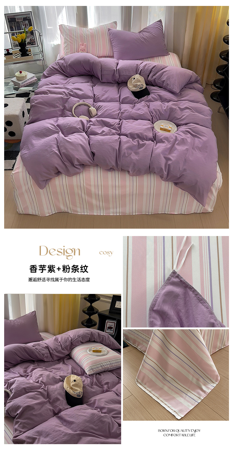 当前位置: 91家纺网 > 商品网购 > 床品套件 > 四件套 > 水洗棉四件套 > 易辰美 2024新款水洗棉混搭条纹四件套 香芋紫+粉条纹