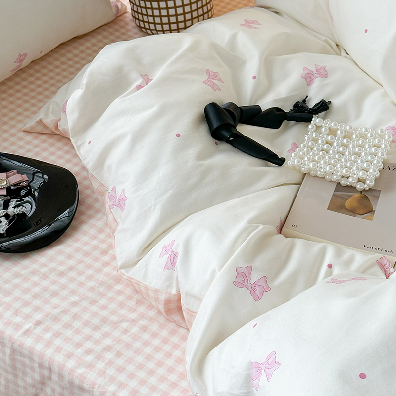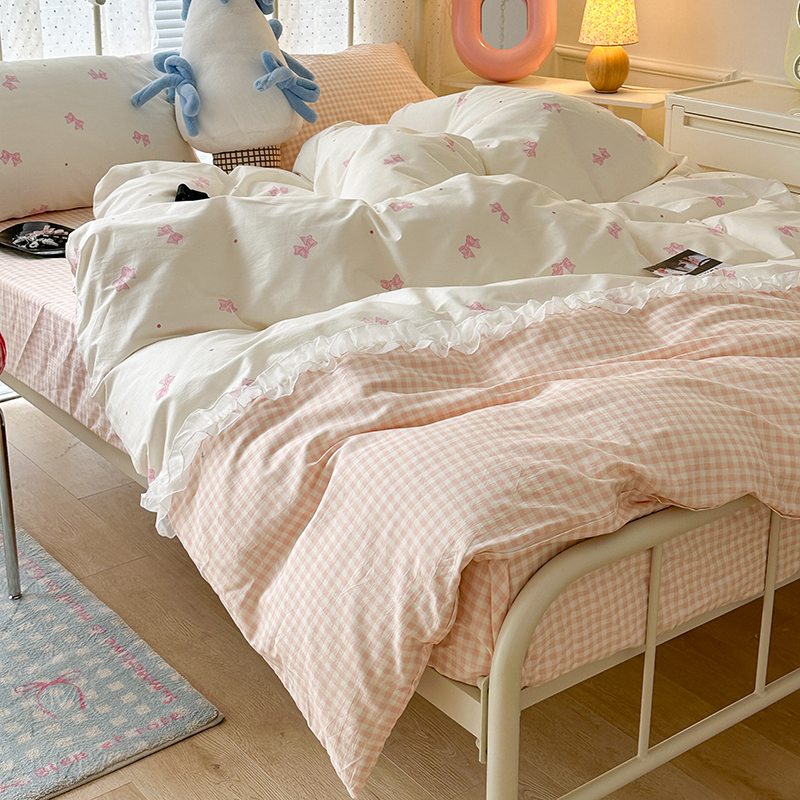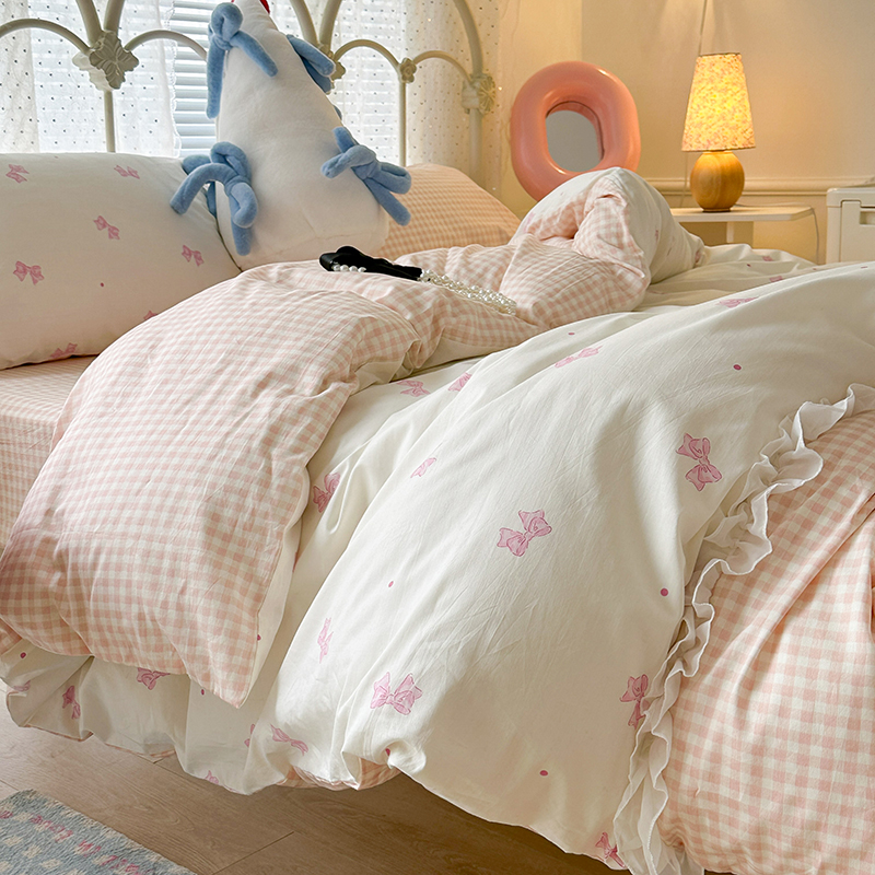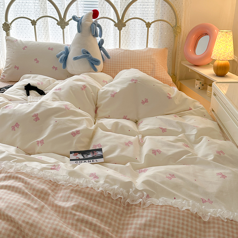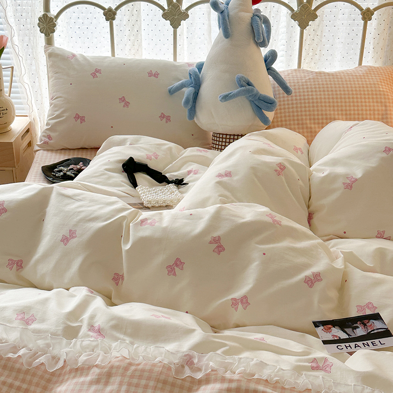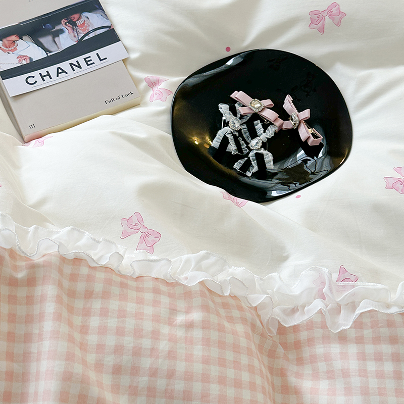 昔可家纺 2024新款时尚拼接雪纺边全棉四件套 点点粉蝴蝶结
