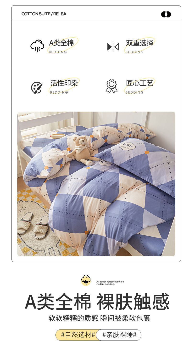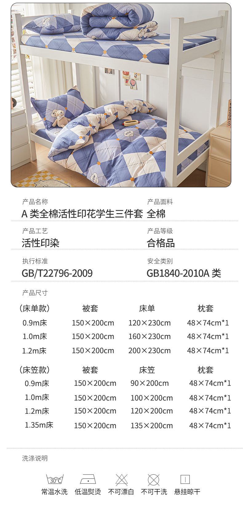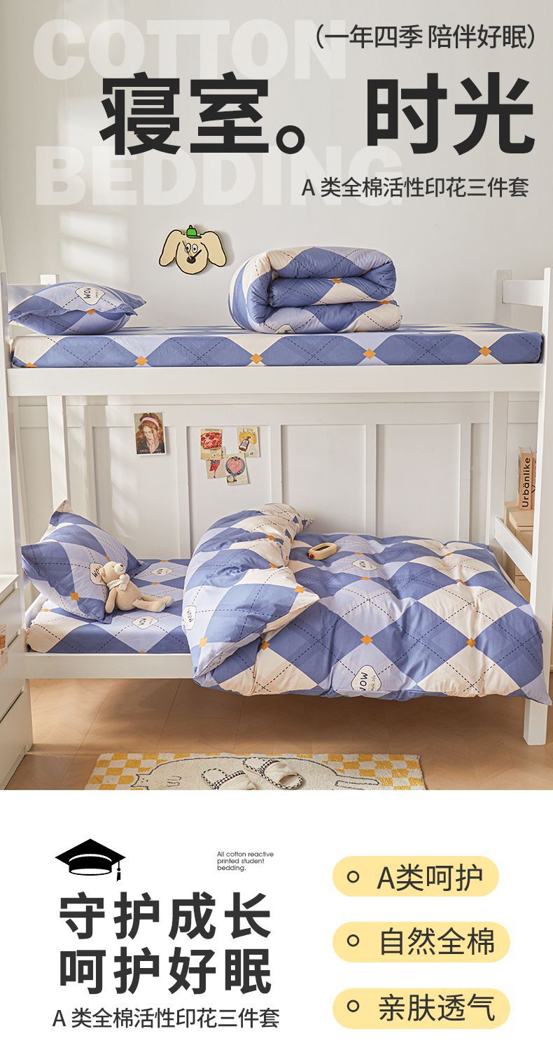 当前位置: 91家纺网 > 商品网购 > 床品套件 > 三件套 > 名优家纺 2024新款全棉三件套学生宿舍上下铺套件 意林蓝色