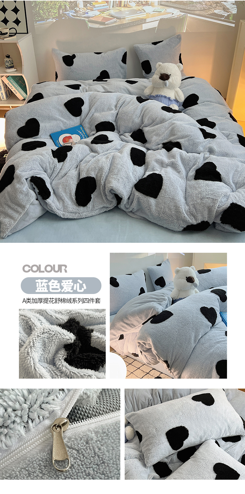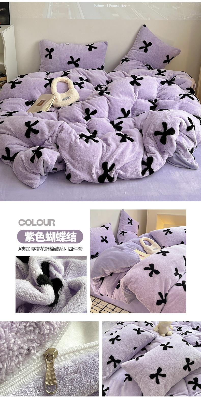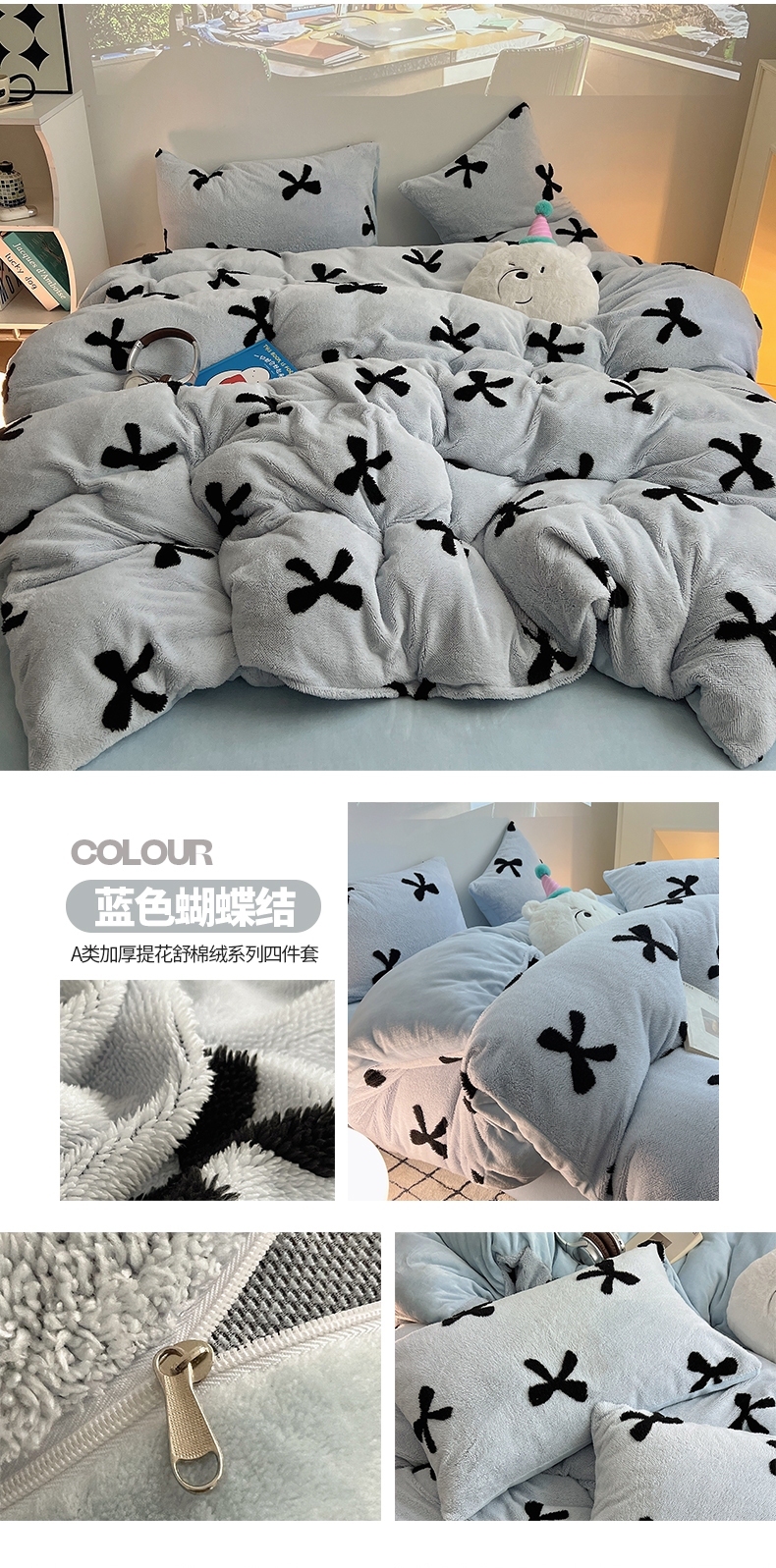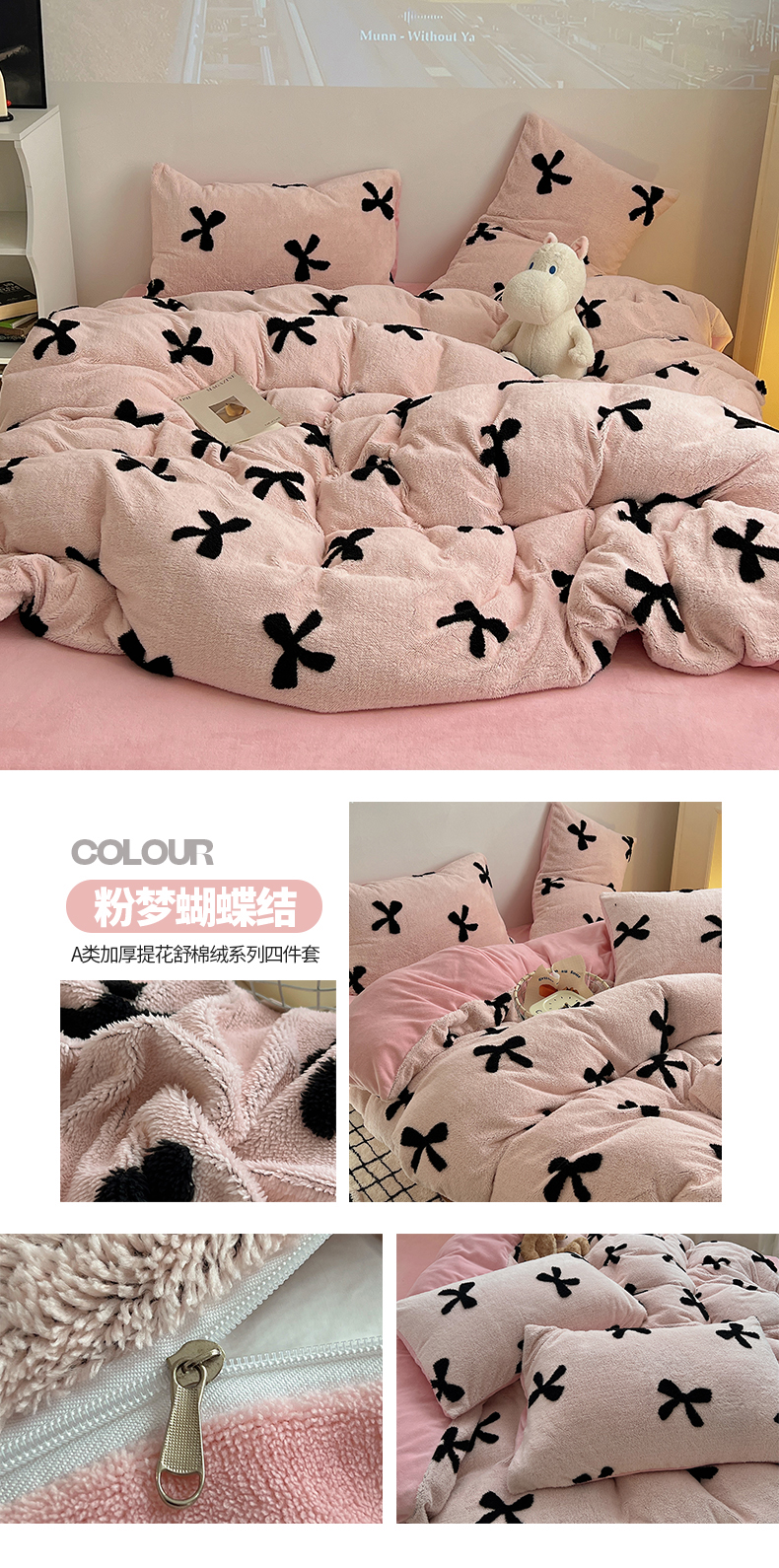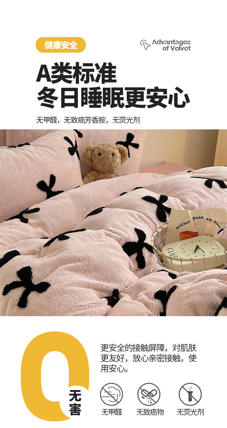 商品名称:(总)2024新款A类加厚色纱舒舒绒提花蝴蝶结爱心少女舒棉绒牛奶绒系列四件套