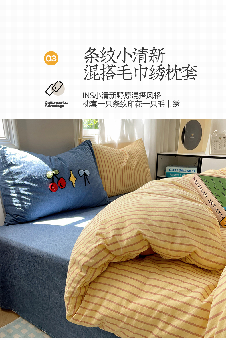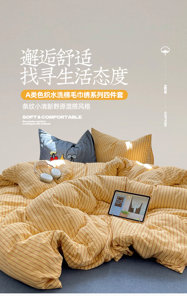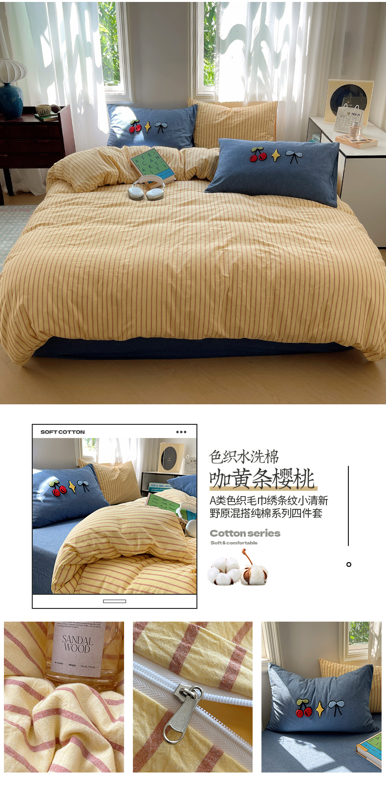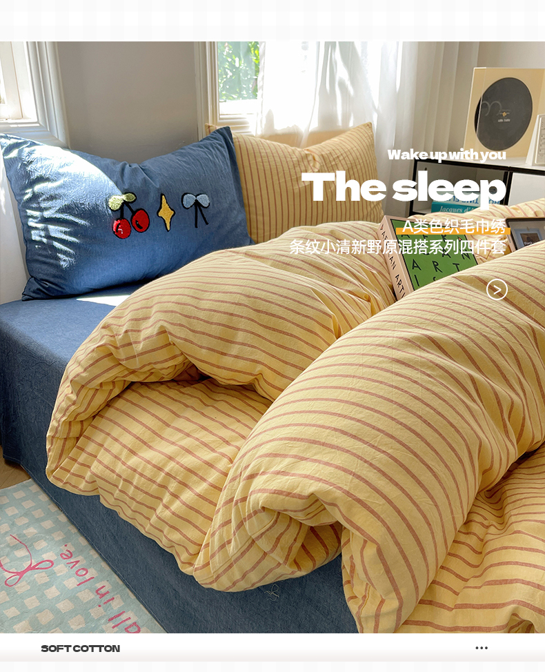 当前位置: 91家纺网 > 商品网购 > 床品套件 > 四件套 > 其它四件套 > 桃子家居 2024新款A类色织毛巾绣条纹小清新野原混搭纯棉系列四件套 色织水洗棉-咖黄条樱桃