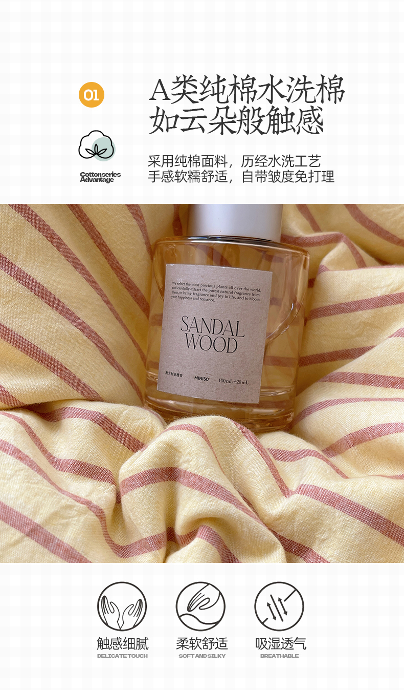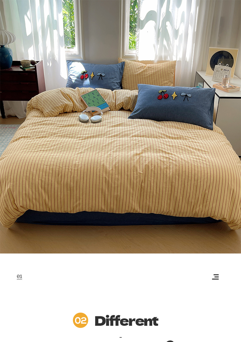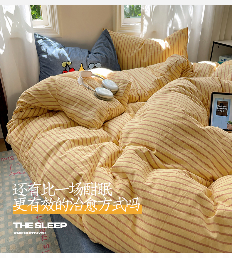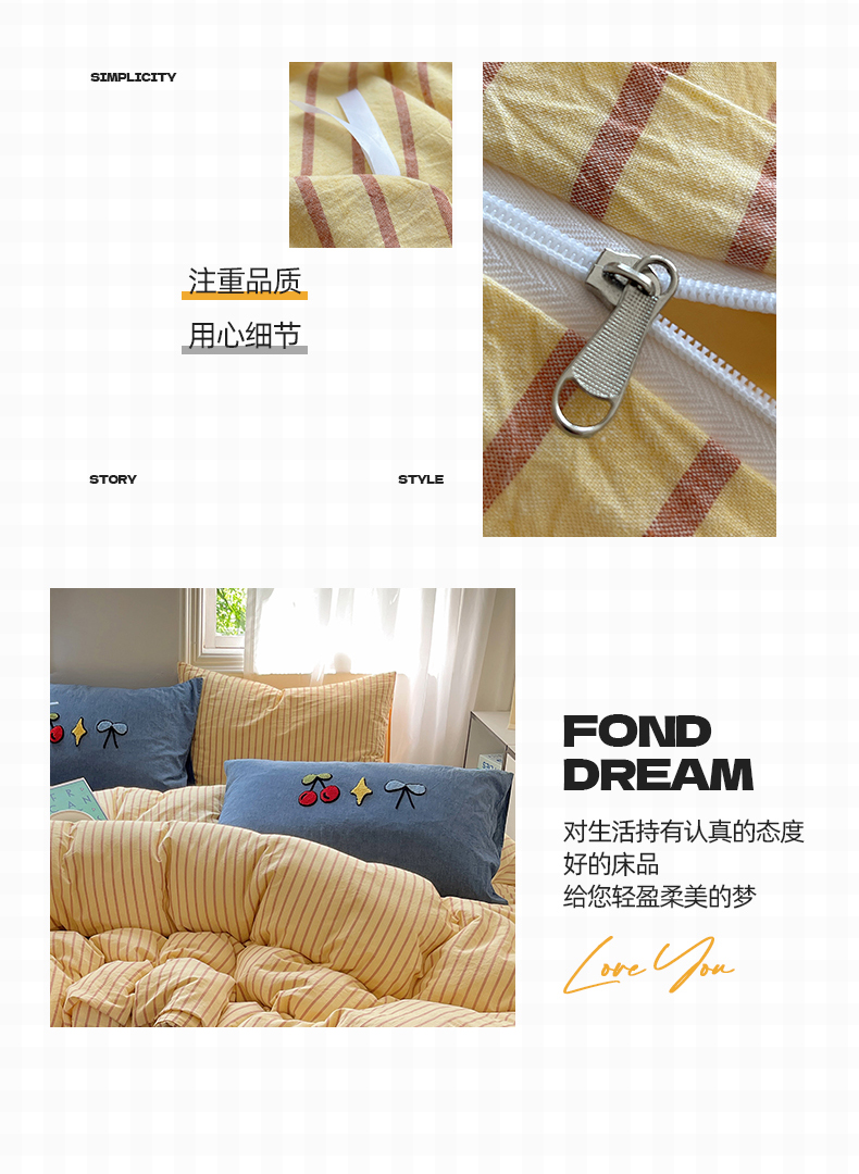 当前位置: 91家纺网 > 商品网购 > 床品套件 > 四件套 > 其它四件套 > 桃子家居 2024新款A类色织毛巾绣条纹小清新野原混搭纯棉系列四件套 色织水洗棉-咖黄条樱桃