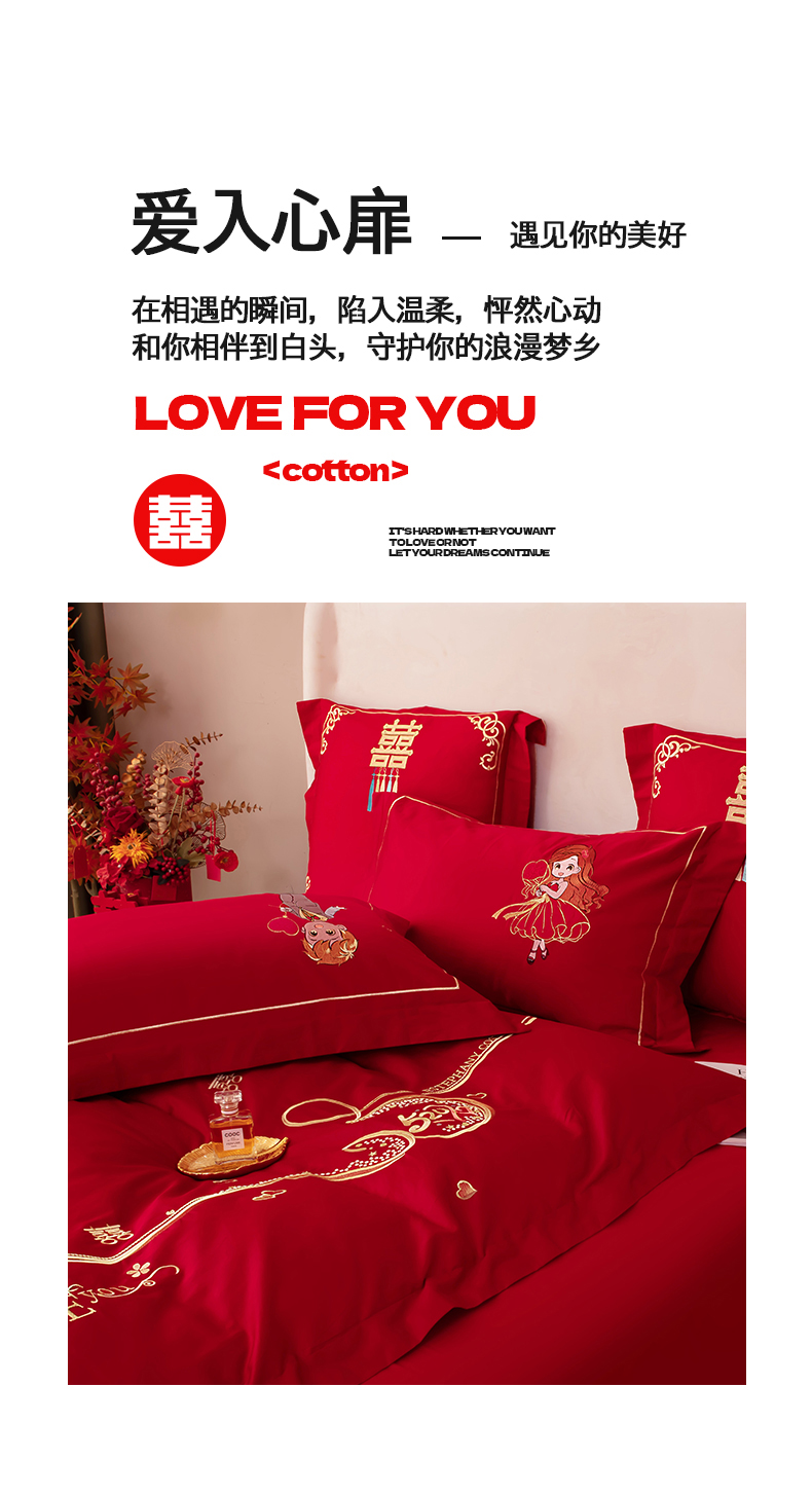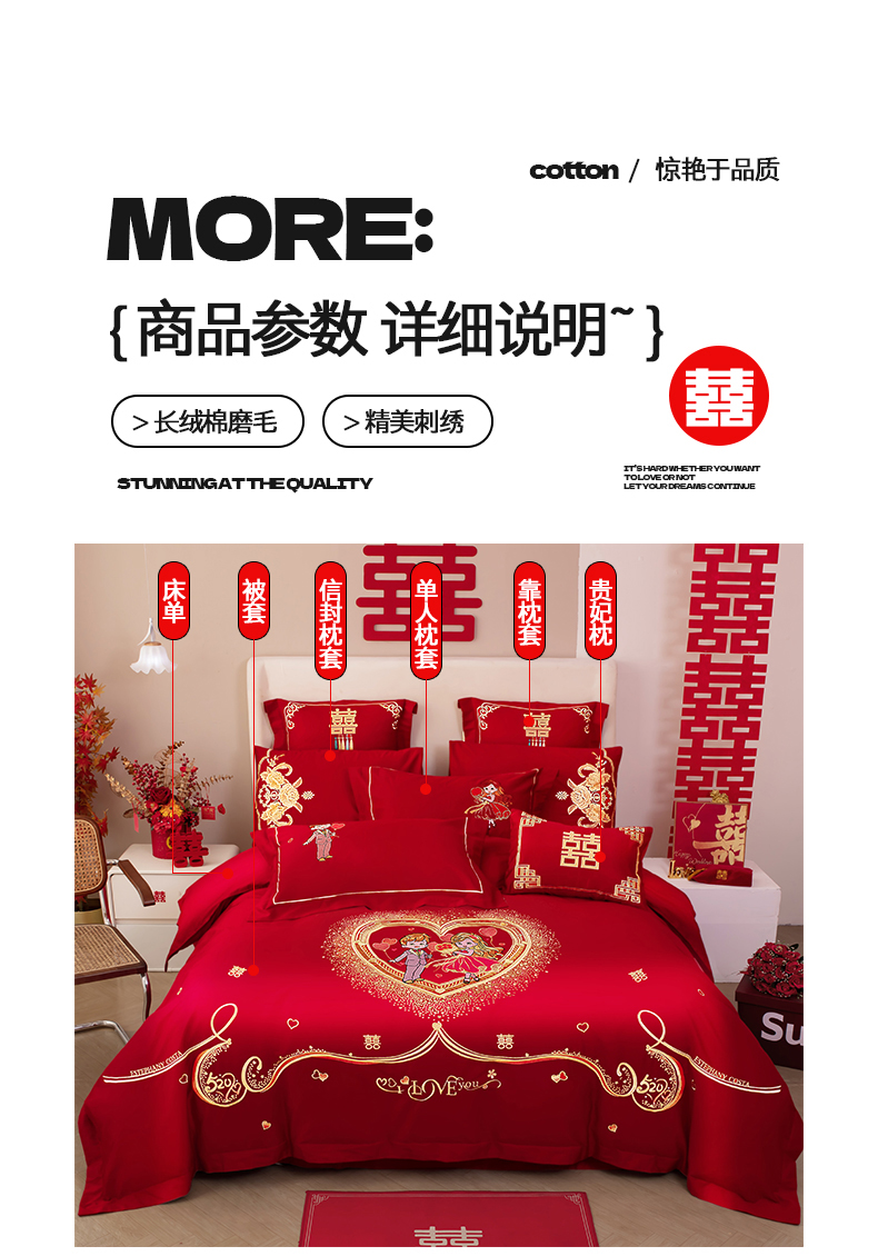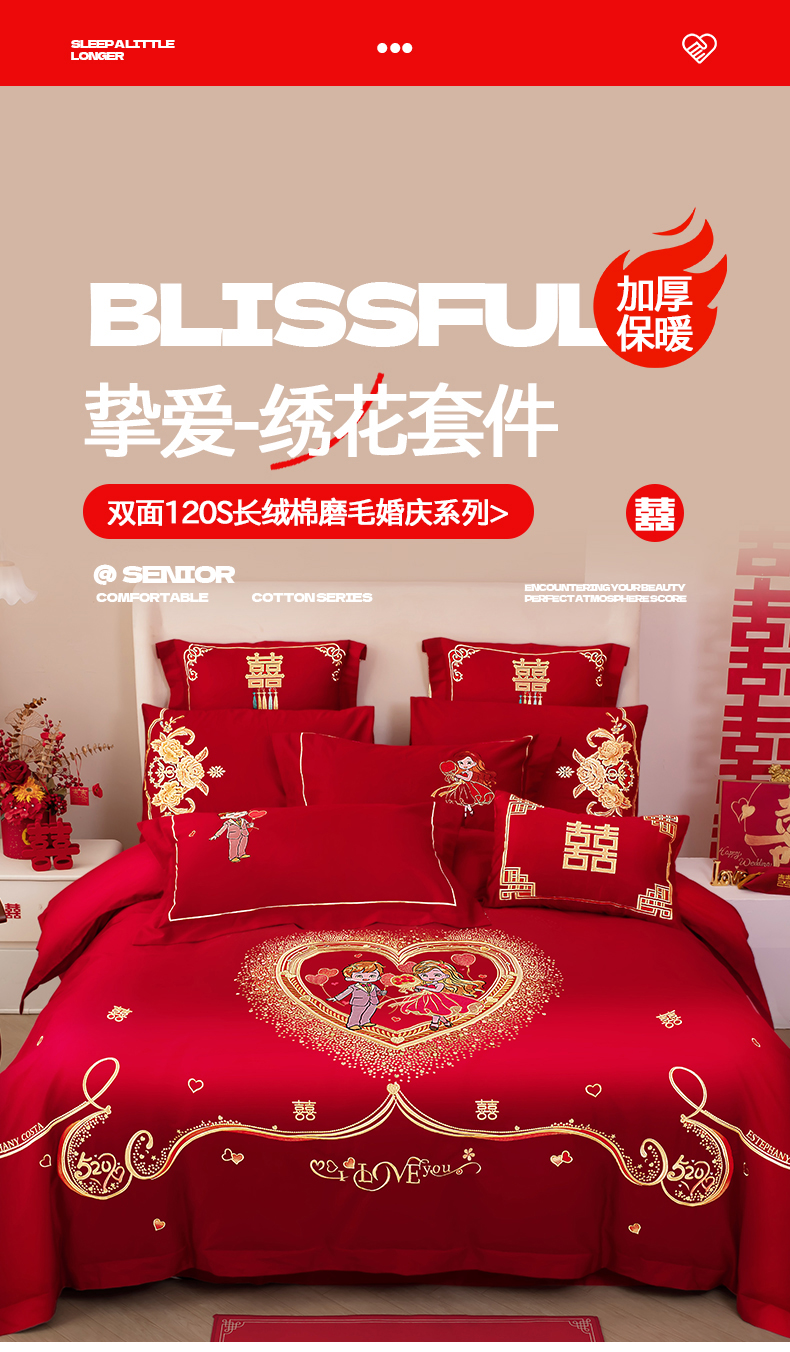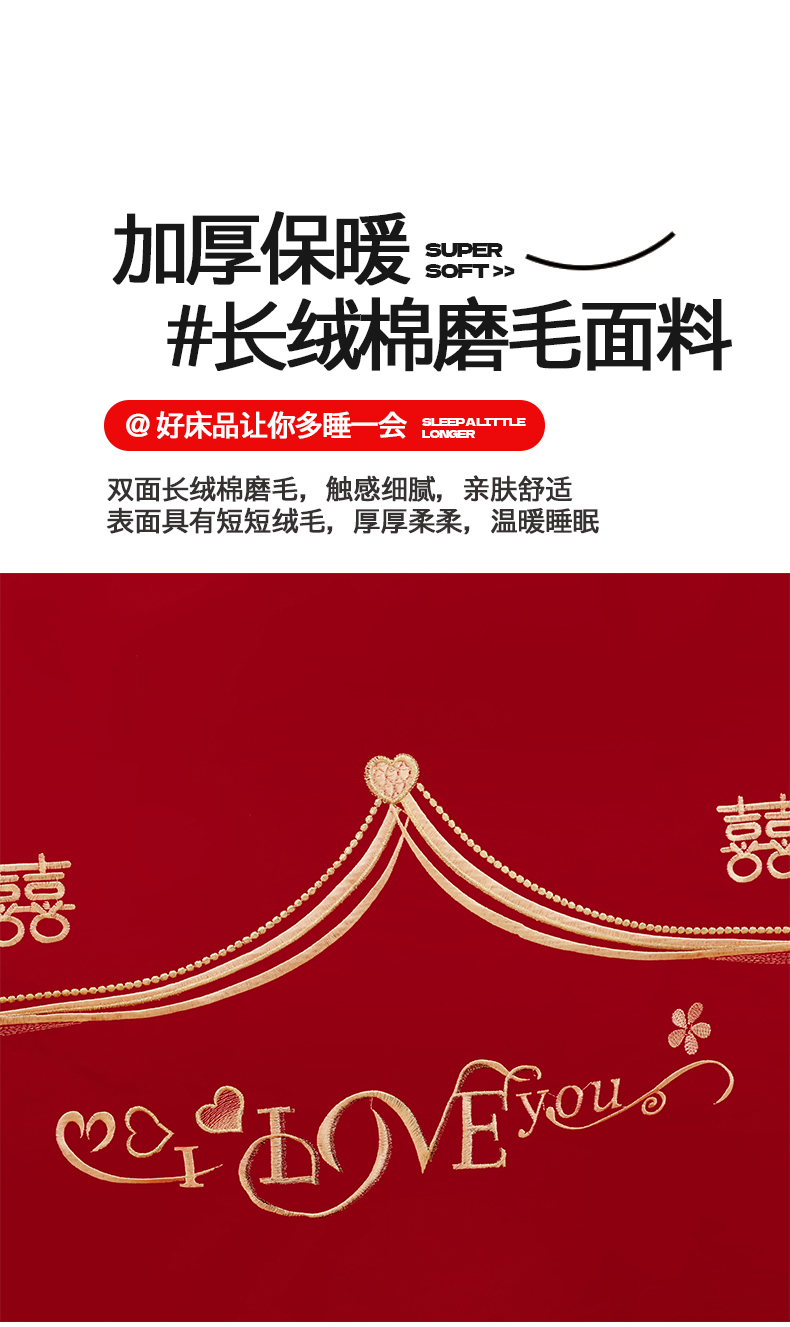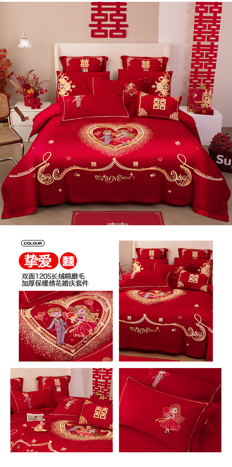 当前位置: 91家纺网 > 商品网购 > 床品套件 > 四件套 > 婚庆四件套 > 千禧家纺 2024新款双面长绒棉磨毛加厚保暖绣花婚庆套件 挚爱