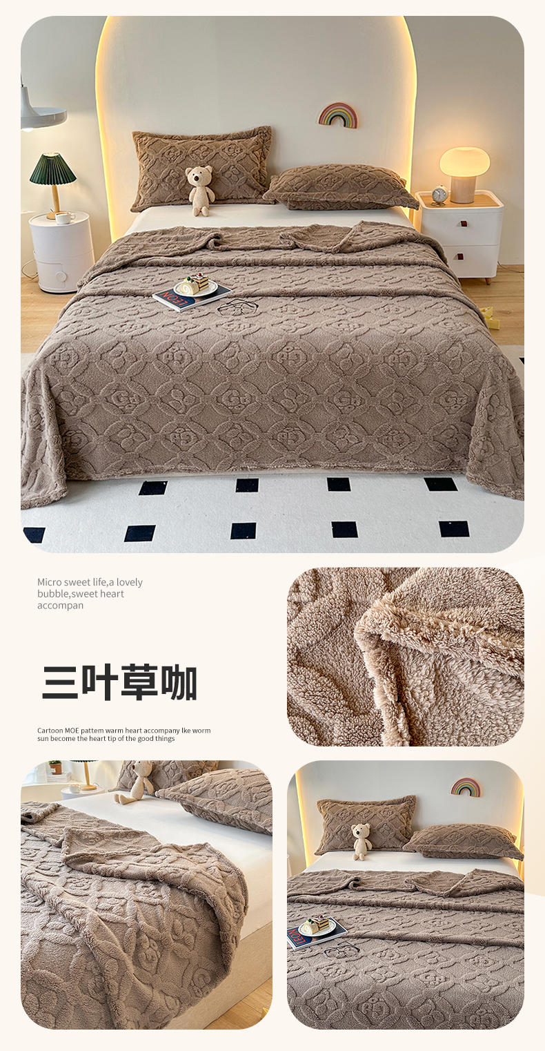 商品名称:悦织湾家纺 2025直播爆款外贸出口跨境热销款三叶草塔芙绒毛毯 三叶草咖