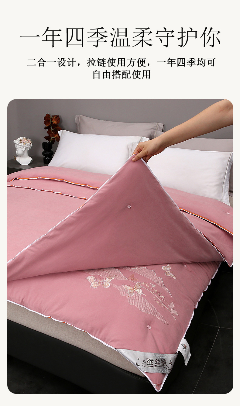 (总)恒鑫 2025新款全棉绣花桑蚕丝冬被春秋被拉链二合一子母被,红色,青雾蓝,轻柔玉,夏云灰,香芋紫,月光白