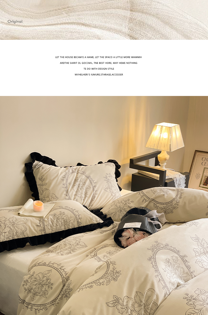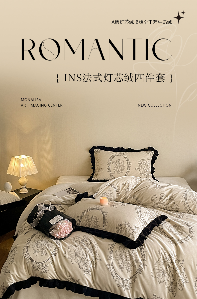 商品名称:羚羊语家纺 2024新款轻法式赫本风灯芯绒四件套提花立体韩版花边牛奶绒三件套 艺境