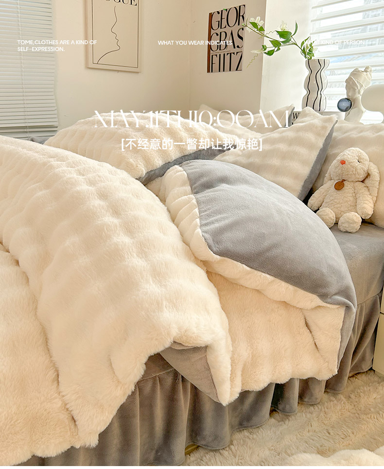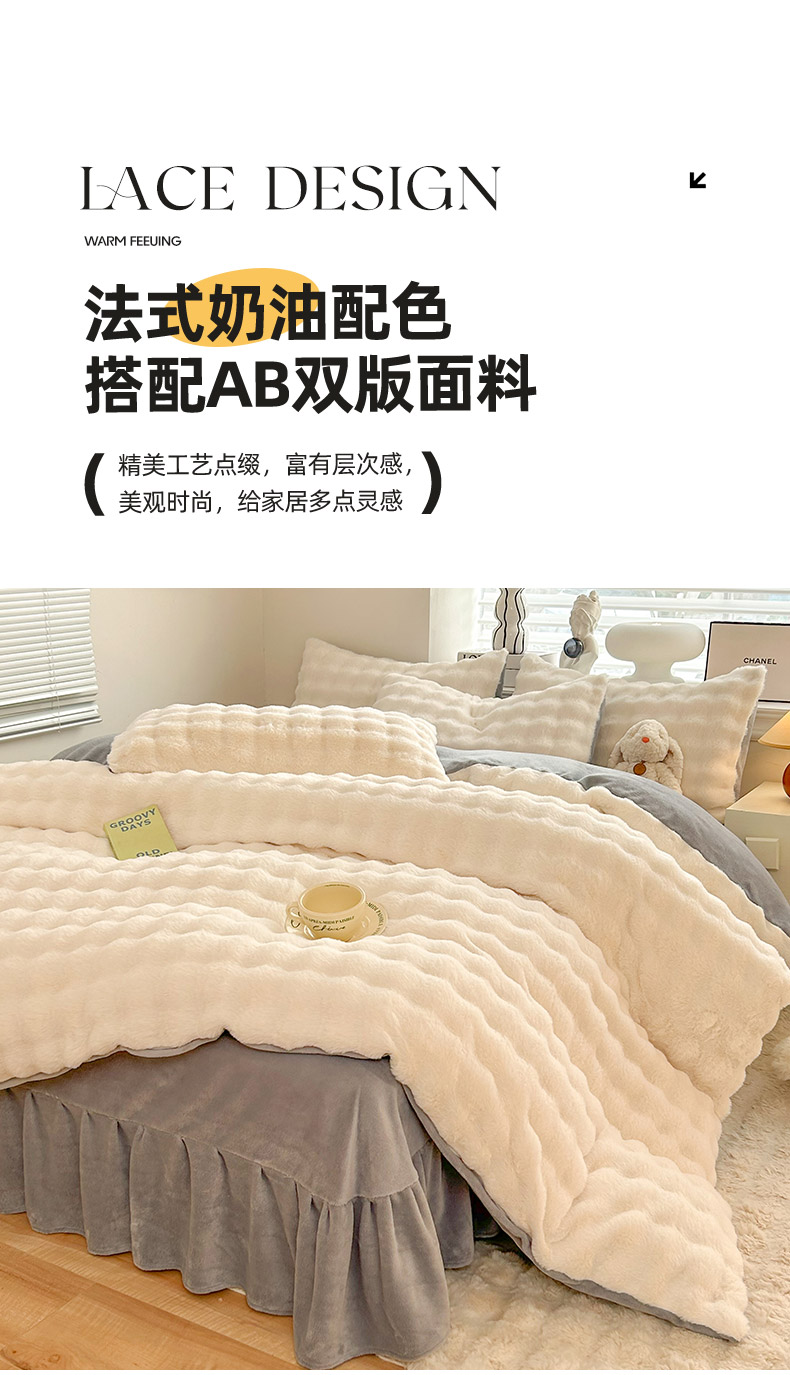 欧冠家纺 2024秋冬新款纯色泡泡绒和七彩泡泡床裙款四件套 蓝泡泡-奶白灰