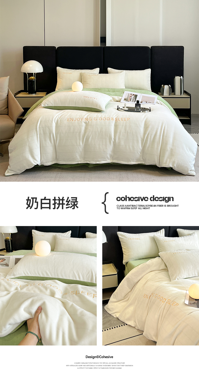 澳梵家居 2024新款牛奶绒刺绣四件套--【山岚系列】 奶白拼绿