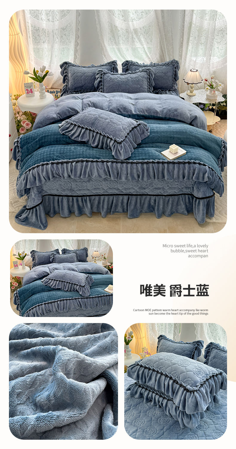 当前位置: 91家纺网 > 商品网购 > 床品套件 > 四件套 > 牛奶绒四件套 > 铠畅家纺 2025新款牛奶绒花边床盖四件套-唯美 唯美爵士蓝