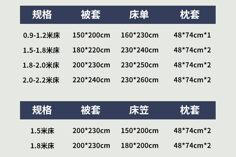 标准被套配1.8床笠:被套200*230 床笠180*200 枕套48*74*2 | ¥67.00 |