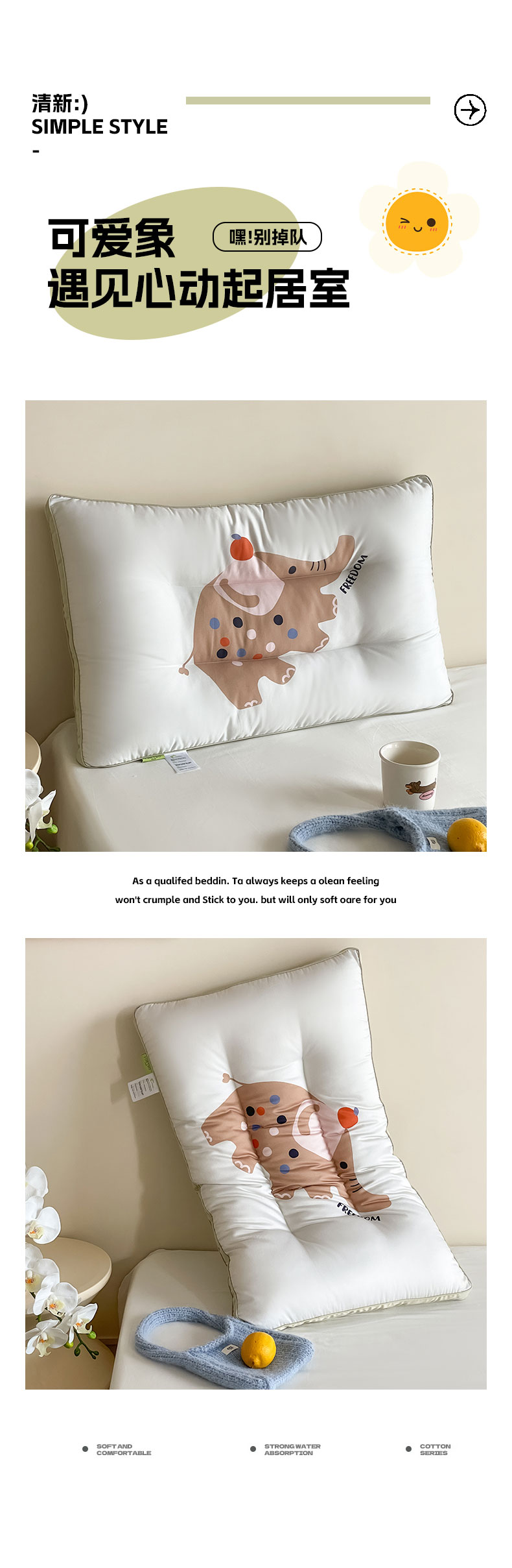 当前位置: 91家纺网 > 商品网购 > 枕头/枕芯/保健枕/颈椎枕 > 普通枕芯 > FORTWO家纺 2024新款全棉50数码印花羽丝绒枕头 可爱象