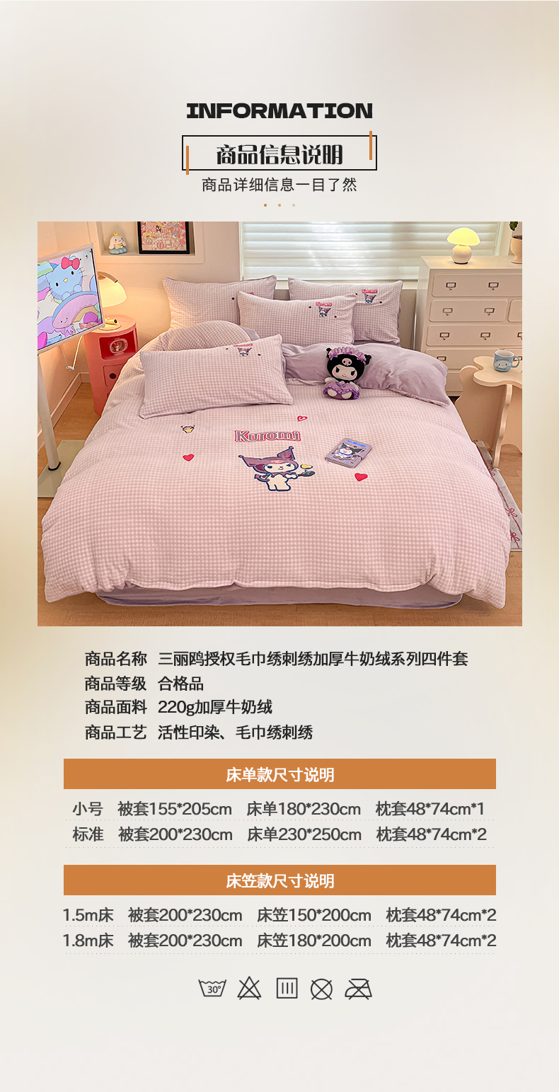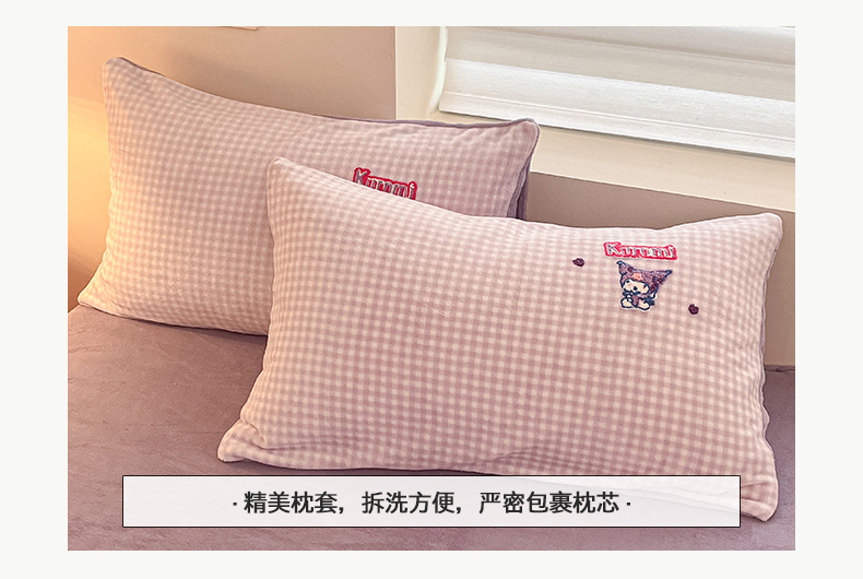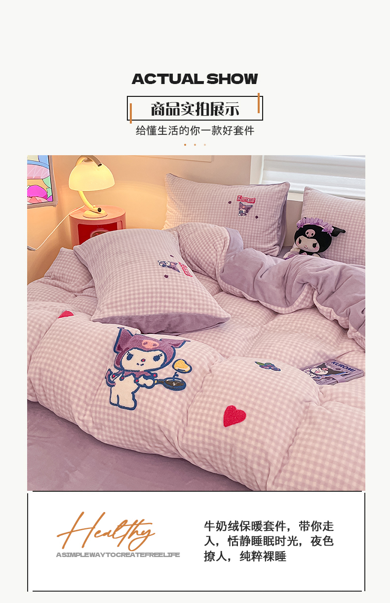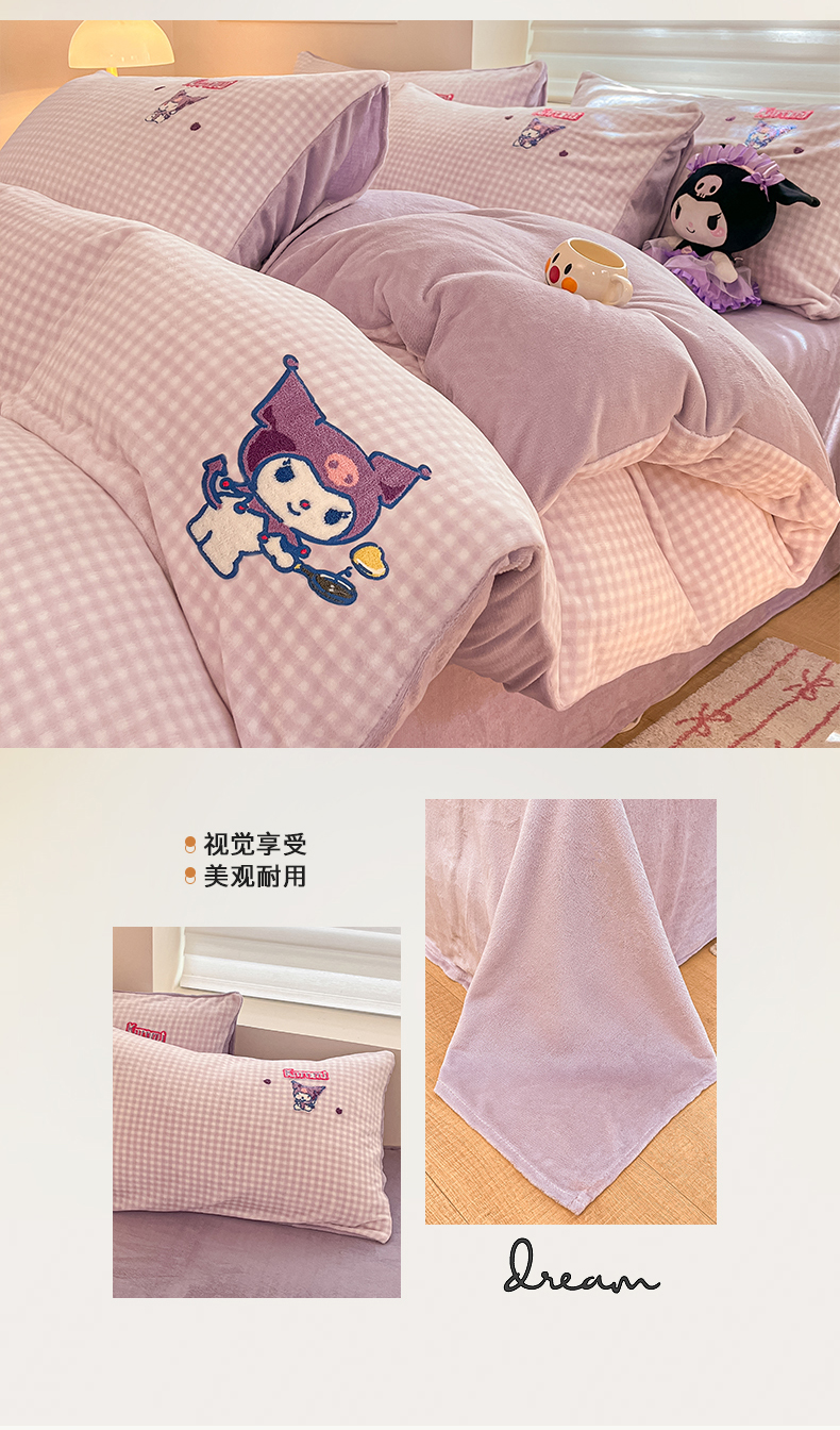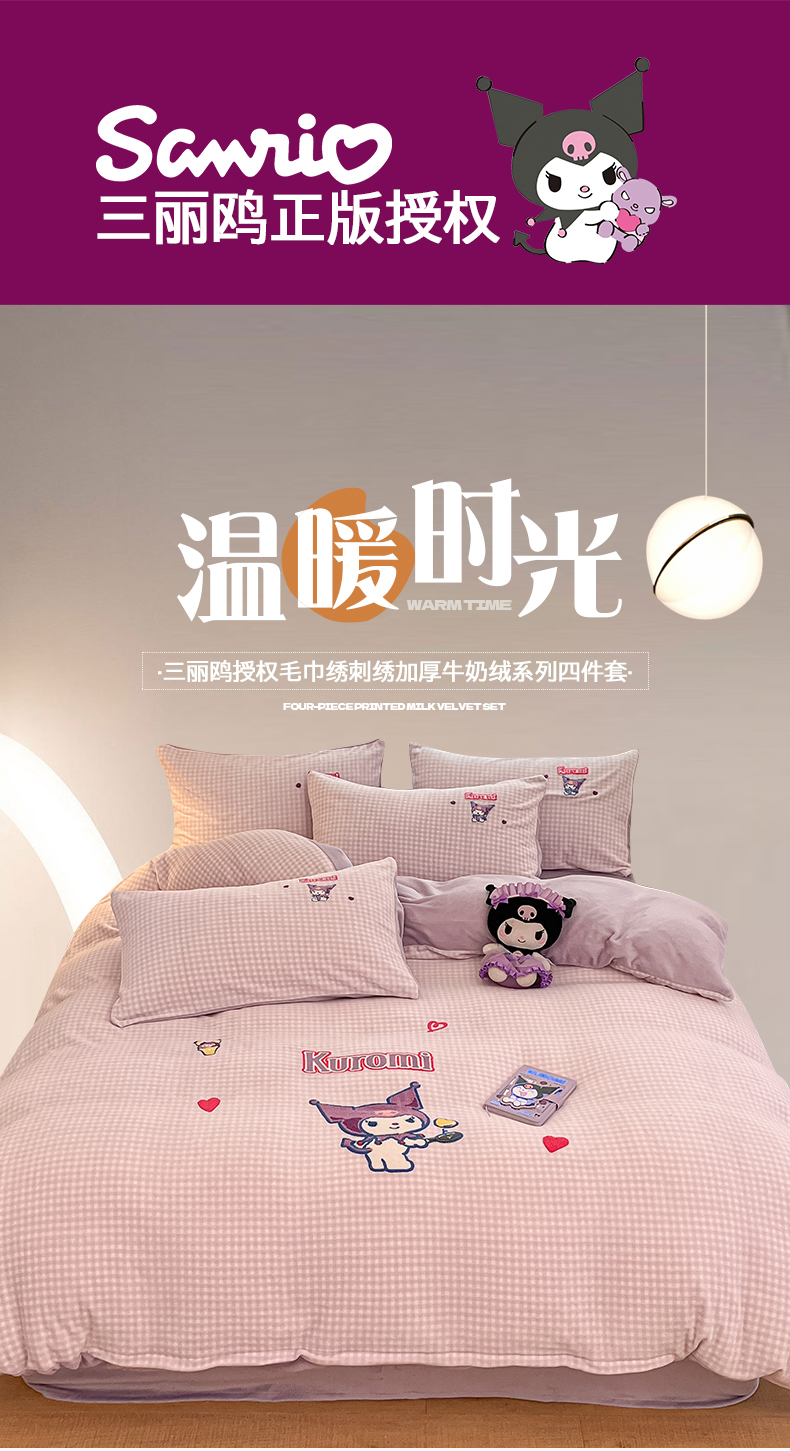 当前位置: 91家纺网 > 商品网购 > 床品套件 > 四件套 > 牛奶绒四件套 > 金爱家 2024新款正版三丽鸥授权毛巾绣刺绣工艺加厚牛奶绒系列四件套 绒毛巾绣-小紫格库洛米