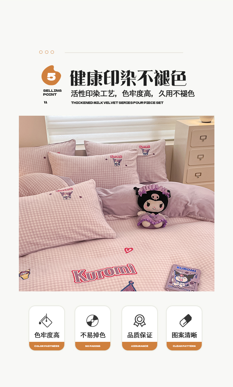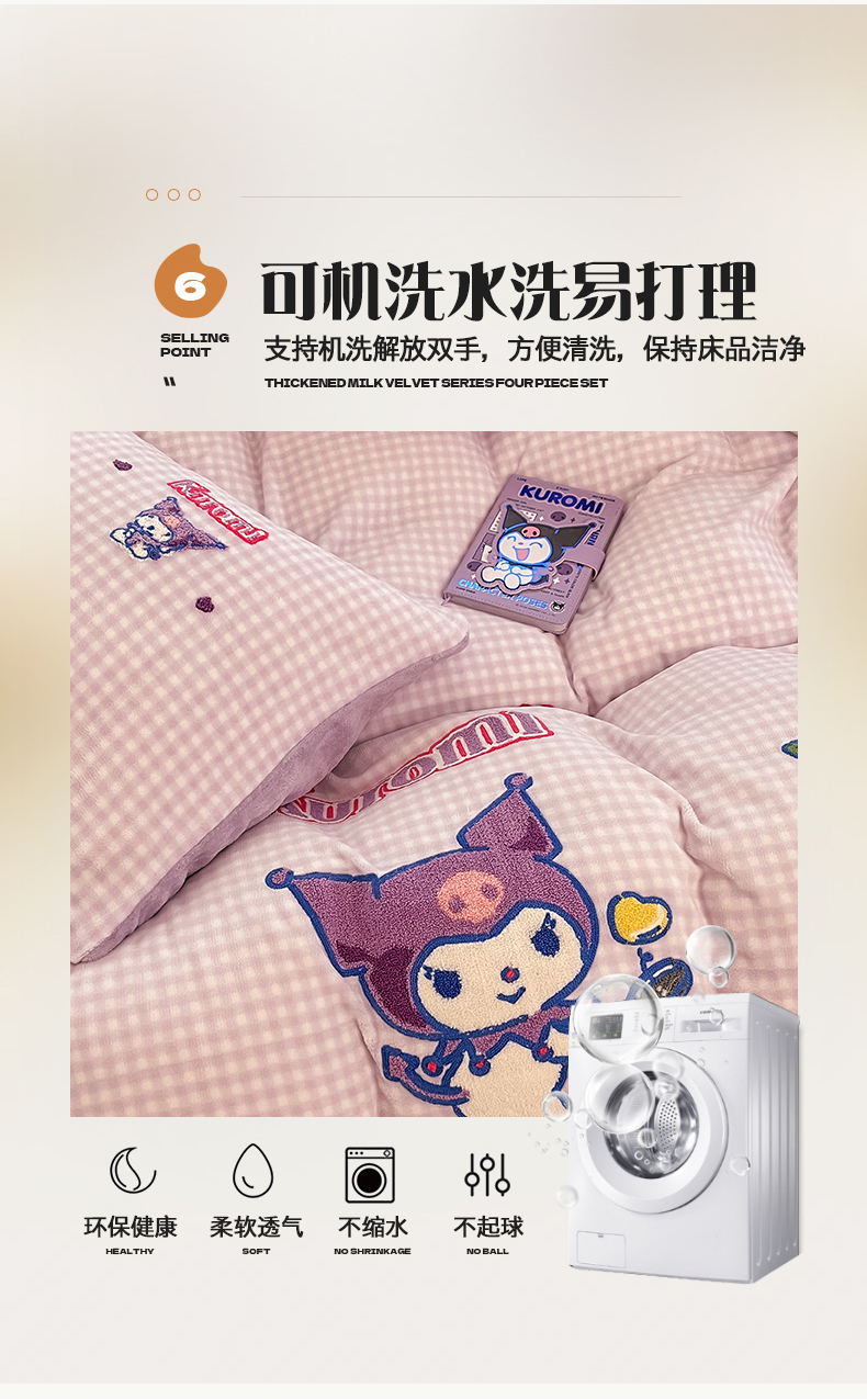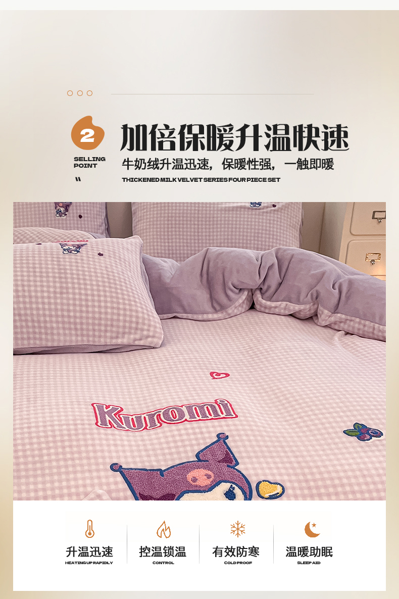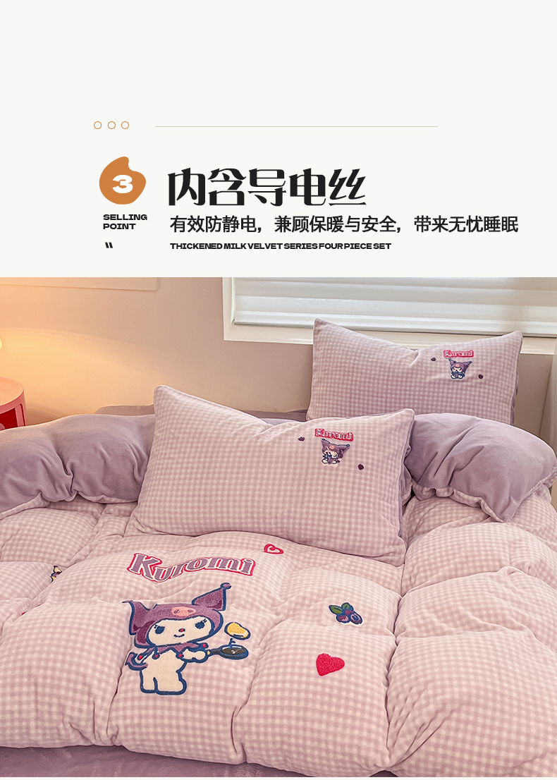 当前位置: 91家纺网 > 商品网购 > 床品套件 > 四件套 > 牛奶绒四件套 > 金爱家 2024新款正版三丽鸥授权毛巾绣刺绣工艺加厚牛奶绒系列四件套 绒毛巾绣-小紫格库洛米