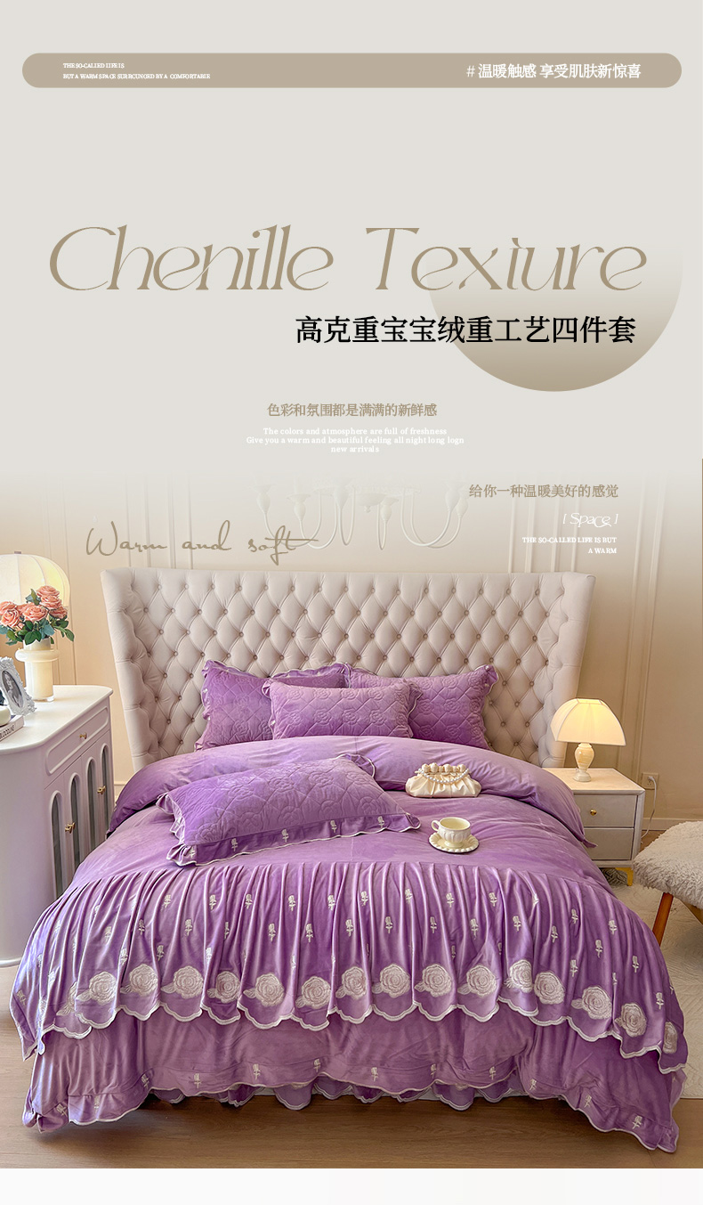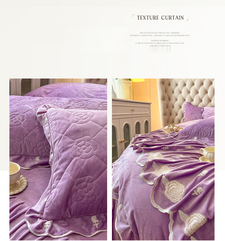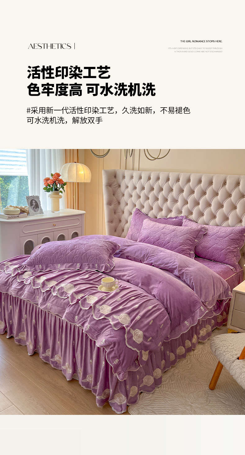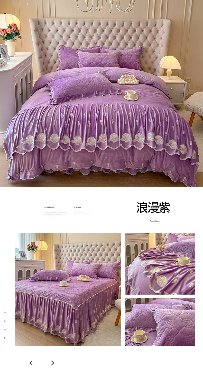 当前位置: 91家纺网 > 商品网购 > 床品套件 > 四件套 > 宝宝绒四件套 > 麒豆豆 2024新款宝宝绒床裙四件套-晨曦玫瑰 晨曦玫瑰-浪漫紫