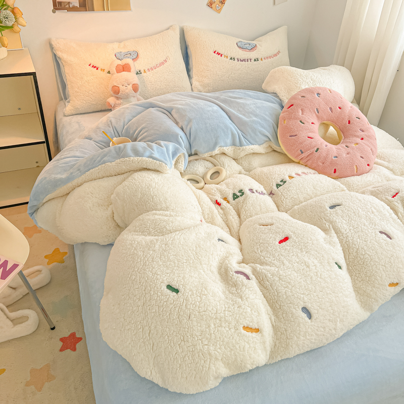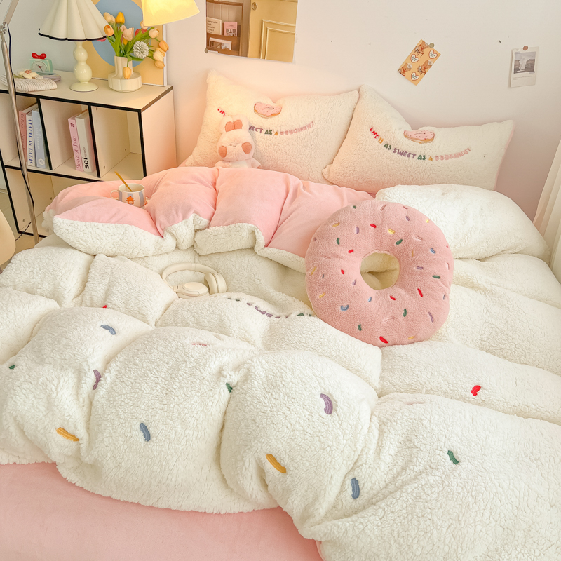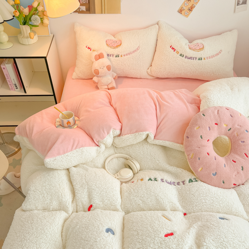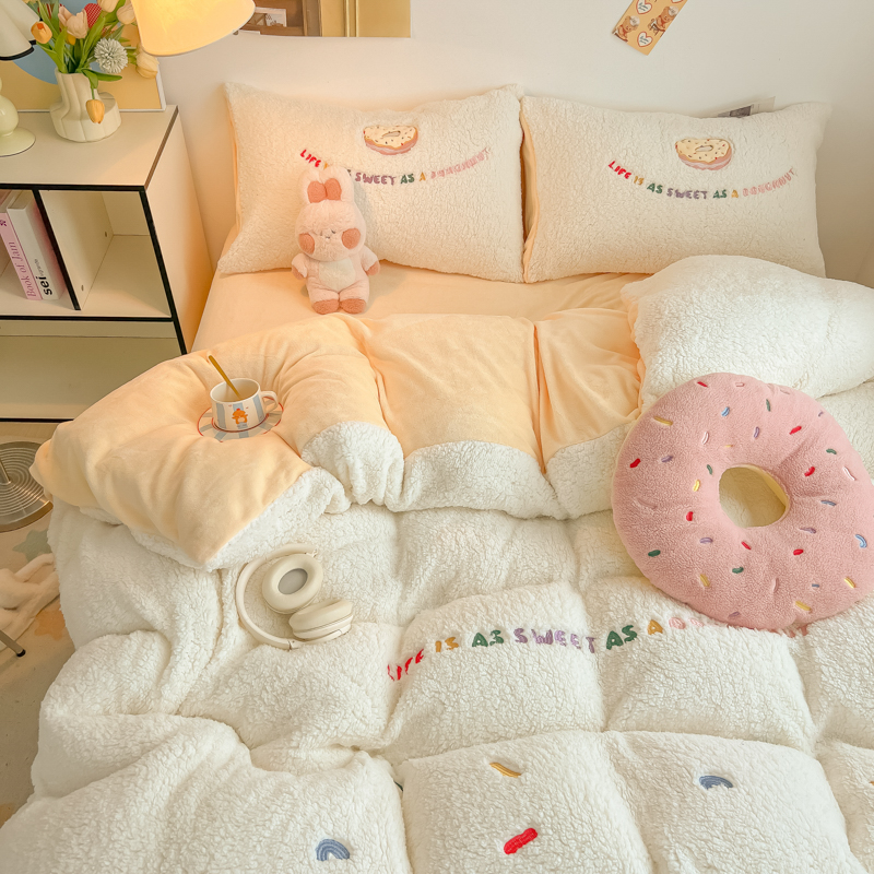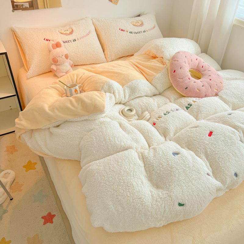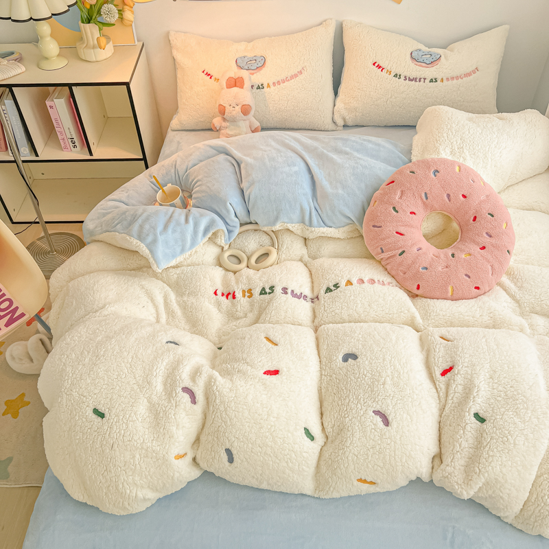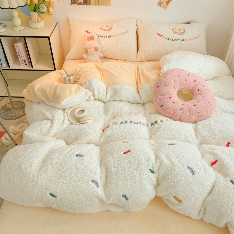 盼季家纺 2024新款高克重羊羔绒牛奶绒刺绣四件套-甜甜圈(风格一) 甜甜圈-奶粉