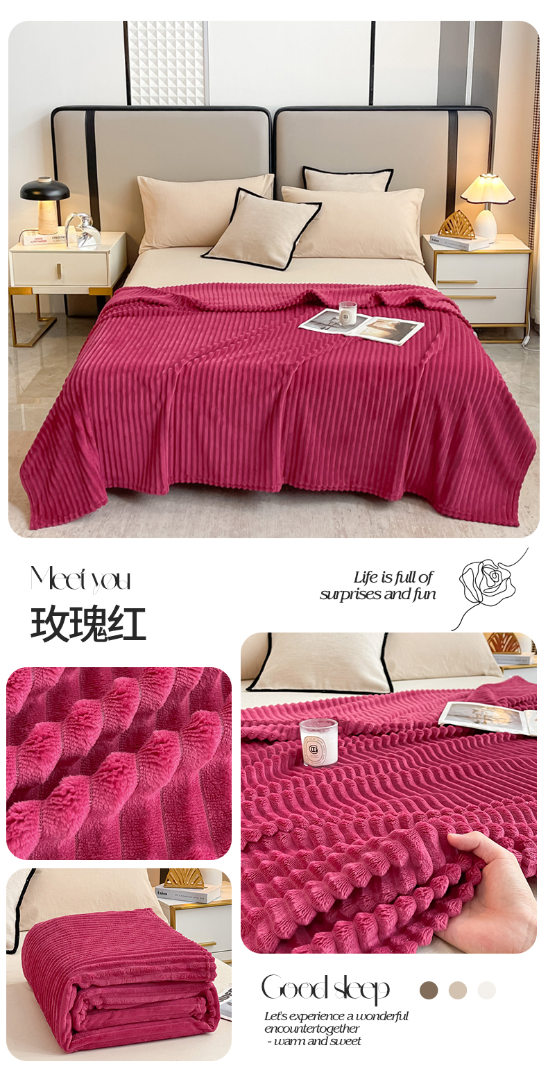 商品名称:一帆毯业 2024新款抽条压缩代发抽空跨境外贸260克兔毛珊瑚法兰绒空调毯子抽条毛毯简约牛奶绒盖毯 玫瑰红