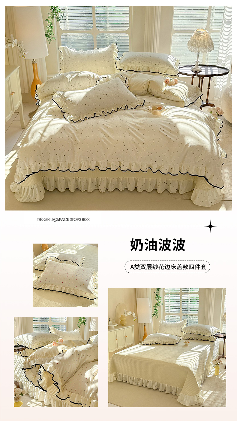 韩约家纺 2025新款1针织双层纱花边款床盖四件套 奶油波波(花边款)