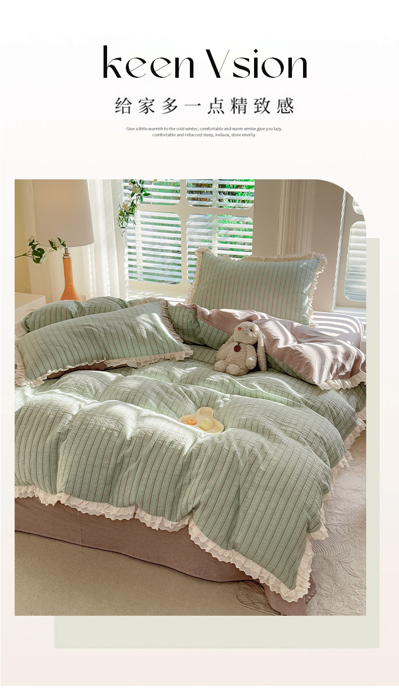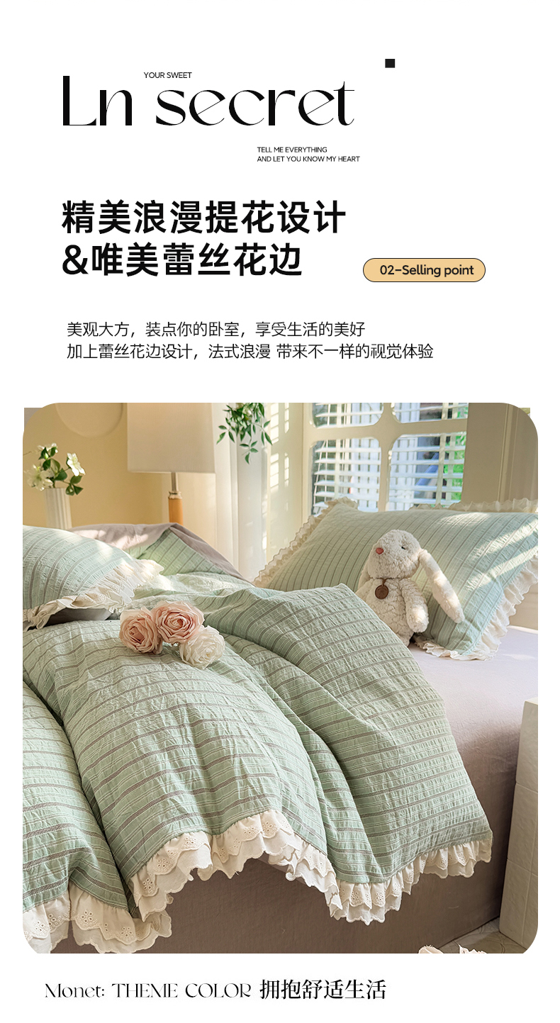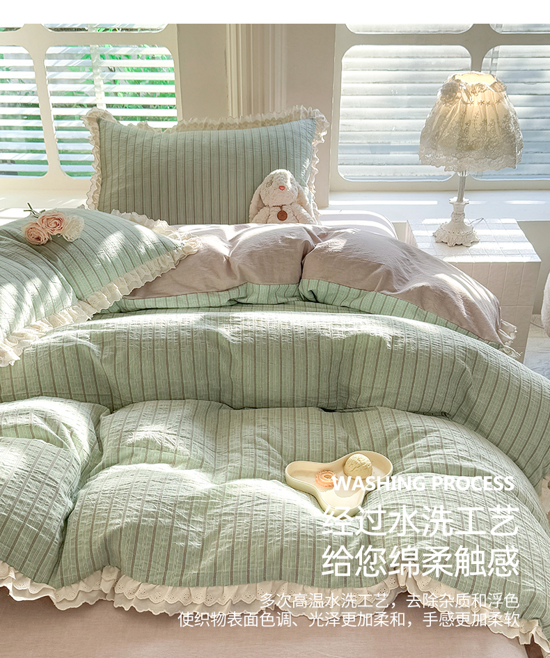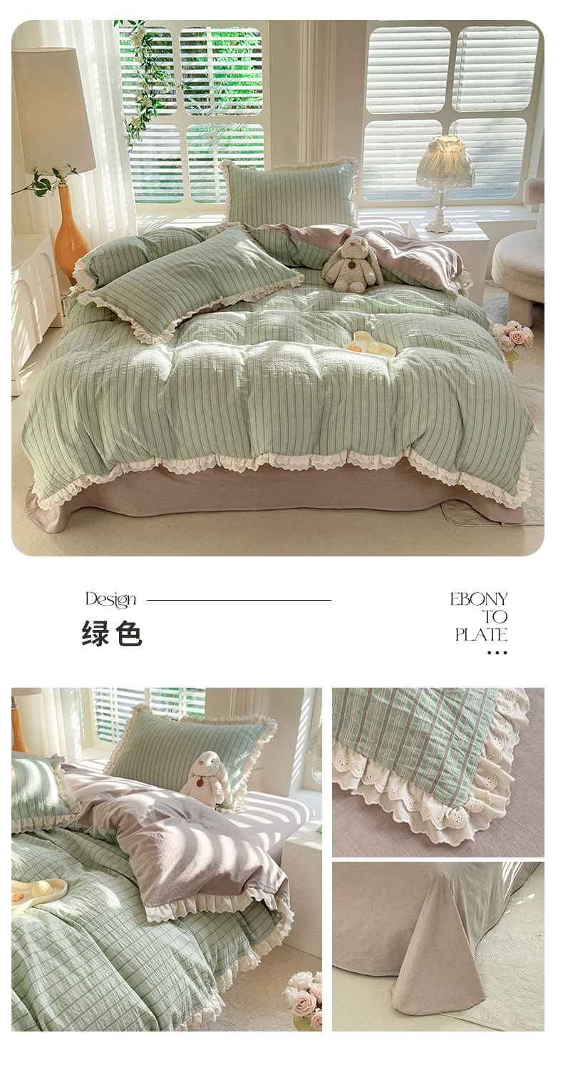 商品名称:棉小二 2025新款全棉色织花边提花水洗棉四件套-麦香 麦香-绿色