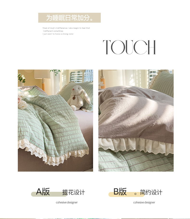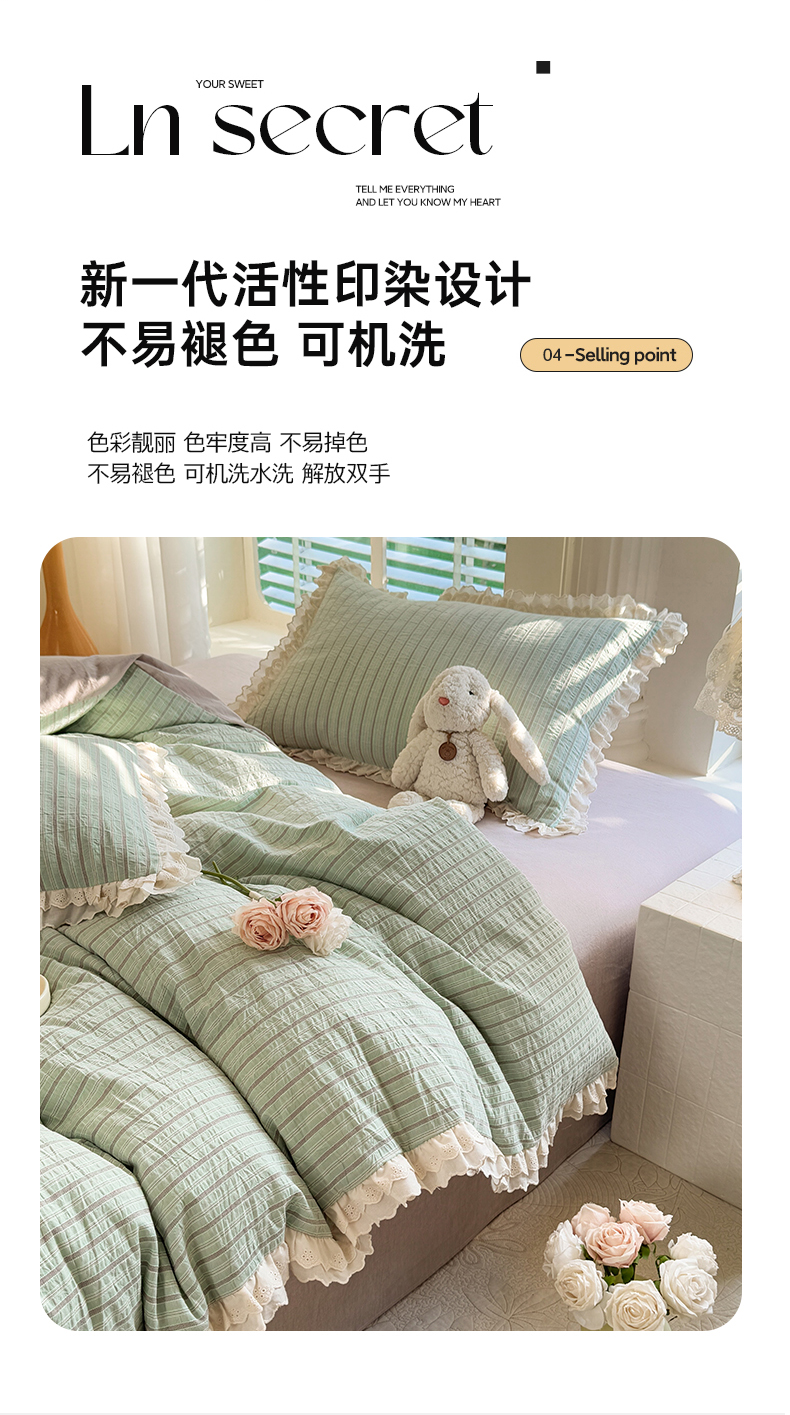 (总)棉小二 2025新款全棉色织水洗棉花边夏被四件套,麦香-兰,麦香-粉,麦香-绿