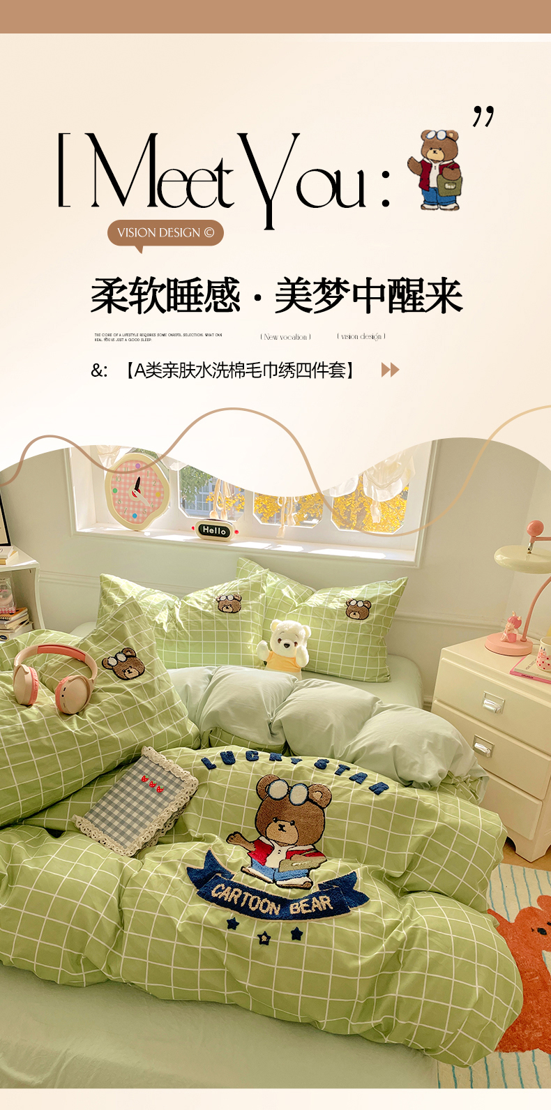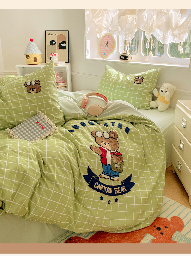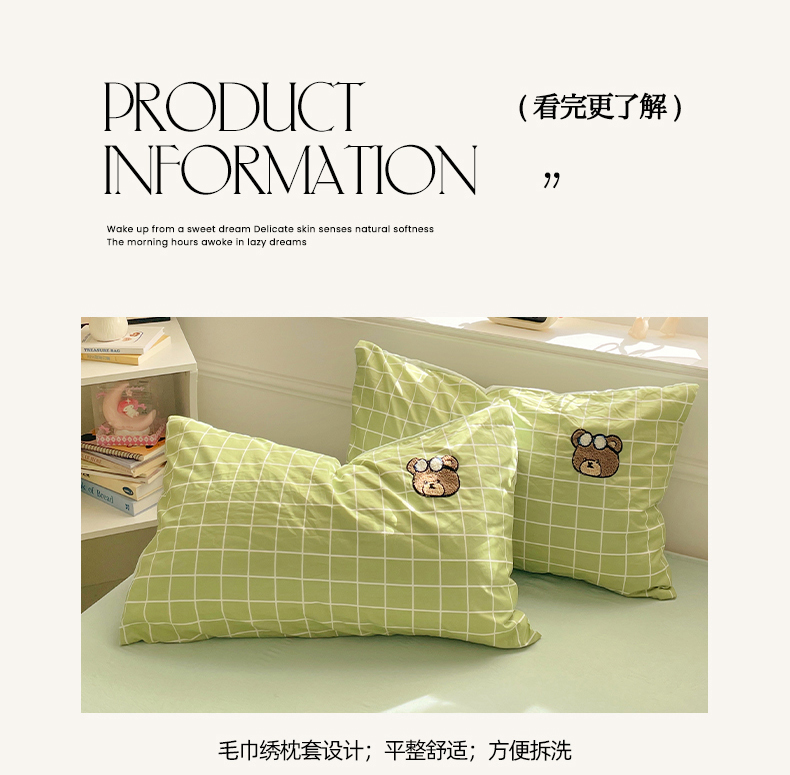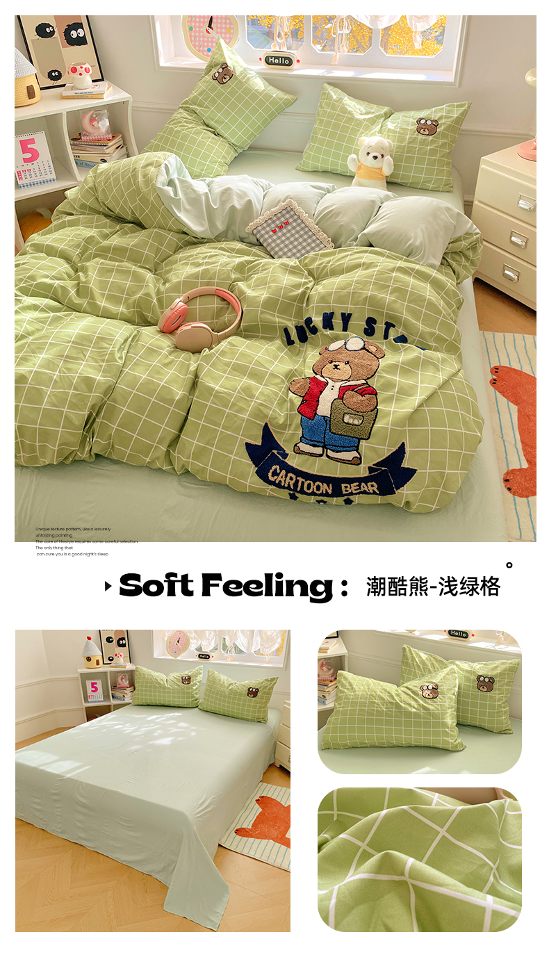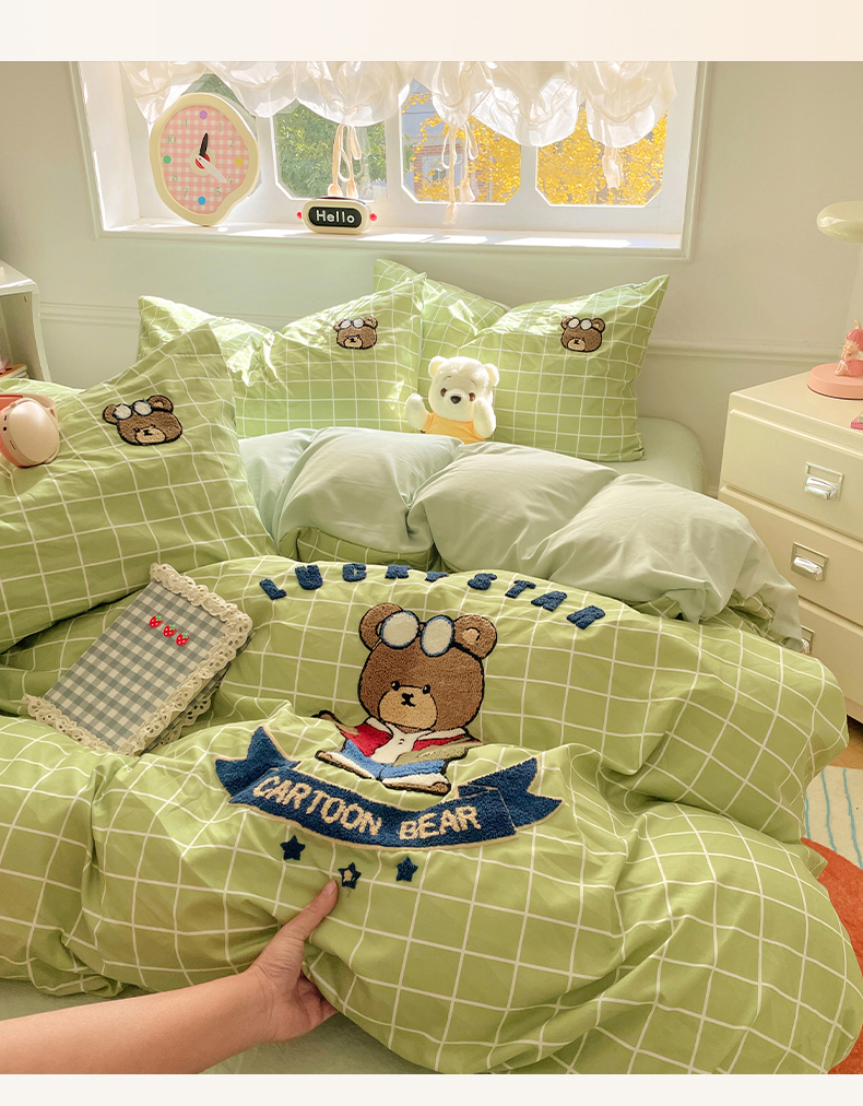 当前位置: 91家纺网 > 商品网购 > 床品套件 > 四件套 > 水洗棉四件套 > 优卡迪家纺馆 2025新款110克水洗棉无印风毛巾绣四件套【下载文件夹包含买家秀】 潮酷熊-浅绿格