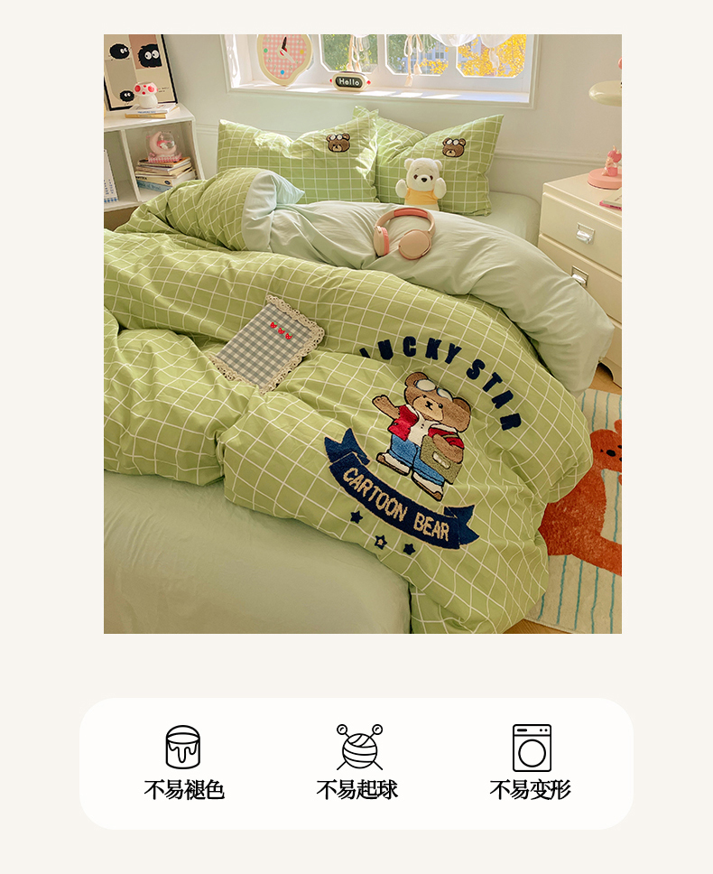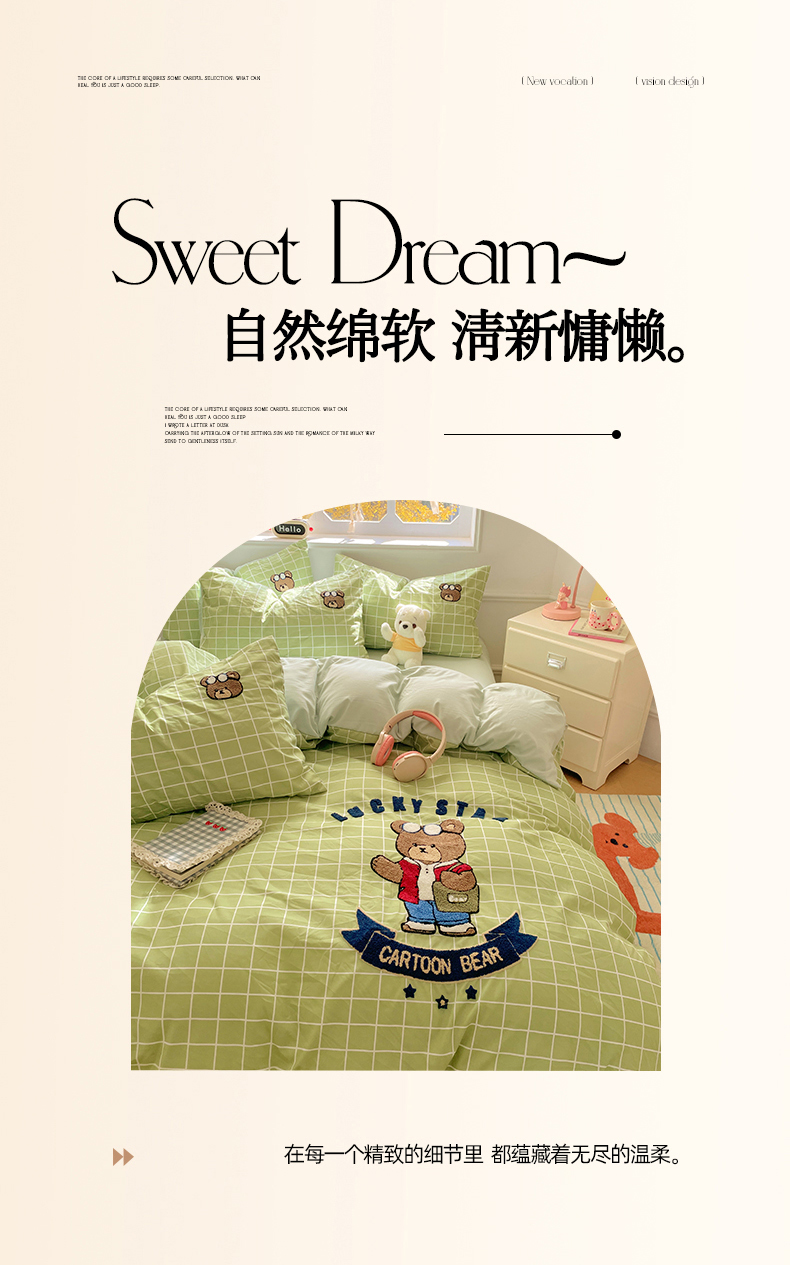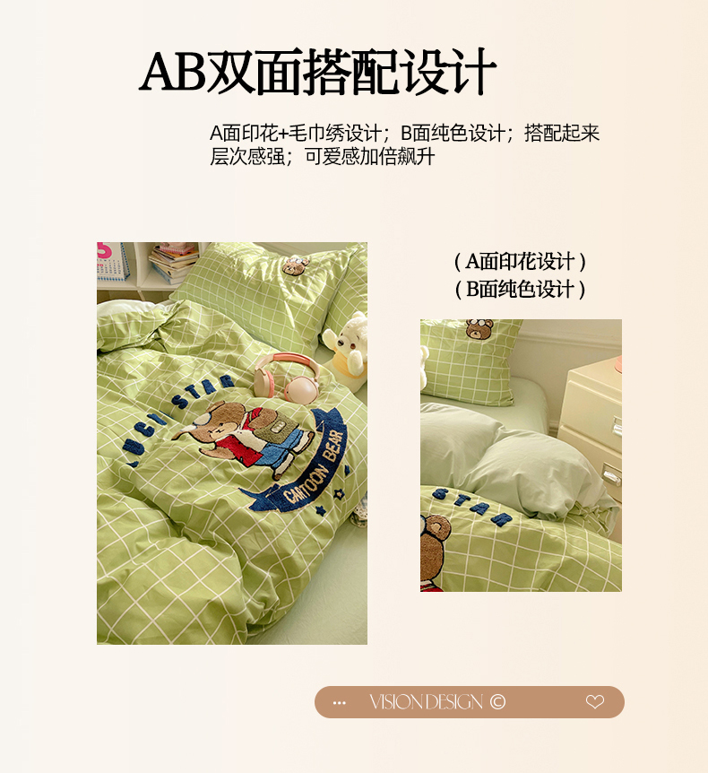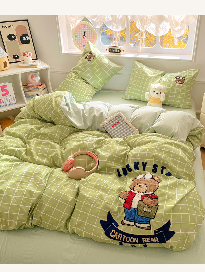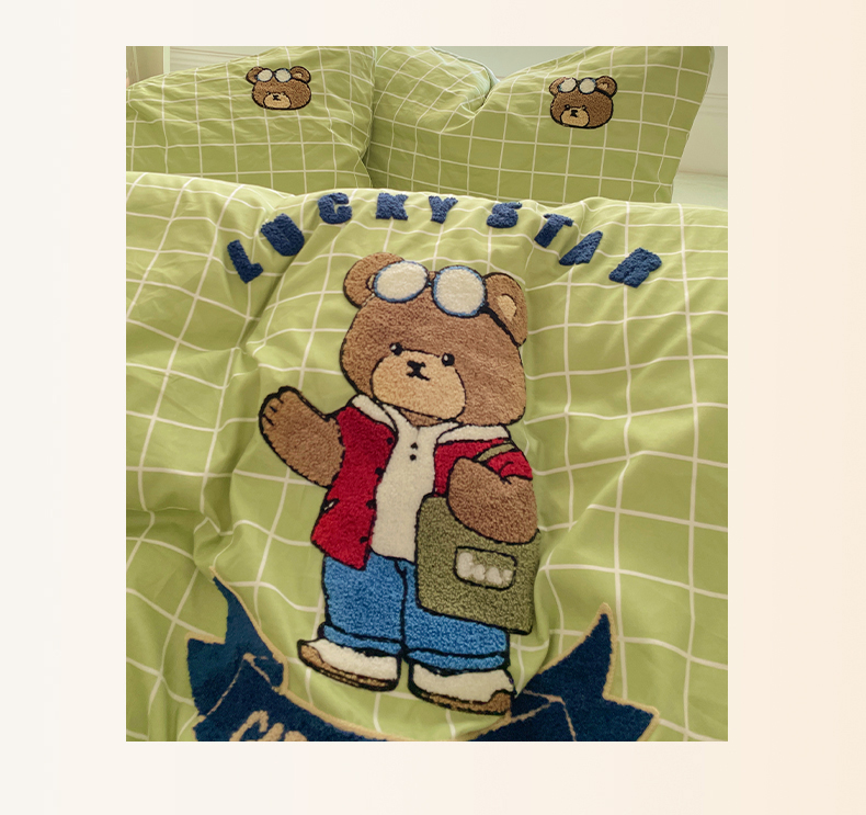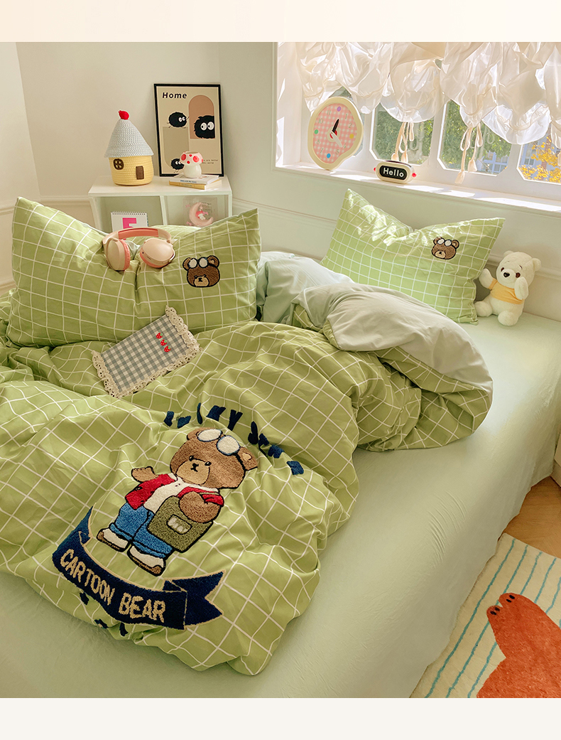 当前位置: 91家纺网 > 商品网购 > 床品套件 > 四件套 > 水洗棉四件套 > 优卡迪家纺馆 2025新款110克水洗棉无印风毛巾绣四件套【下载文件夹包含买家秀】 潮酷熊-浅绿格