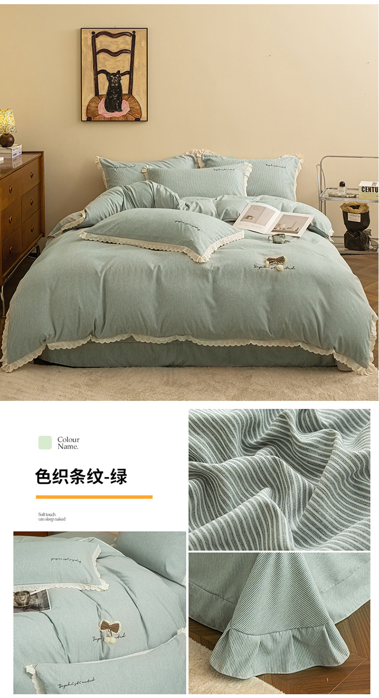 商品名称:庭笙 2025新款无印.色织条纹少女韩式小花边简约条纹四件套 色织条纹.绿