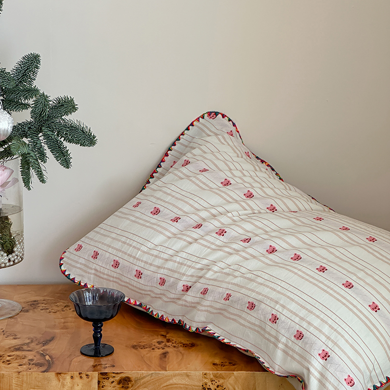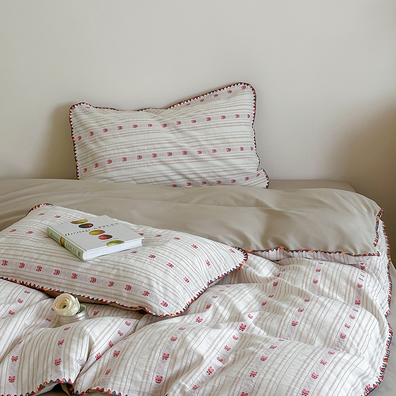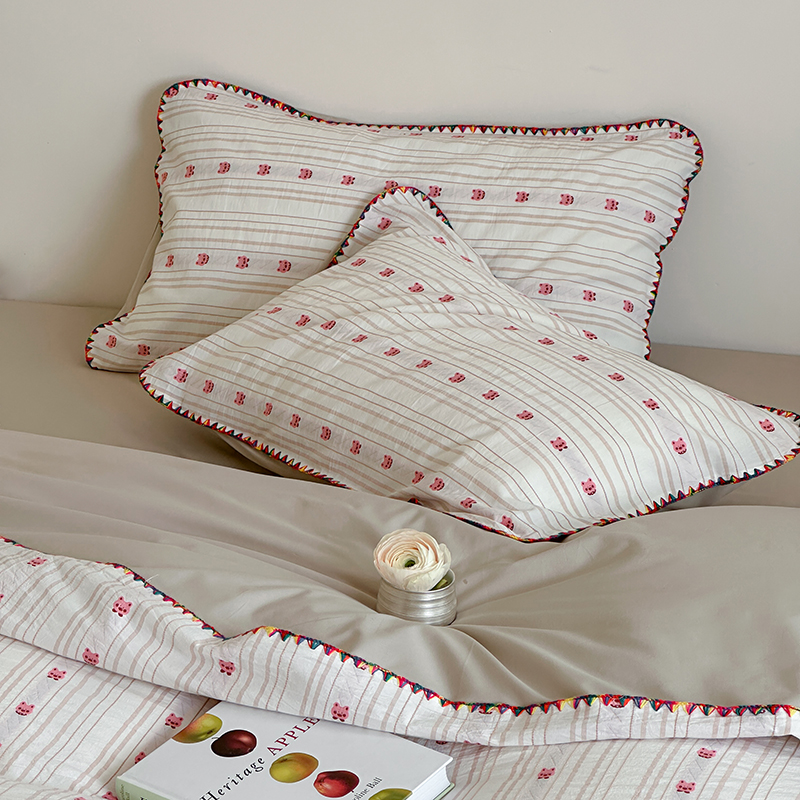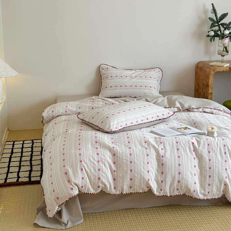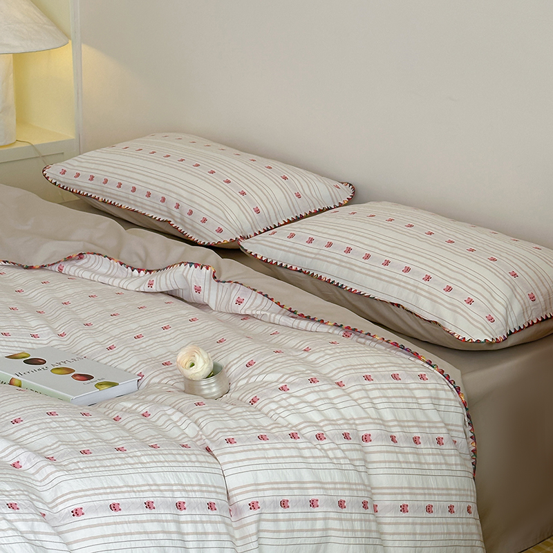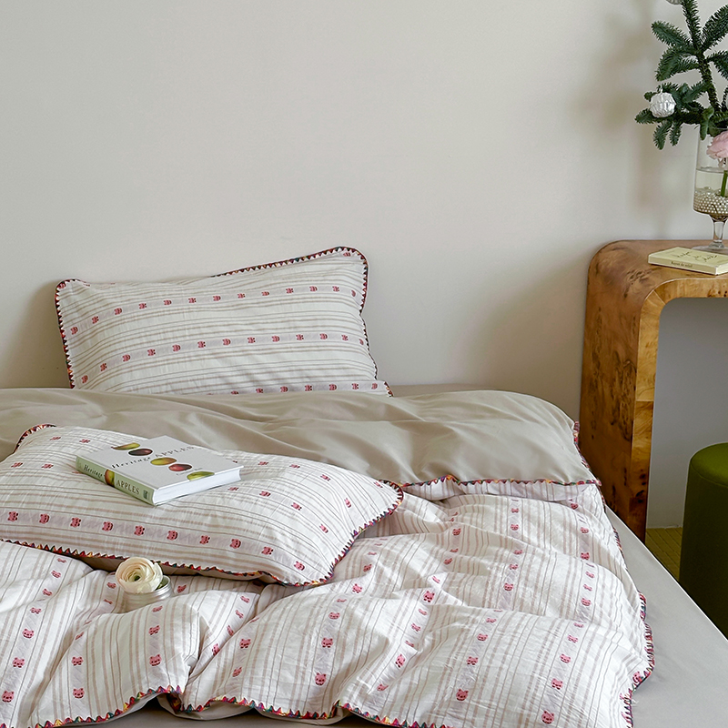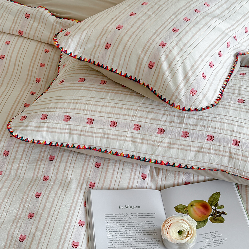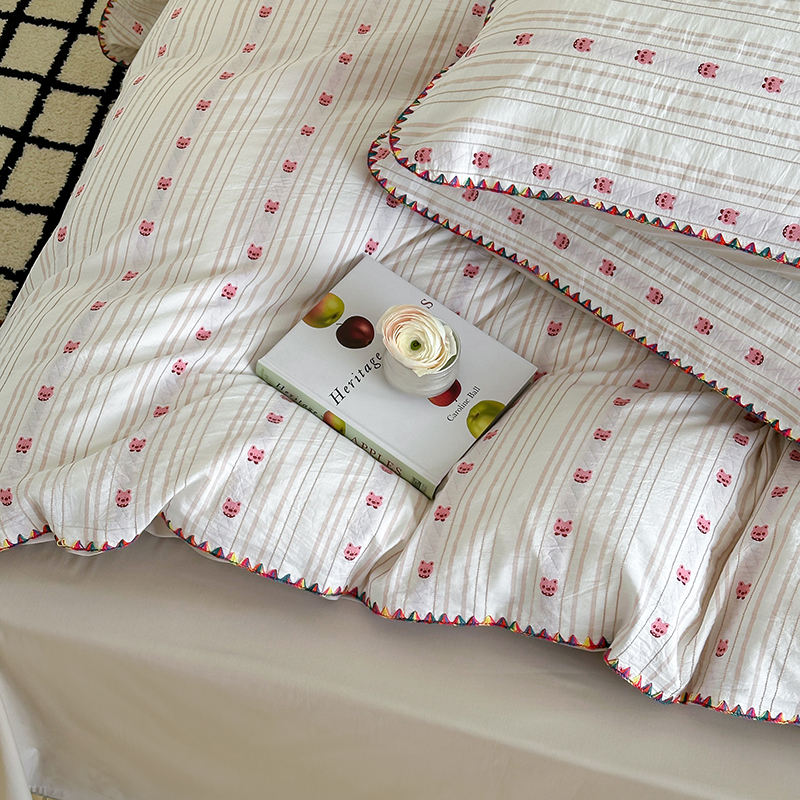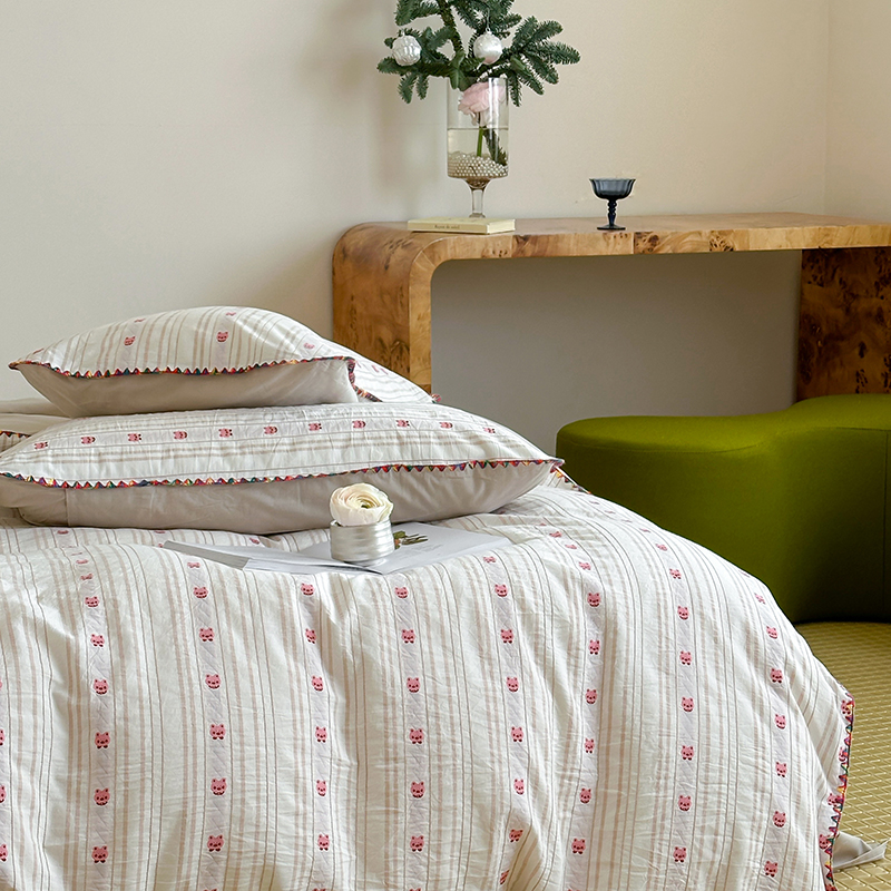 觅糖家纺 2025新款色织提花贝壳边三角针系列四件套 粉色猪猪