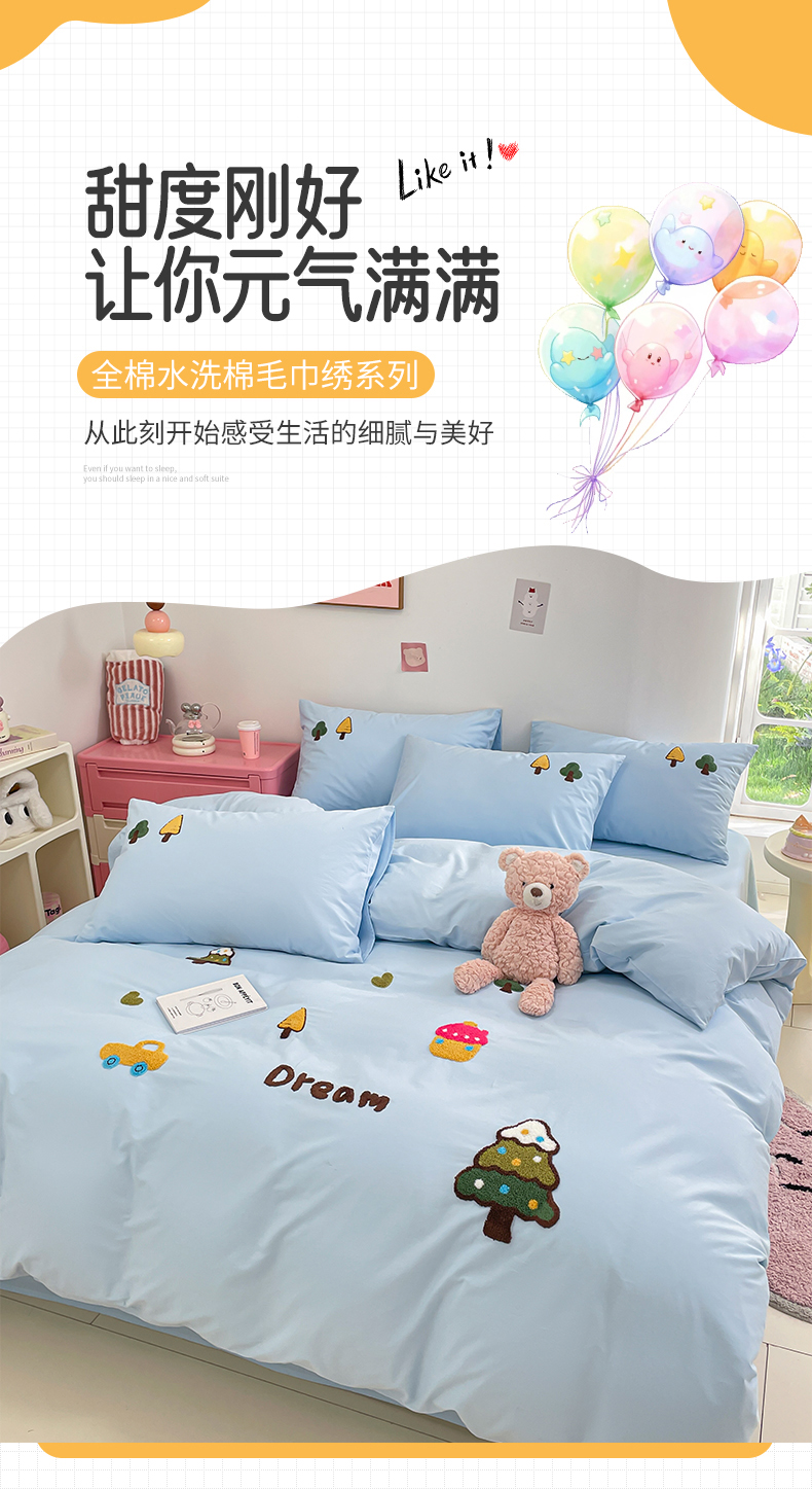 (总)买家秀热款花型不断货 母婴级A类ins风水洗棉四件套水洗棉毛巾绣四件套水洗棉床笠四件套提花绣花四件套,恐龙宝贝,花朵兔兔,面包小狗,奶油小甜甜,奶油芝士,兔伙伴,樱桃兔,优雅