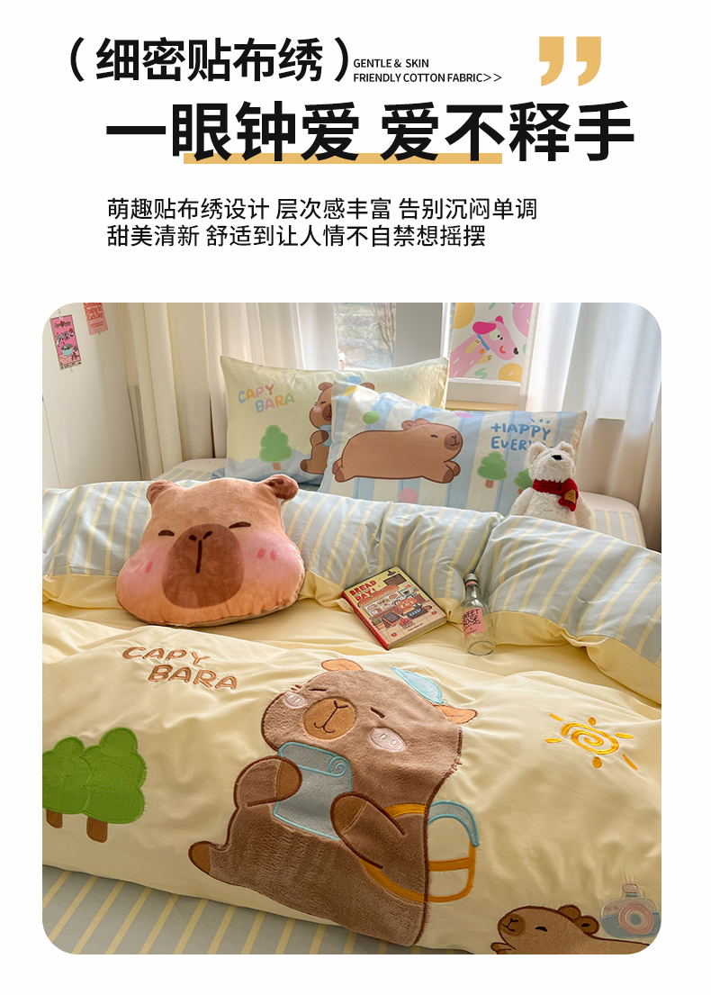 优彩 2025新款数码印花贴布绣全棉四件套 春田小熊
